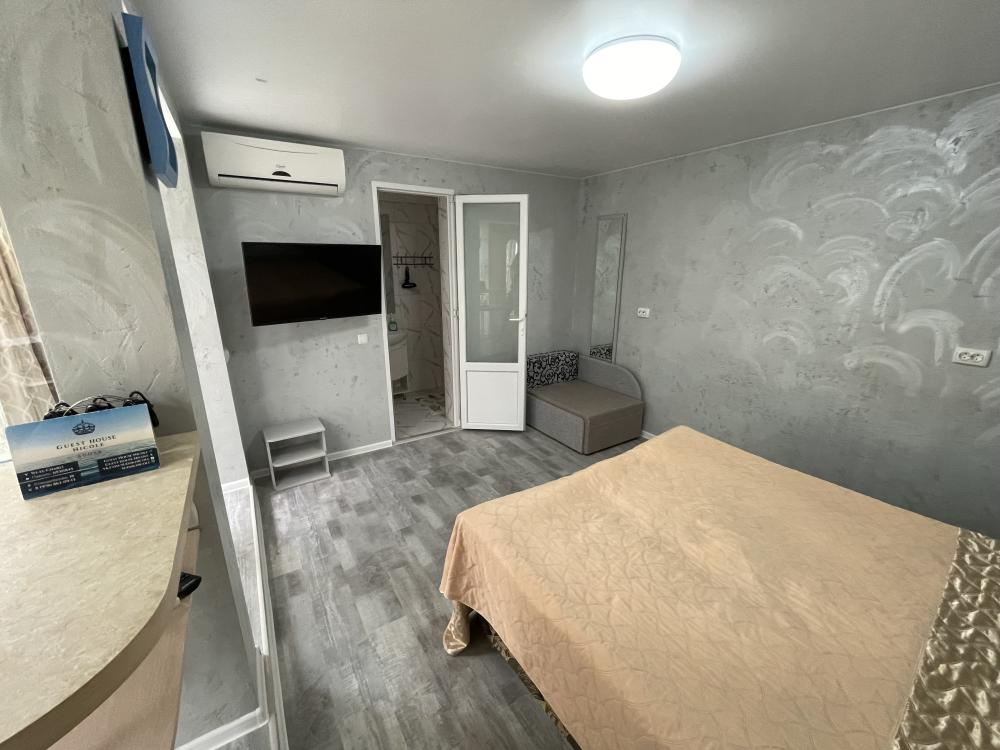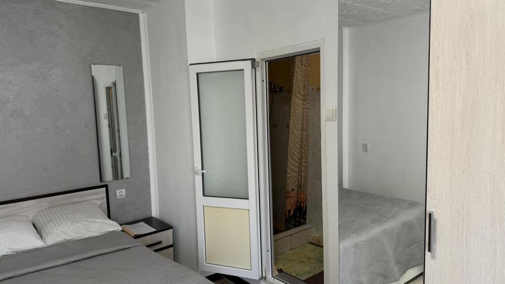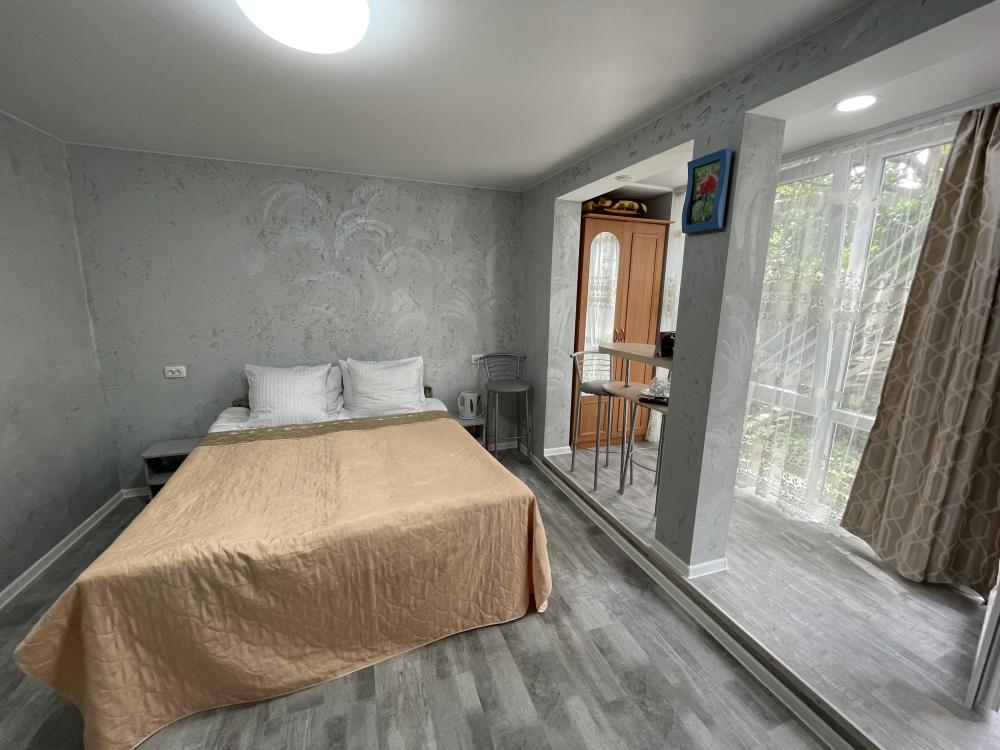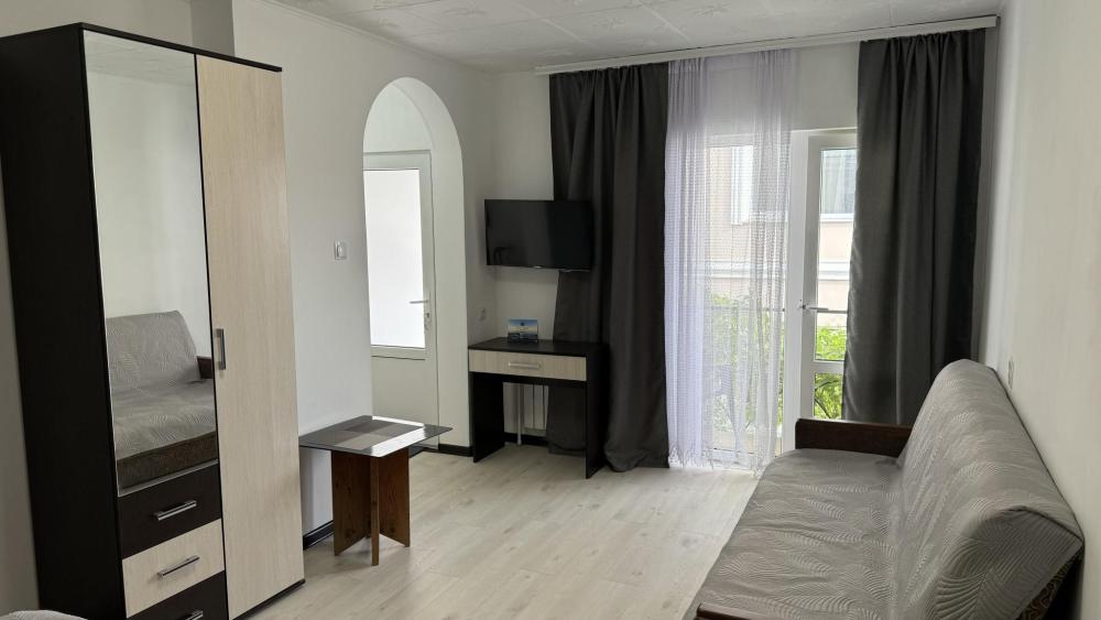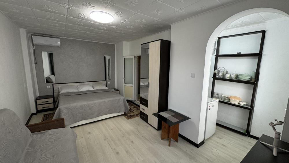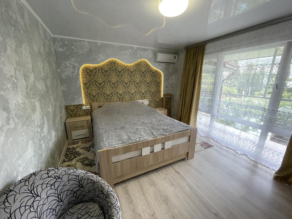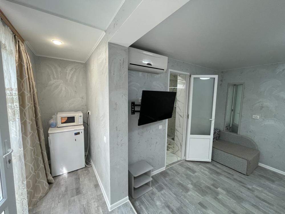 Услуги и удобства: 1 двуспальная, телевизор, холодильник, кондиционер, столик, электрический чайник, белье, полотенца, шкаф, тумба, дополнительные одеяла, душ и туалет в номере. Мебель на улице, общая кухня(на два номера), обеденная зона на улице, помещение полностью находится на втором этаже.