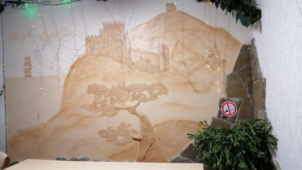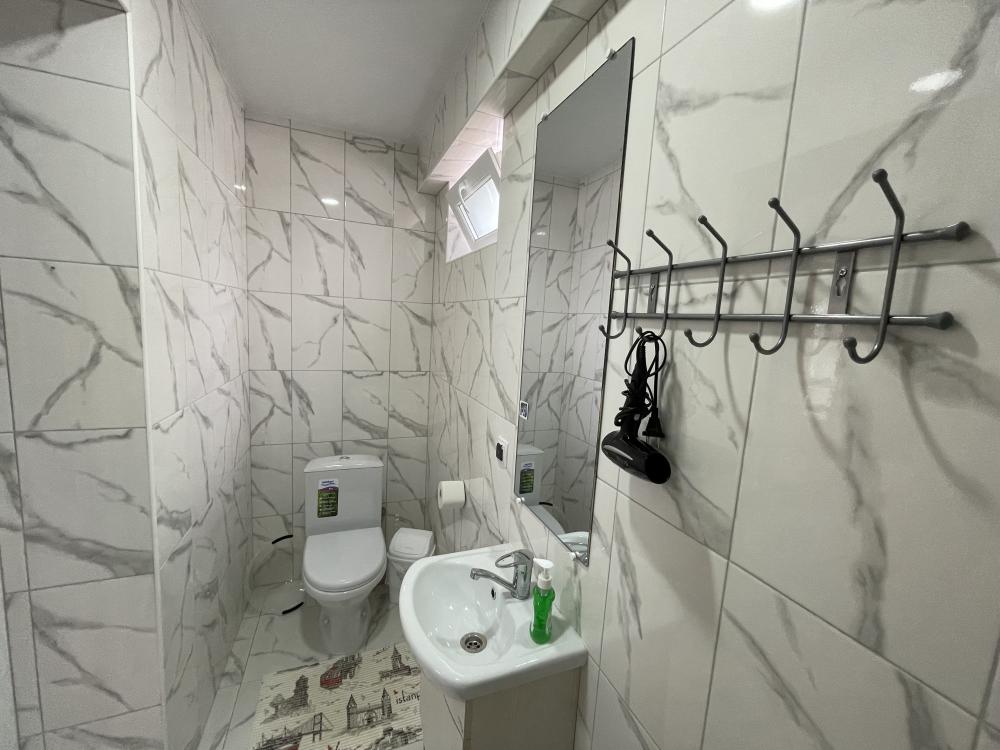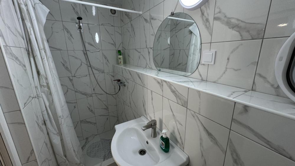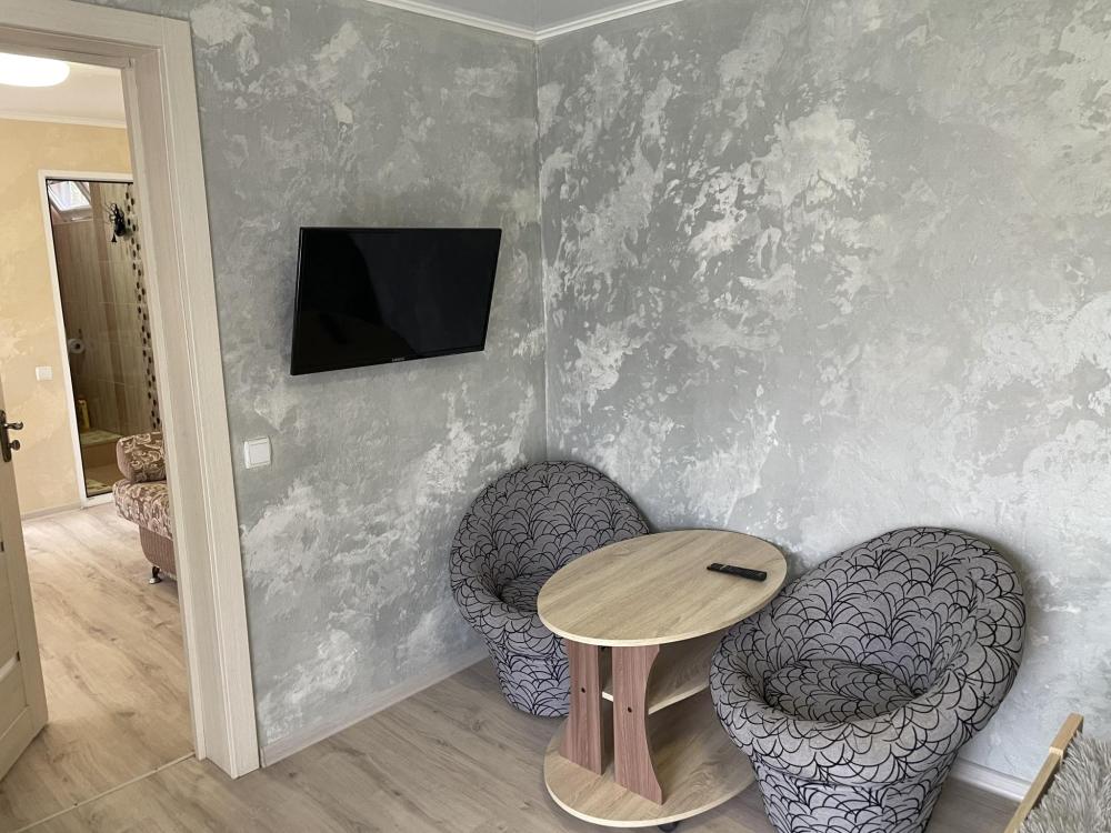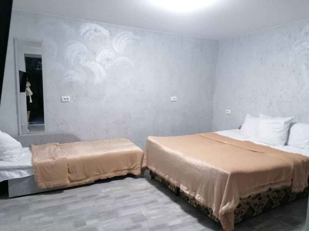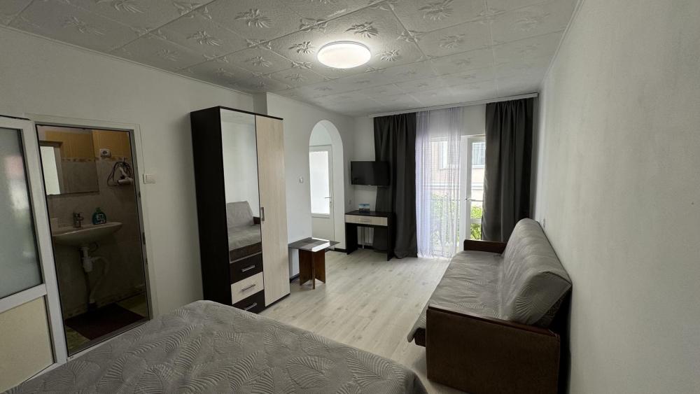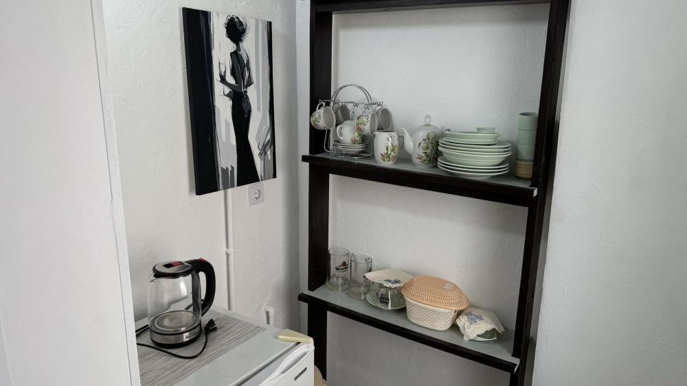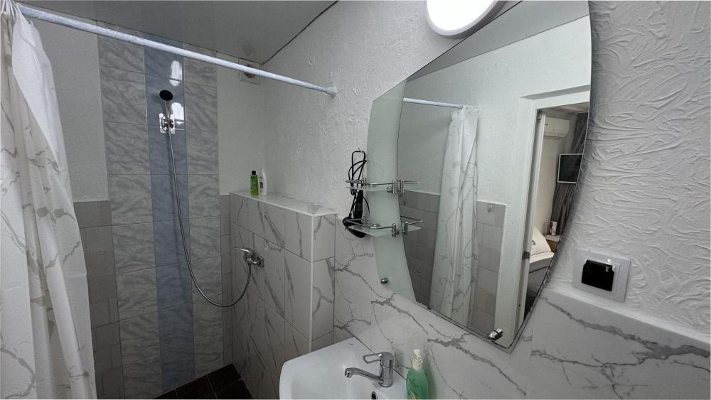 Услуги и удобства: 1 двуспальная, телевизор, холодильник, кондиционер, столик, электрический чайник, белье, полотенца, шкаф, тумба, дополнительные одеяла, душ и туалет в номере. Мебель на улице, общая кухня(на два номера), обеденная зона на улице, помещение полностью находится на втором этаже.