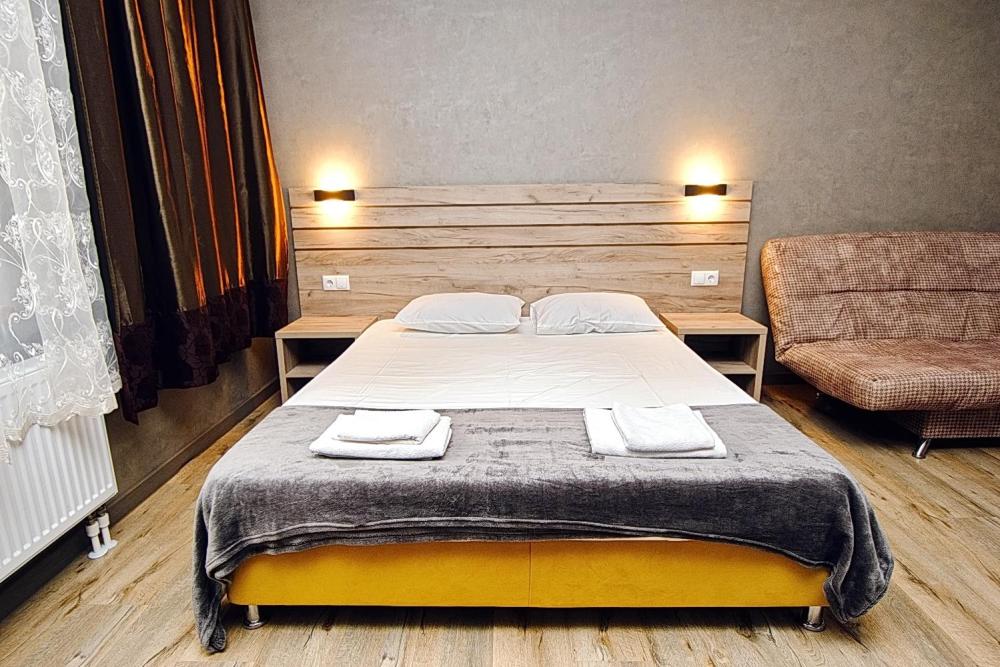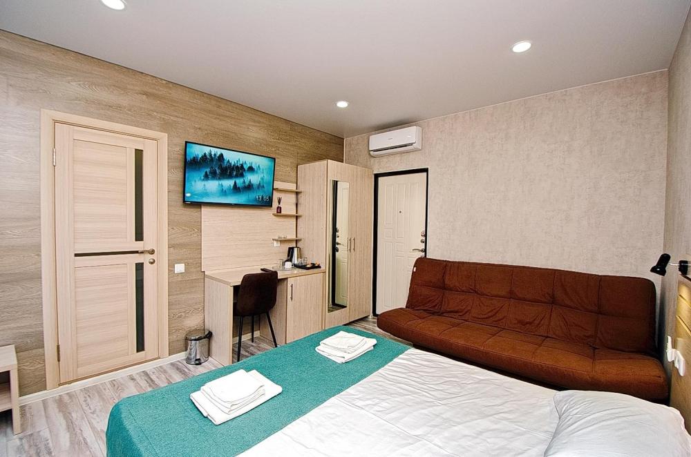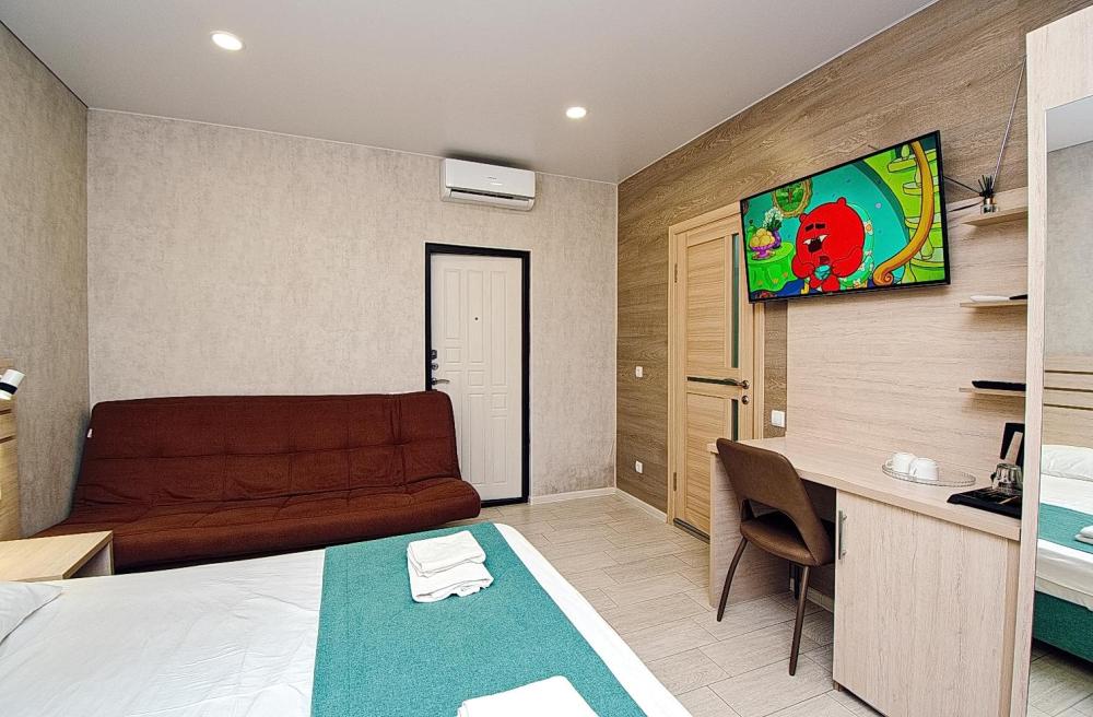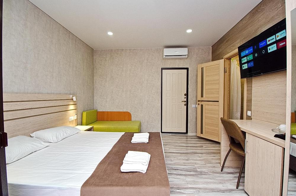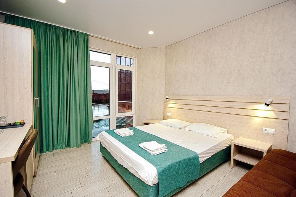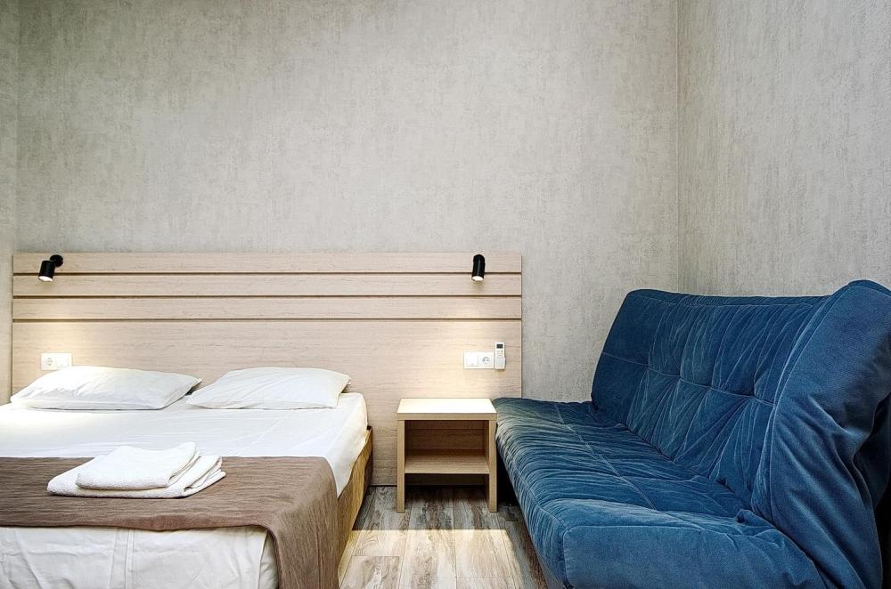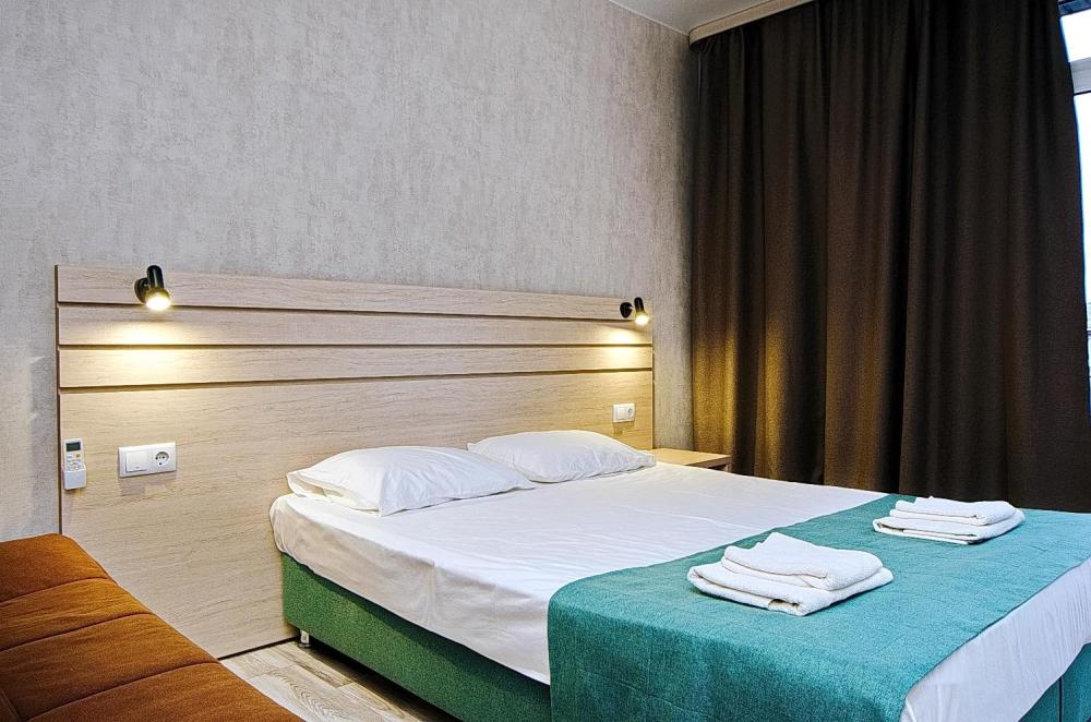 Четырехместный номер стандарт площадью 18 кв.м. оснащенный всем необходимым для комфортного отдыха гостей. В номере: двуспальная кровать, двуспальный диван, телевизор, сплит система, холодильник, тумбочки, шифоньер, полотенца, душ и санузел.