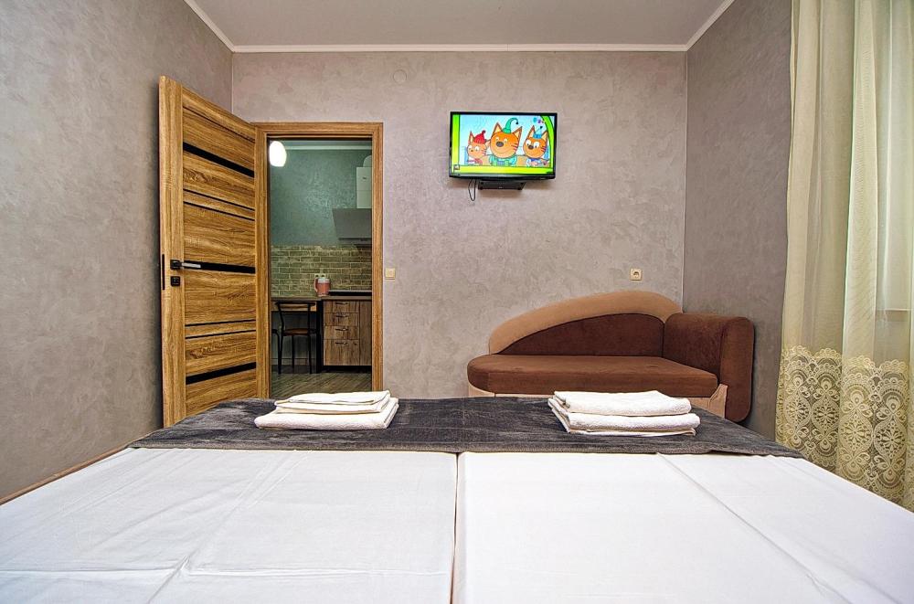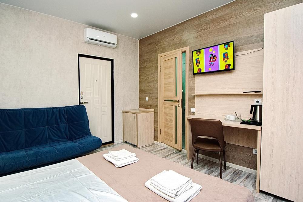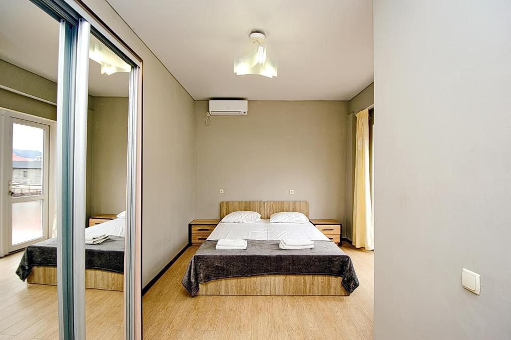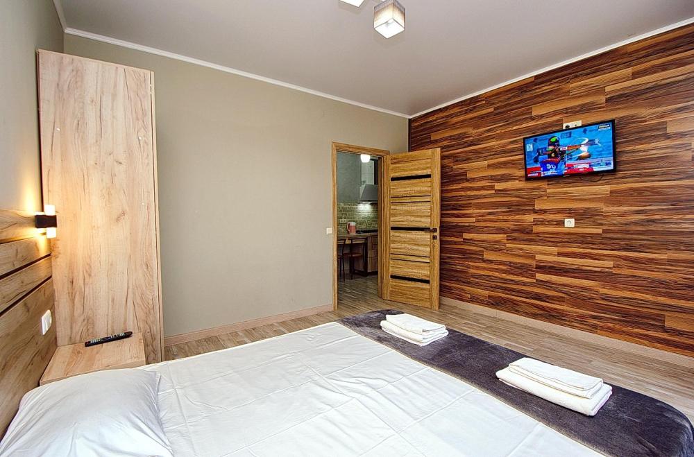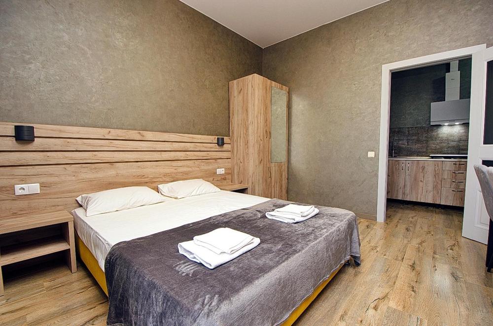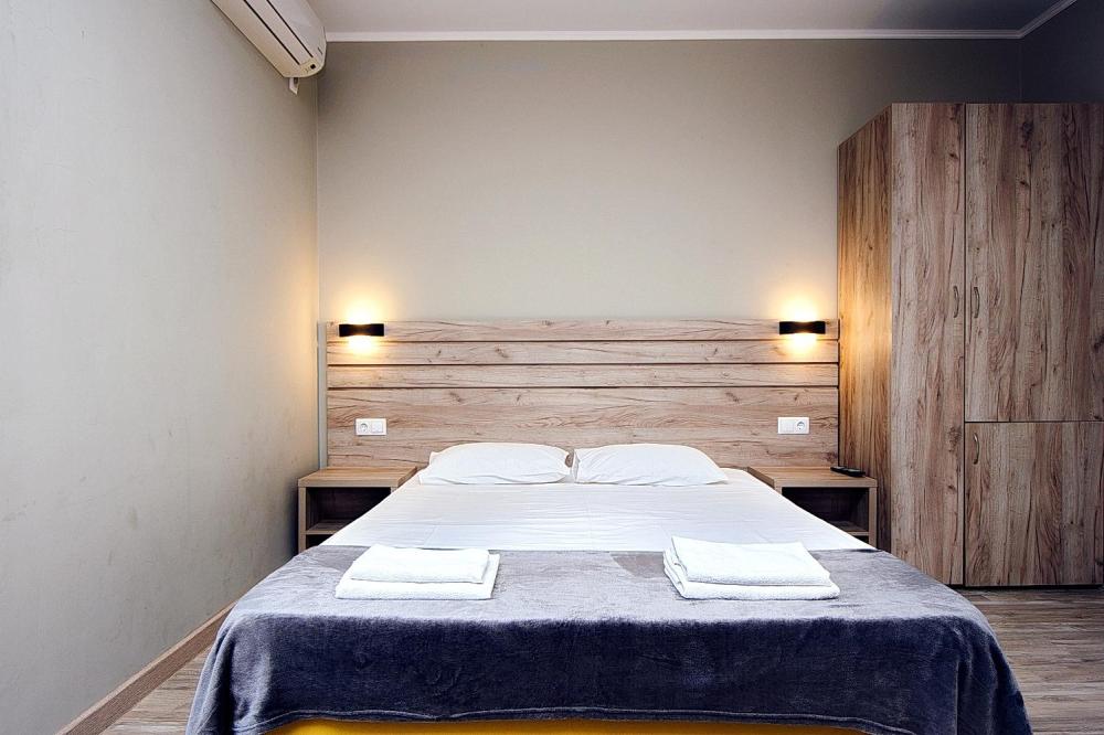 Двухкомнатные апартаменты площадью 45 кв.м. для размещения до 5-ти гостей. Для комфортного проживания гостей апартаменты оснащены всем необходимым: двуспальная кровать, односпальная кровать, двуспальный диван, телевизор, сплит система, холодильник, тумбочки, шифоньер, столик , полотенца, душ и санузел в номере, фен.