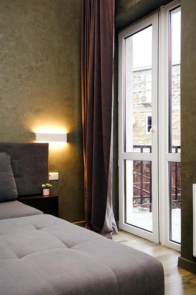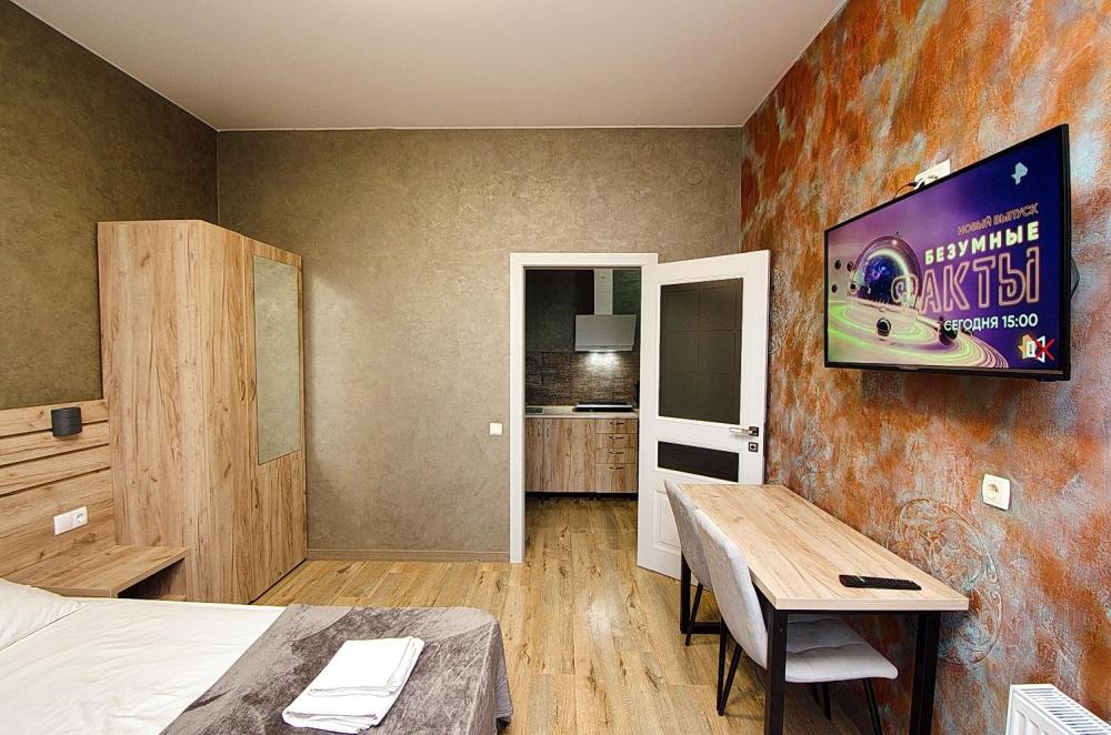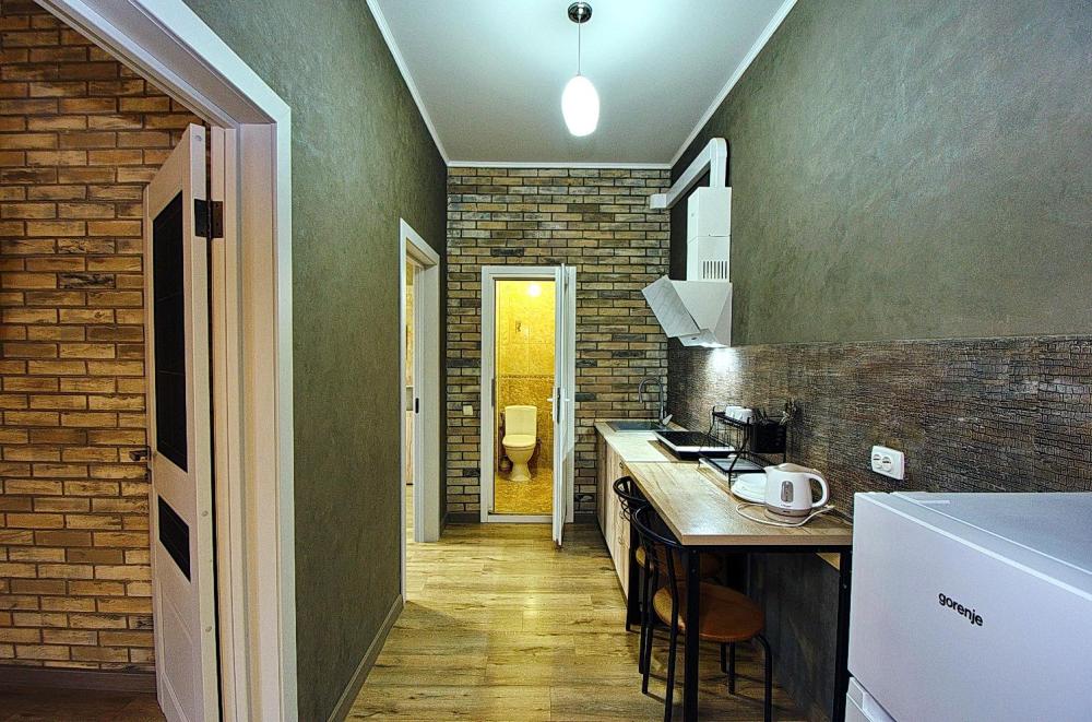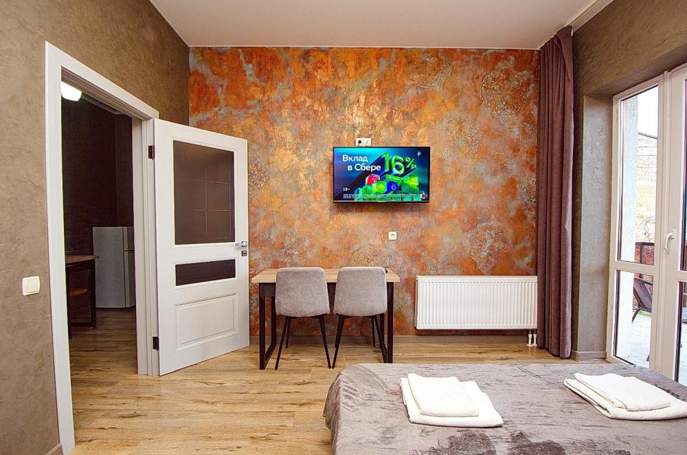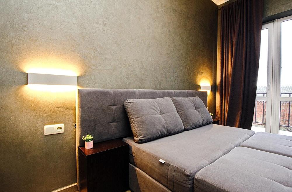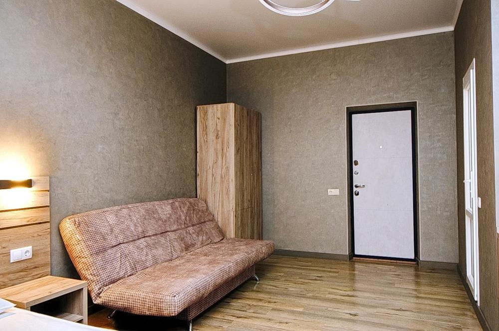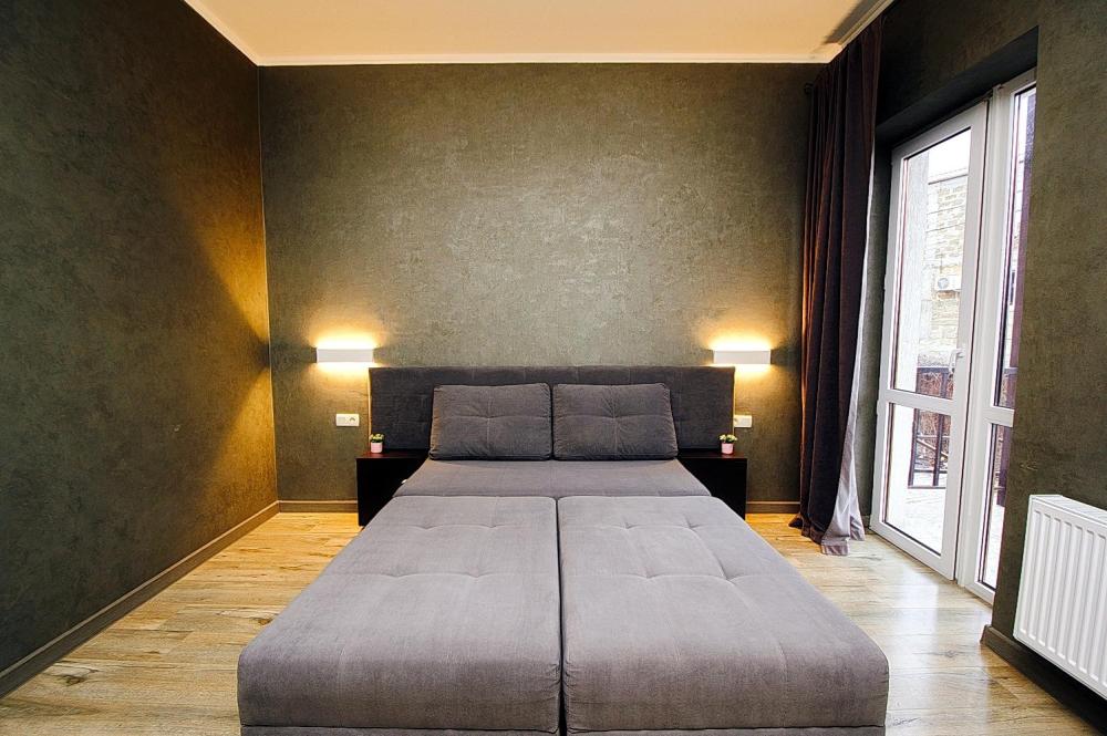 Двухкомнатные апартаменты площадью 45 кв.м. для размещения до 5-ти гостей. Для комфортного проживания гостей апартаменты оснащены всем необходимым: двуспальная кровать, односпальная кровать, двуспальный диван, телевизор, сплит система, холодильник, тумбочки, шифоньер, столик , полотенца, душ и санузел в номере, фен.
