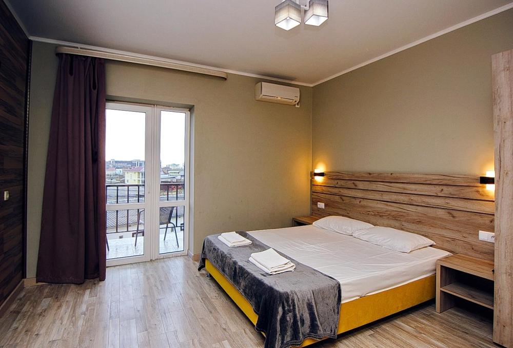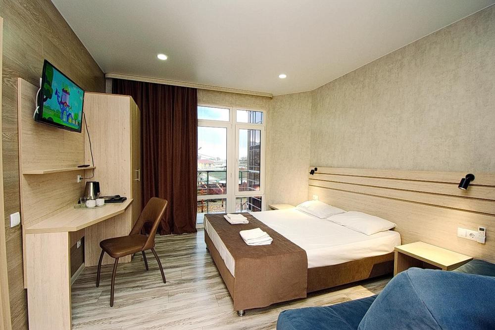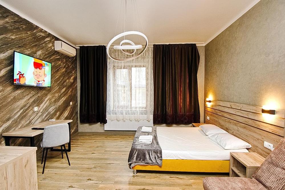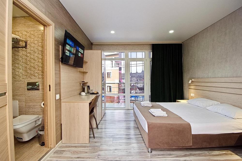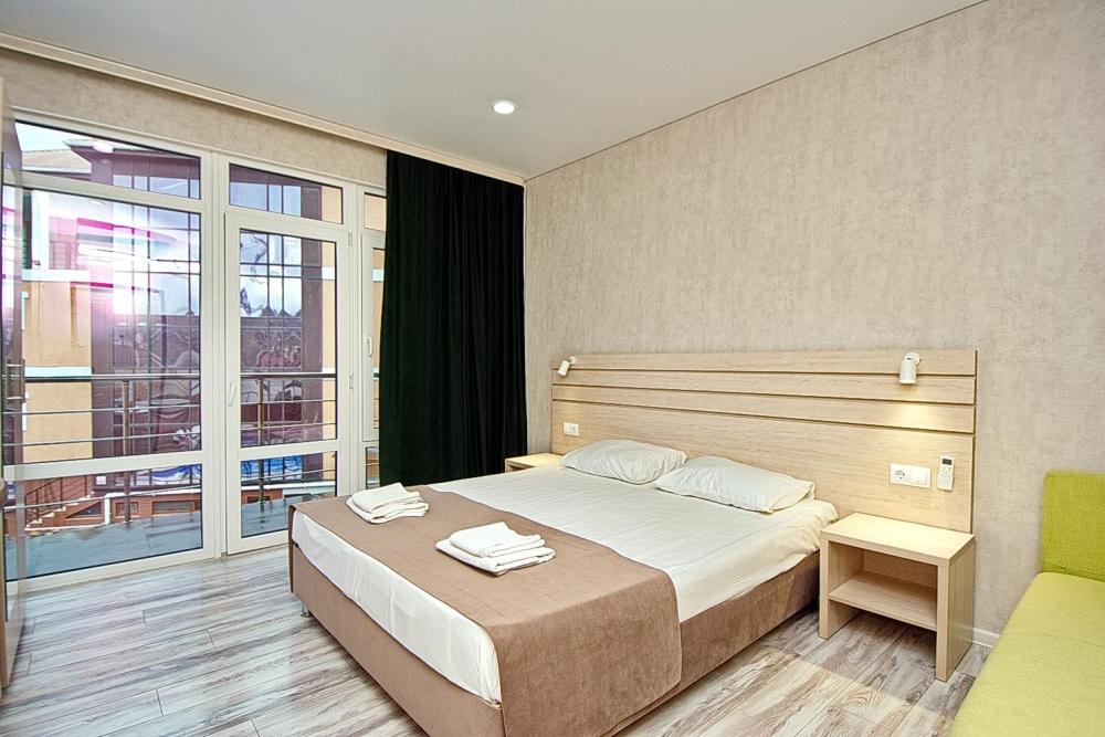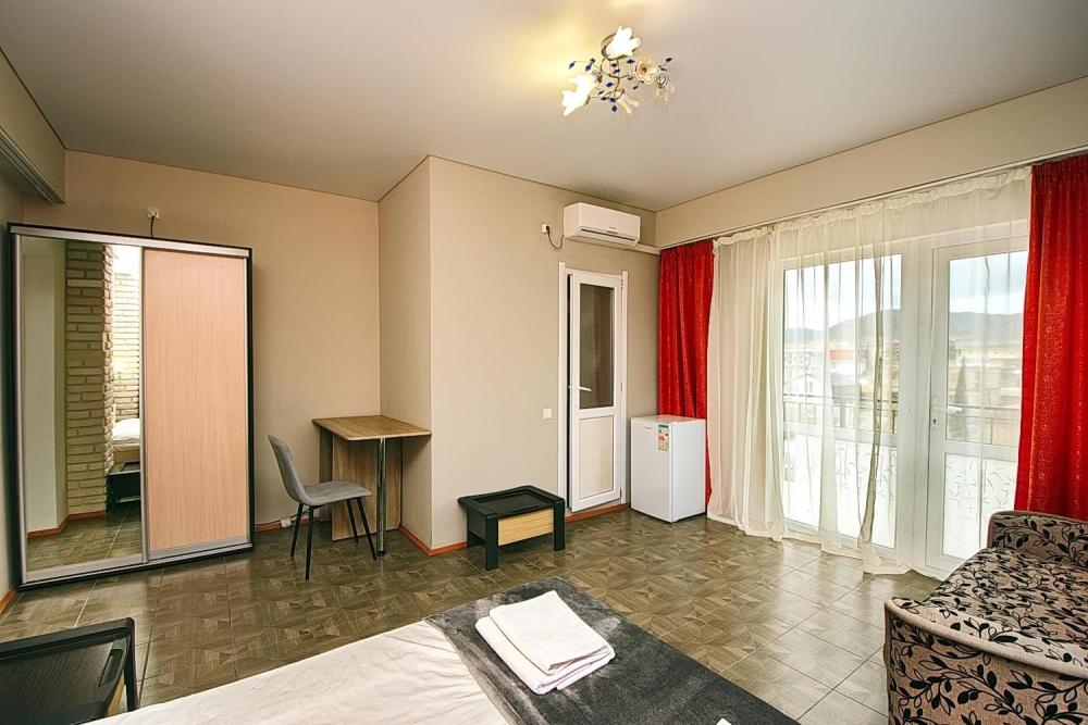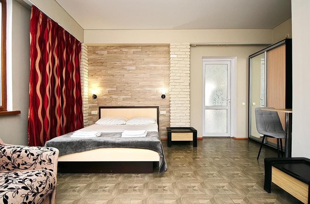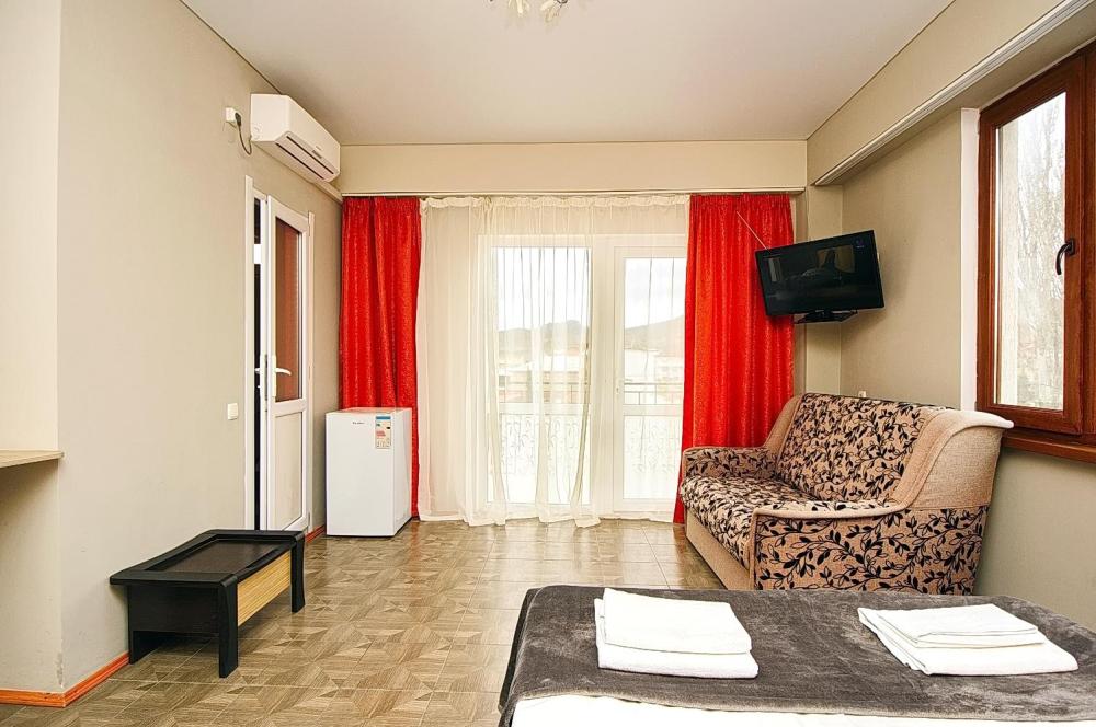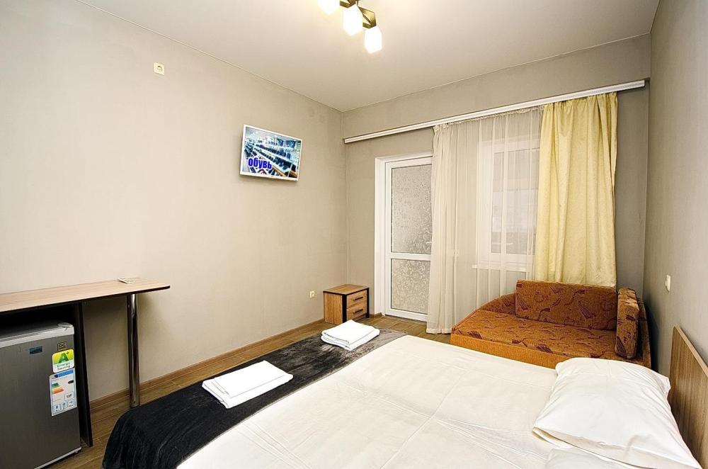 Четырехместный номер люкс площадью 20 кв.м. оснащенный всем необходимым для комфортного отдыха гостей. В номере: двуспальная кровать, двуспальный диван, телевизор, сплит система, холодильник, тумбочки, шифоньер, столик, полотенца, душ и санузел в номере, фен, чайник.