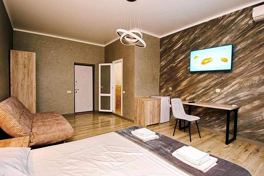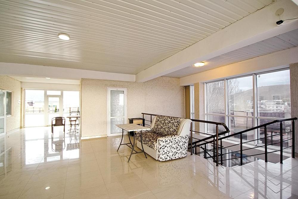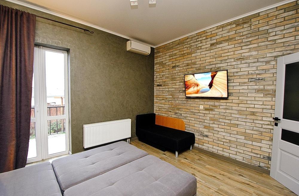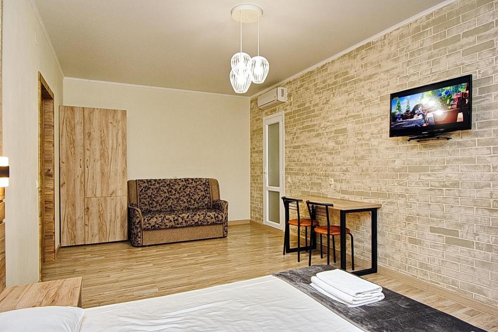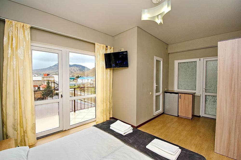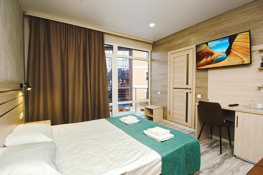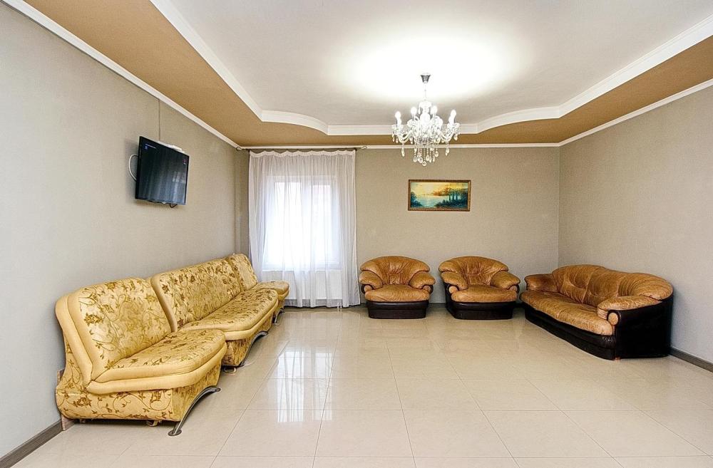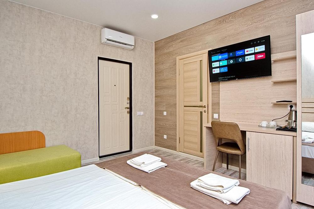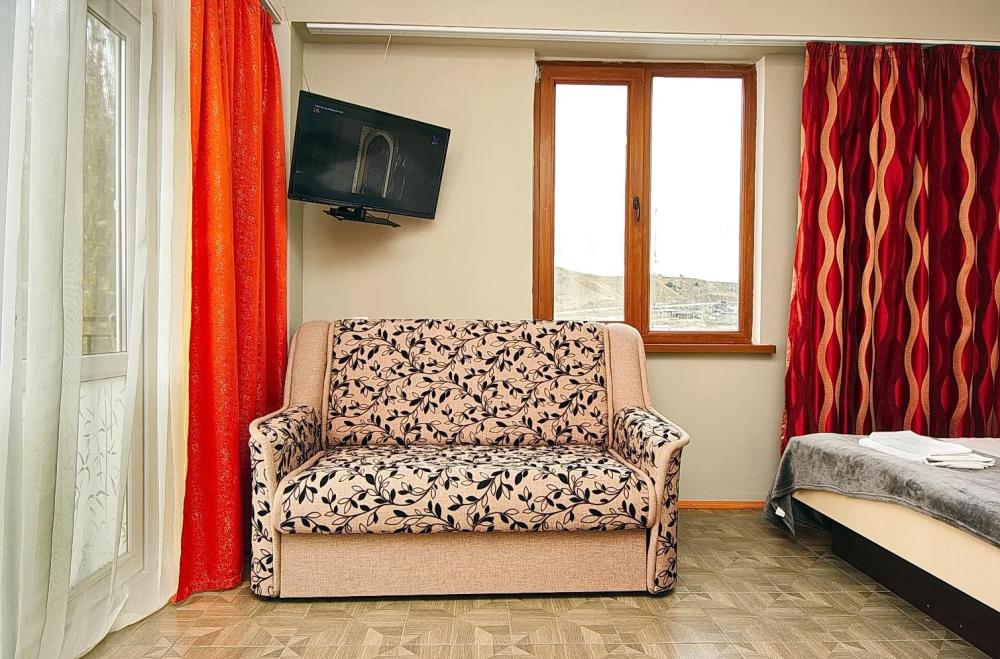 Четырехместный номер люкс площадью 20 кв.м. оснащенный всем необходимым для комфортного отдыха гостей. В номере: двуспальная кровать, двуспальный диван, телевизор, сплит система, холодильник, тумбочки, шифоньер, столик, полотенца, душ и санузел в номере, фен, чайник.