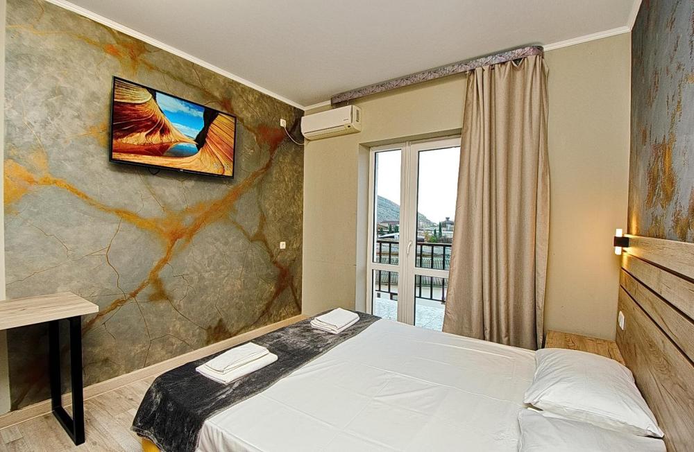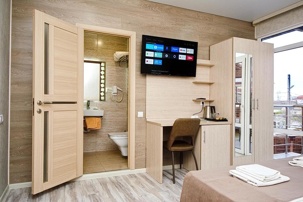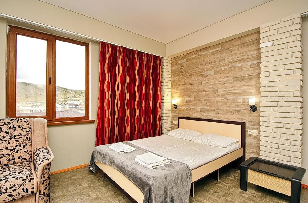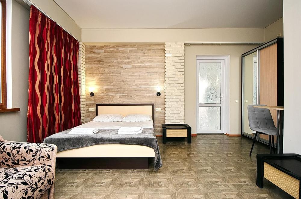 Двухместный номер люкс площадью 20 кв.м. оснащенный всем необходимым для комфортного отдыха гостей. В номере: двуспальная кровать, телевизор, сплит система, холодильник, тумбочки, шифоньер, столик, полотенца, душ и санузел в номере, фен, чайник.