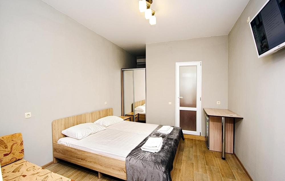 Трехместный номер стандарт площадью 15 кв.м. оснащенный всем необходимым для комфортного отдыха гостей. В номере: двуспальная кровать, односпальная кровать, телевизор, сплит система, холодильник, тумбочки, шифоньер, полотенца, душ и санузел.