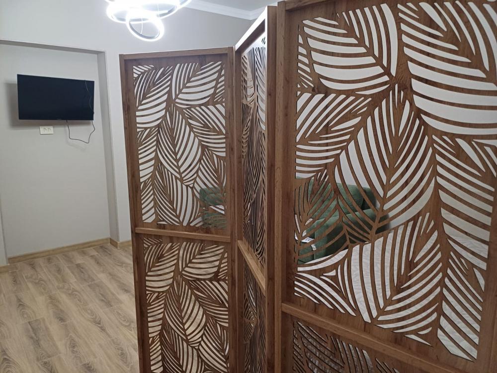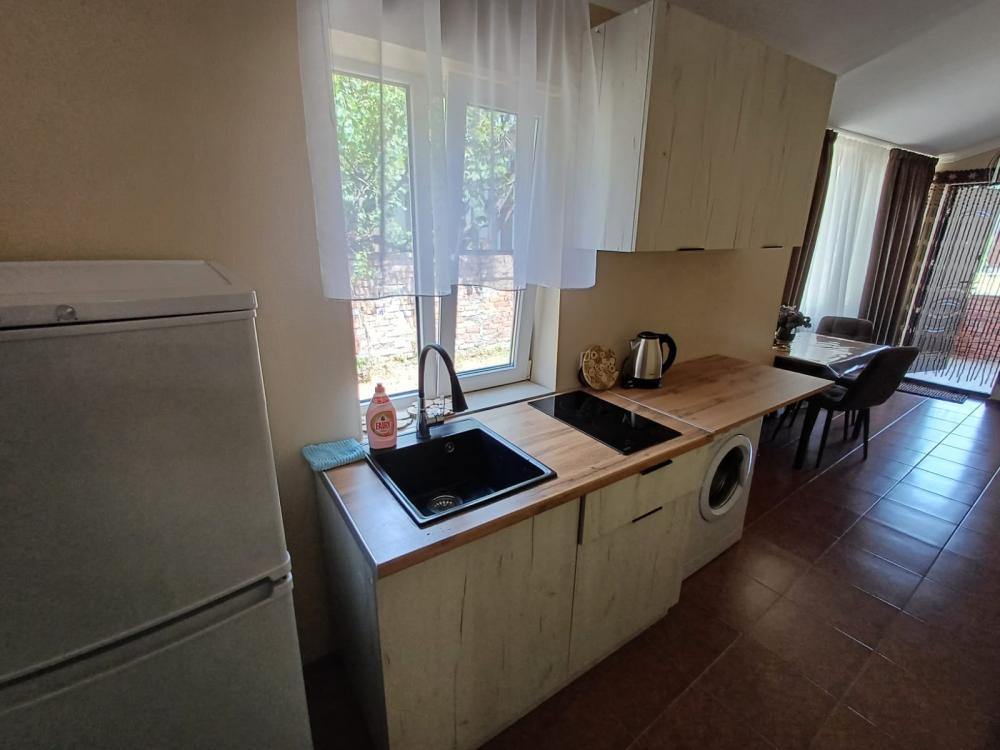 В домике просторная комната с современным ремонтом. Оборудованная кухня (холодильник, варочная панель, микроволновая печь, электрочайник, посуда). Уютный балкон. Парковка рядом с домом. Тёплый пол. Кондиционер. WI-FI, Телевизор. Стиральная машинка. Гладильная доска, утюг. Постельное белье, полотенца.