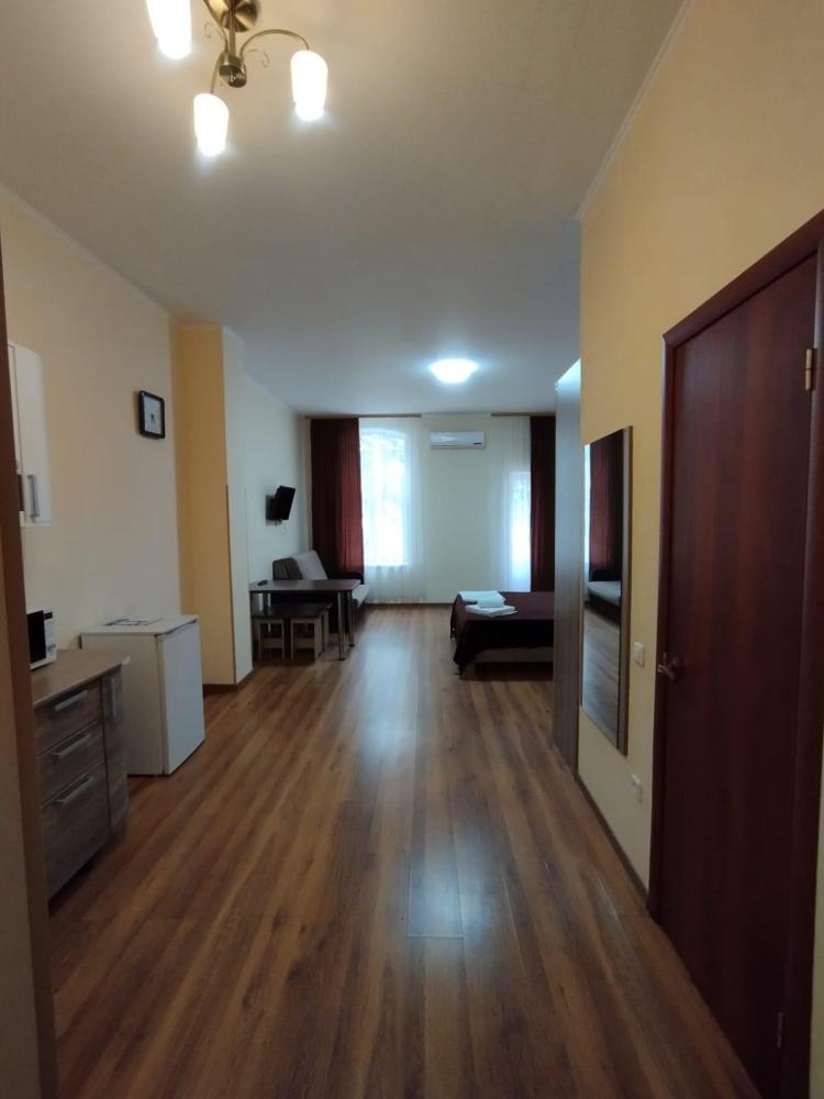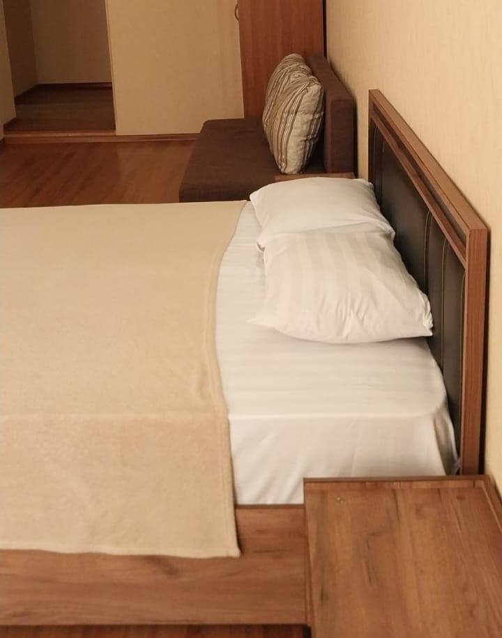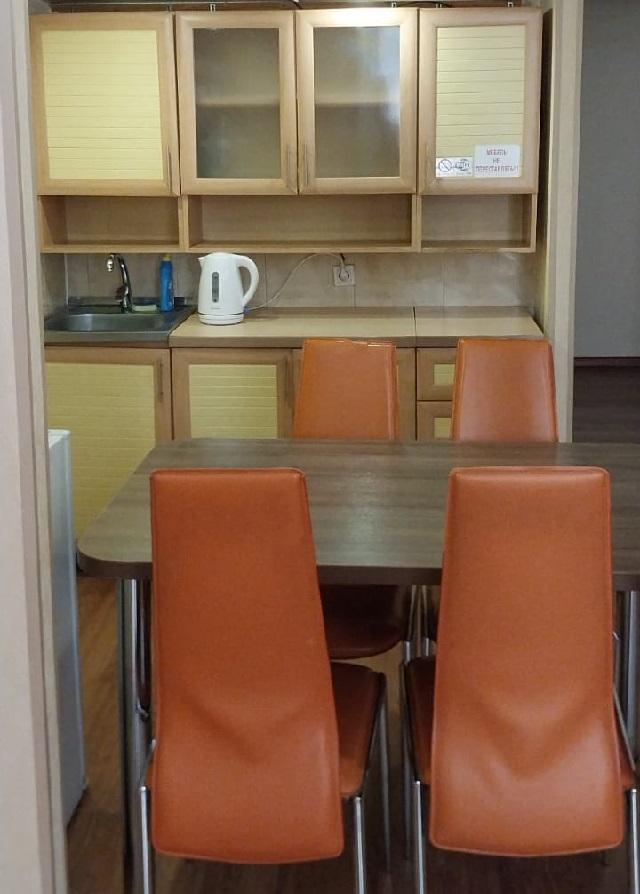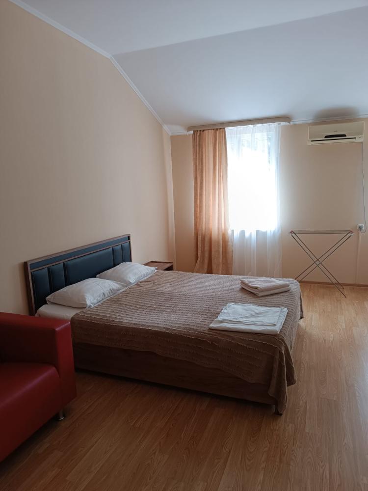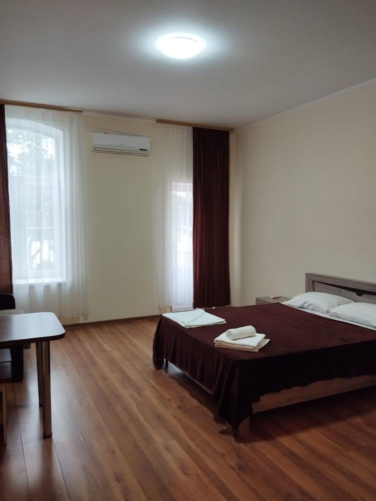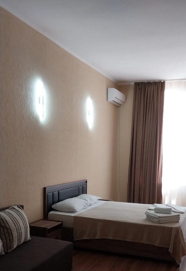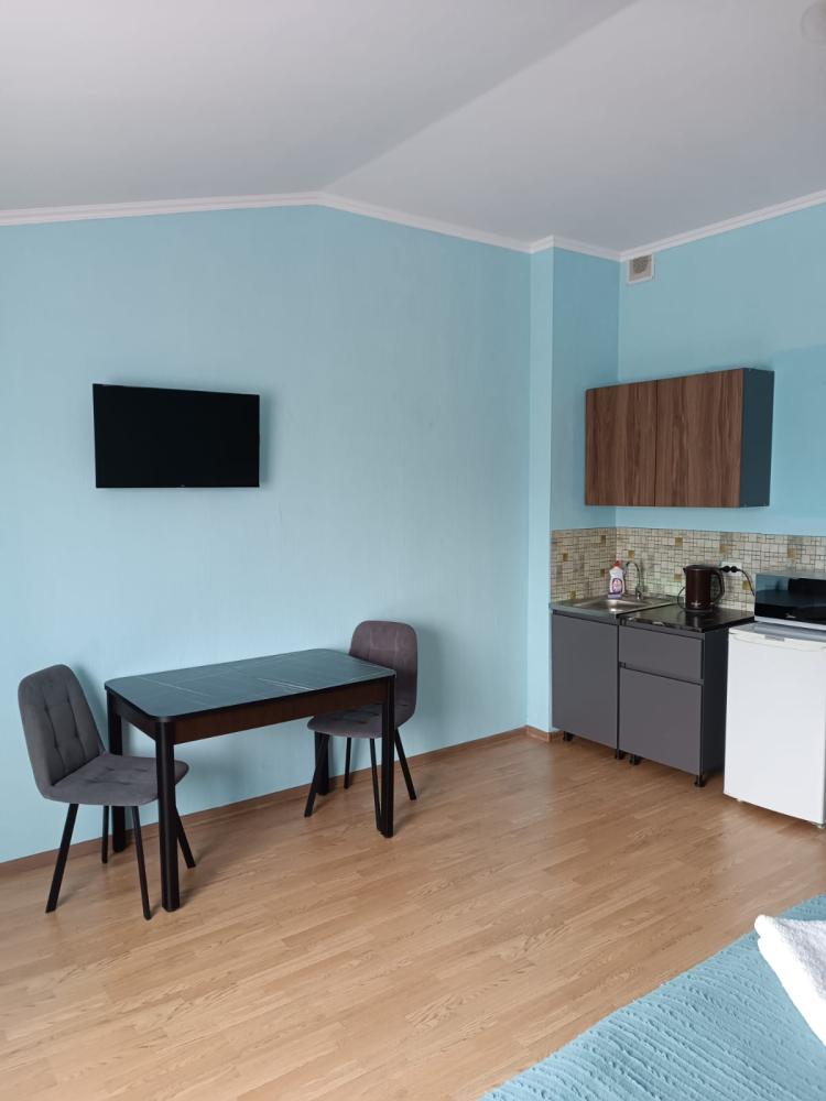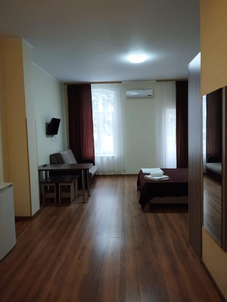 В номере стол, стулья, шкаф, прикроватные тумбочки, вешалка, зеркало, кухонный гарнитур, обеденная зона. Удобства: сплит-система, холодильник, телевизор, Wi-Fi интернет, СВЧ, эл. чайник, посуда, фен