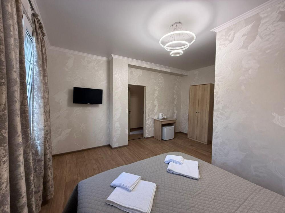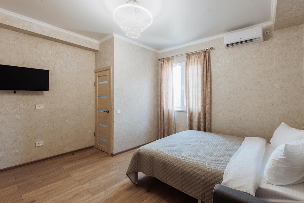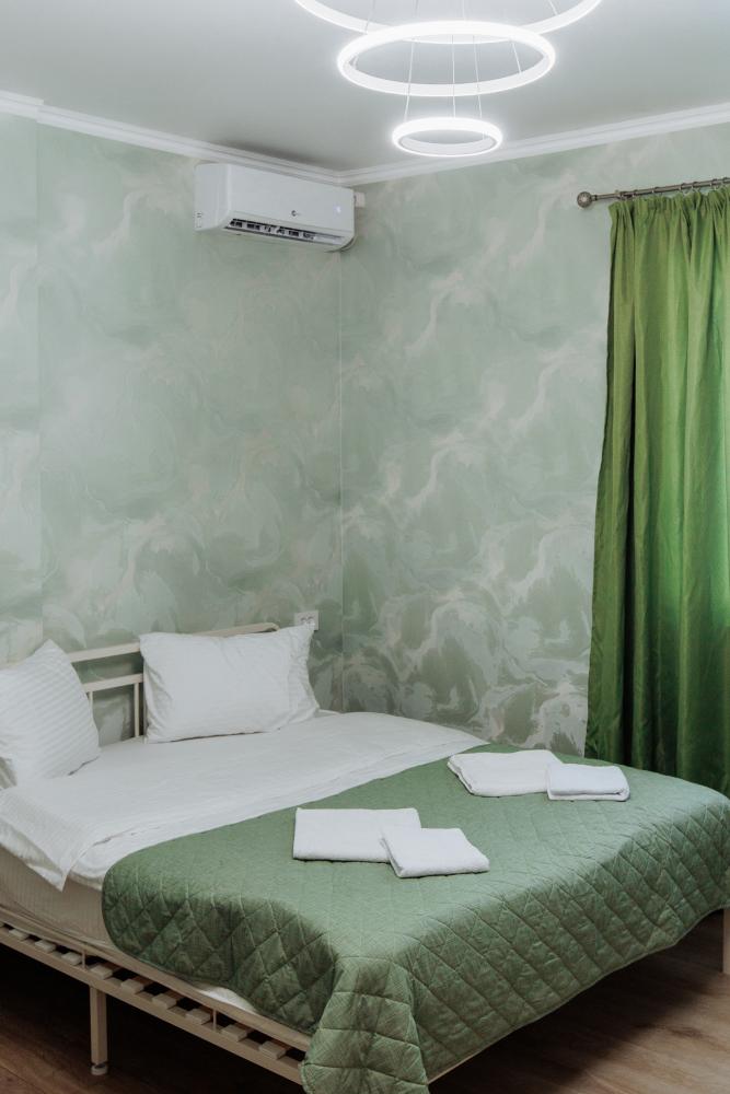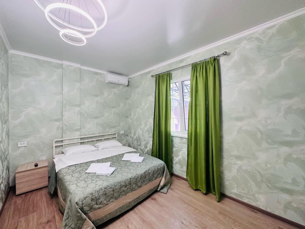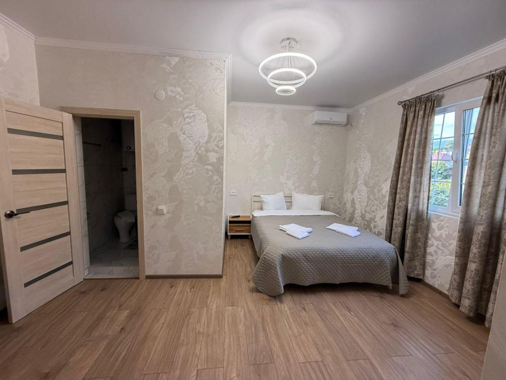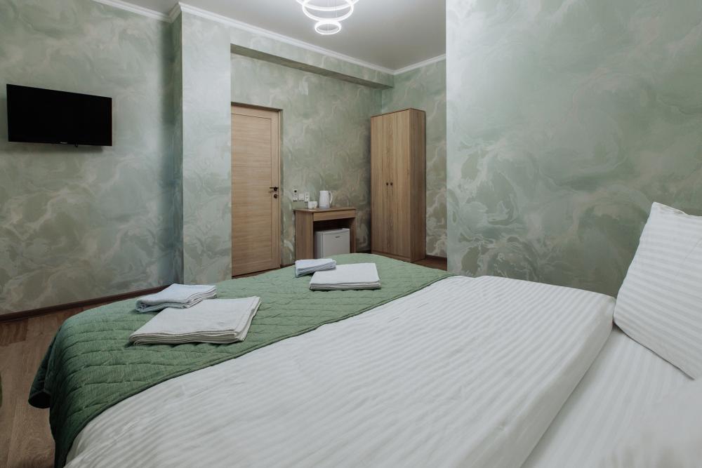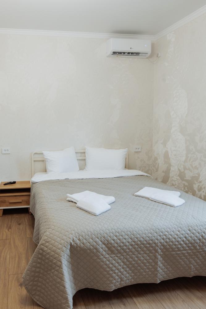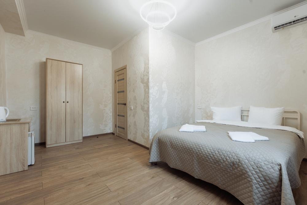 Стандарт с двуспальной кроватью Площадь номера составляет 18 кв.м. Шкаф для хранения вещей Бесплатный Wi-Fi. Кондиционер или система климат-контроля. Мини- холодильник. Электрический чайник и набор посуды. Ванная комната с душевой кабиной , туалетом и необходимыми туалетными принадлежностями. Фен для волос. Тапочки, банные принадлежности (щетка, зубная паста, жидкое мыло). Есть общий мангал, микроволновка, плита, кофеварка, мультиварка. Стирка, детская кроватка и игровой манеж - за доп. плату Объект находится под видеонаблюдением, подключена охранная система