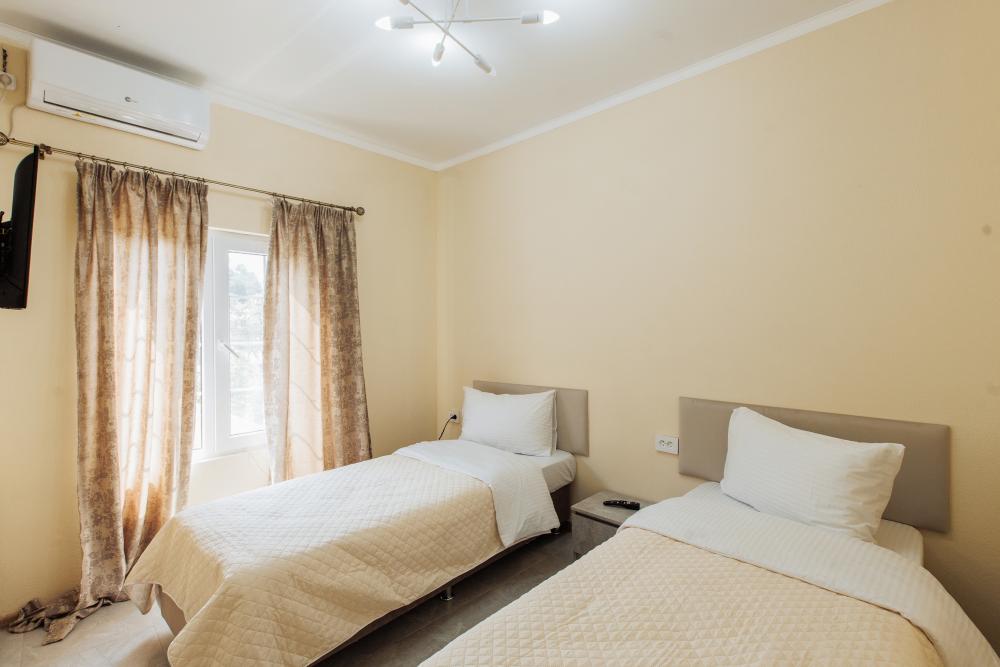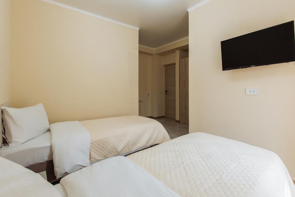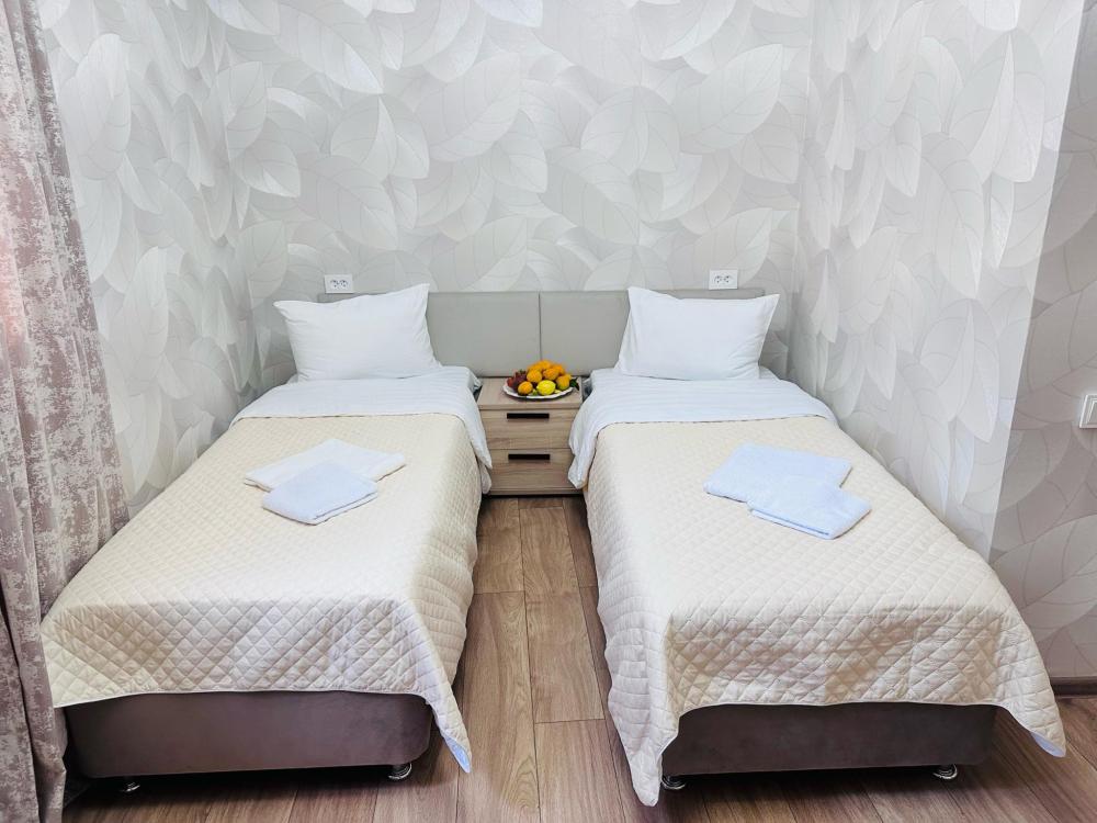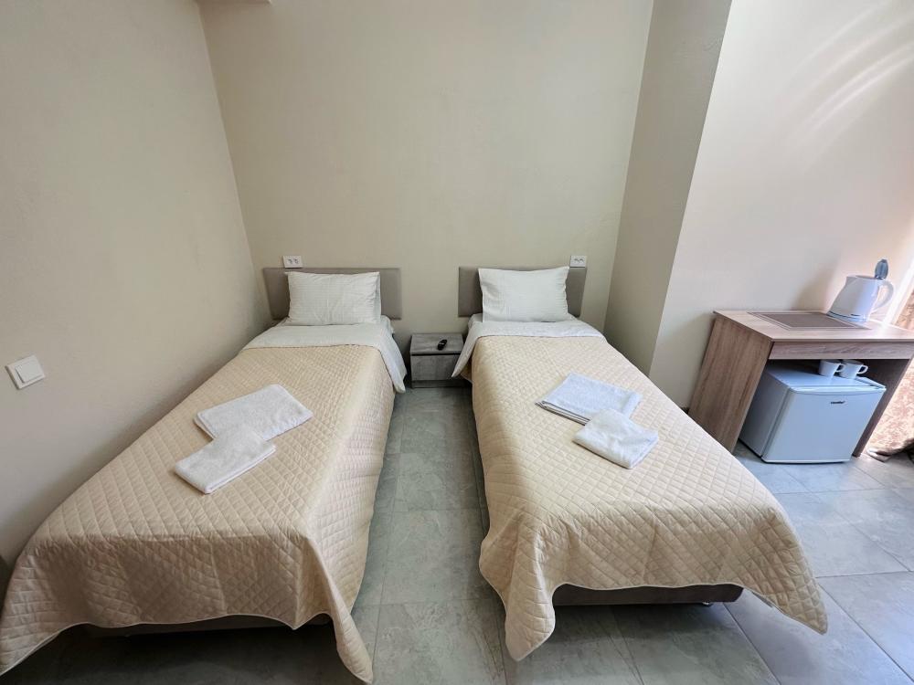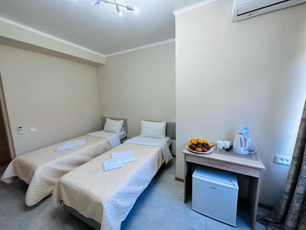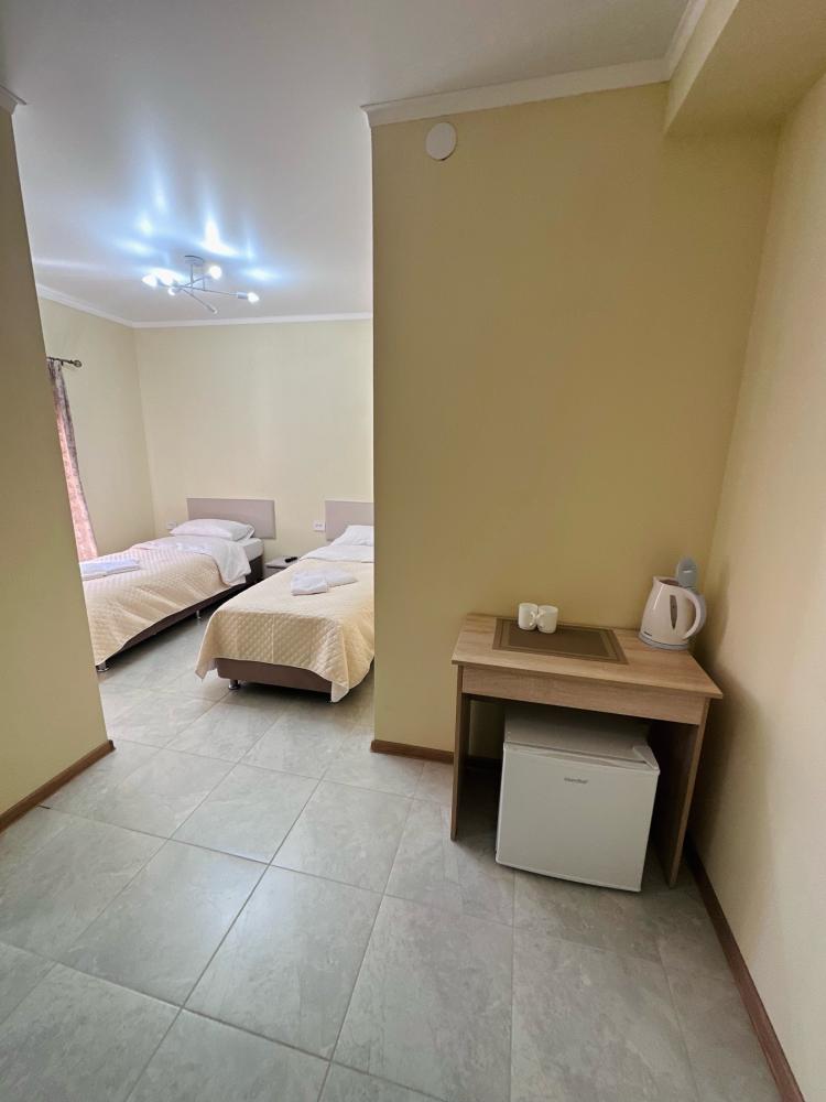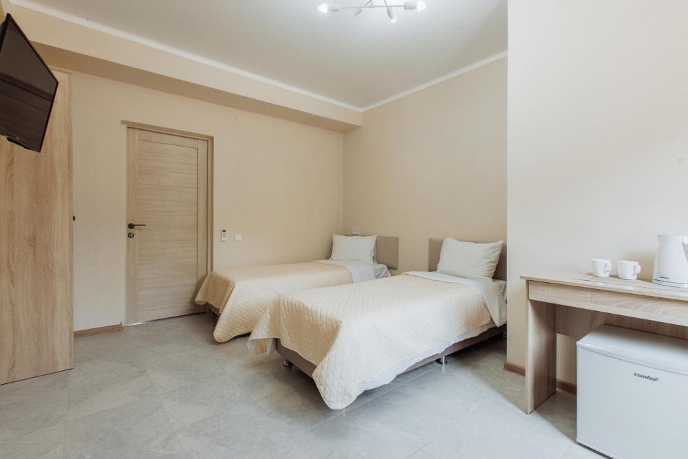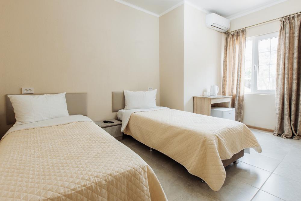 Стандарт с двумя односпальными кроватями Площадь номера составляет 18 кв.м. Шкаф для хранения вещей Бесплатный Wi-Fi. Кондиционер или система климат-контроля. Мини- холодильник. Электрический чайник и набор посуды. Ванная комната с душевой кабиной , туалетом и необходимыми туалетными принадлежностями. Фен для волос. Тапочки, банные принадлежности (щетка, зубная паста, жидкое мыло). Есть общий мангал, микроволновка, плита, кофеварка, мультиварка. Стирка, детская кроватка и игровой манеж - за доп. плату Объект находится под видеонаблюдением, подключена охранная система