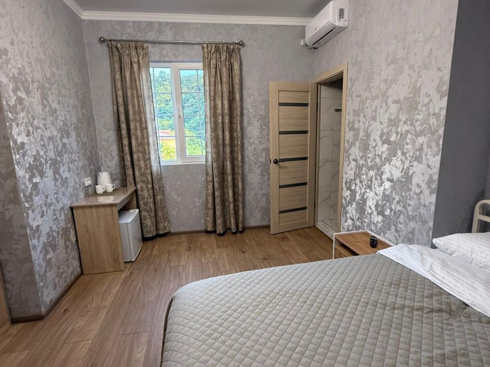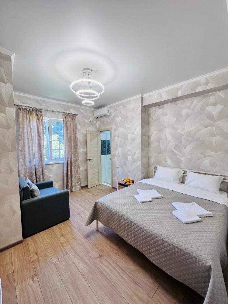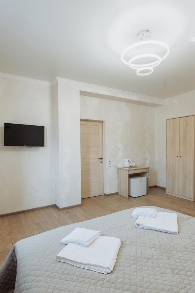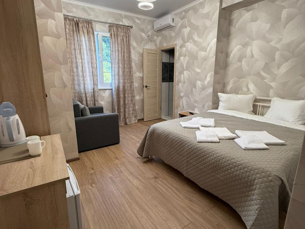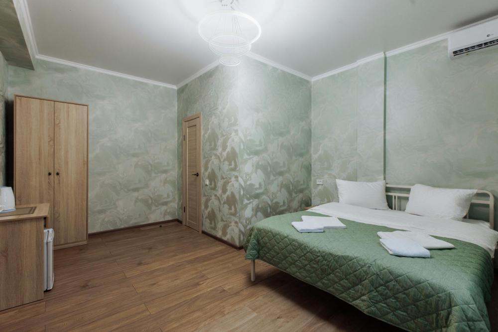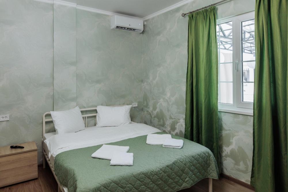 Двуспальная кровать + раскладной диванчик Площадь номера составляет 18 кв.м. Шкаф для хранения вещей Бесплатный Wi-Fi. Кондиционер или система климат-контроля. Мини- холодильник. Электрический чайник и набор посуды. Ванная комната с душевой кабиной , туалетом и необходимыми туалетными принадлежностями. Фен для волос. Тапочки, банные принадлежности (щетка, зубная паста, жидкое мыло). Есть общий мангал, микроволновка, плита, кофеварка, мультиварка. Стирка, детская кроватка и игровой манеж - за доп. плату Объект находится под видеонаблюдением, подключена охранная система