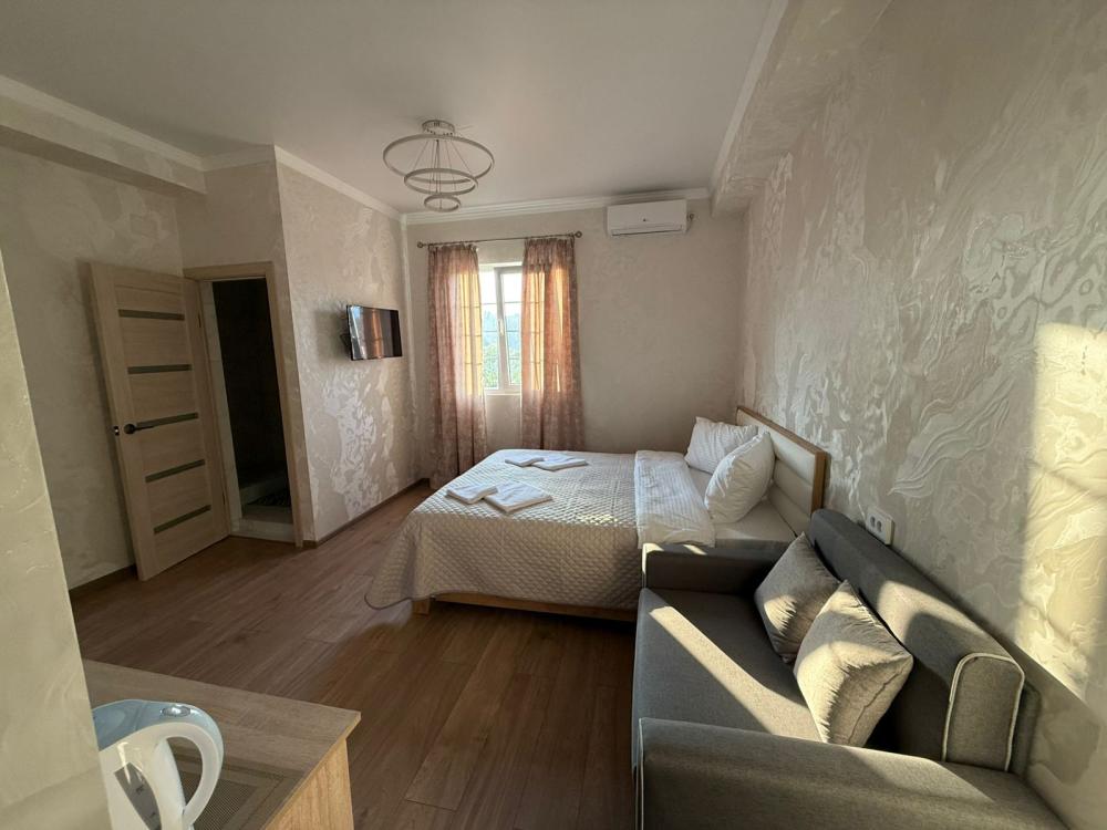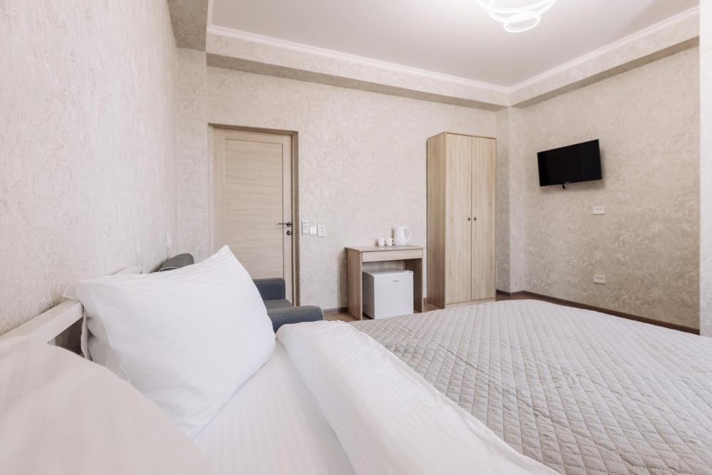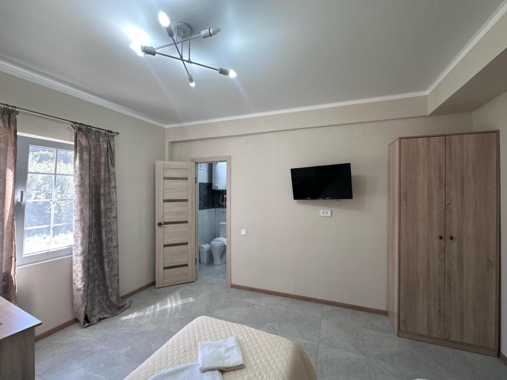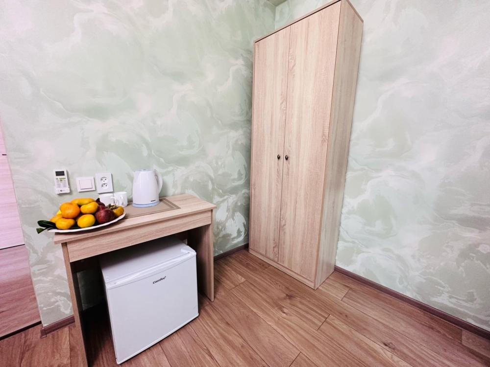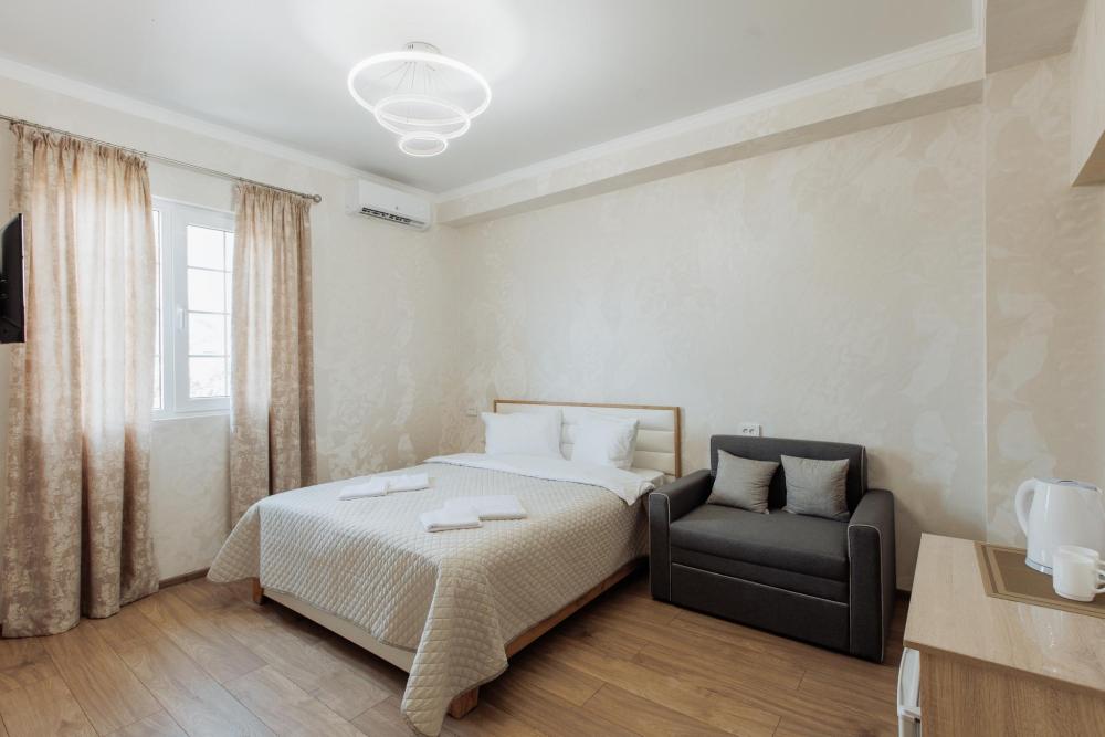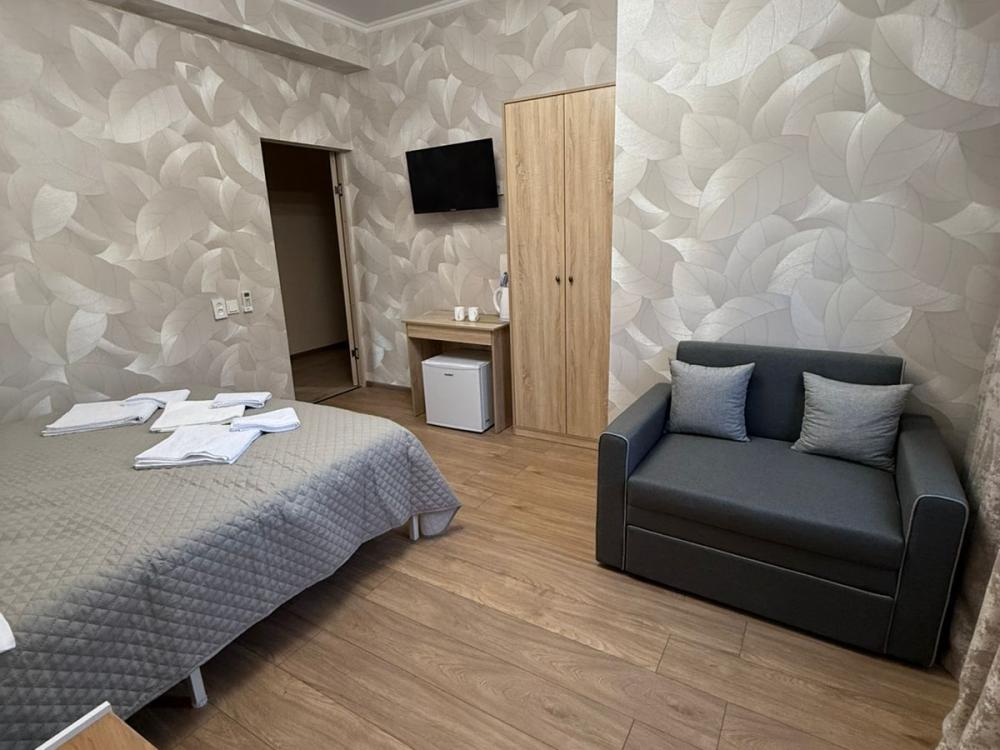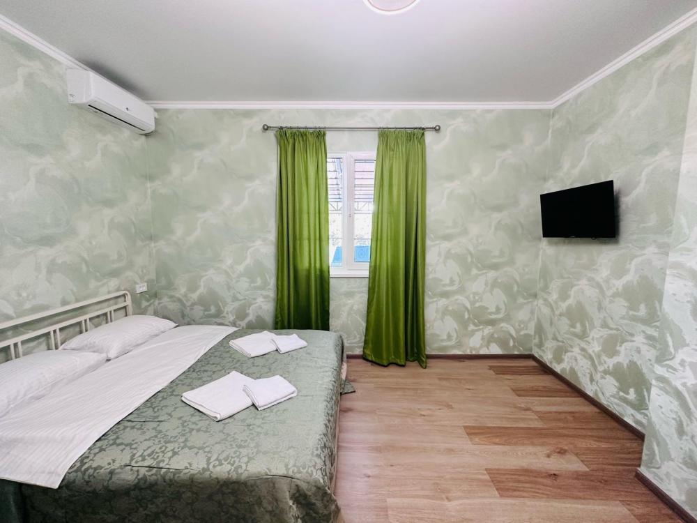 Двуспальная кровать + раскладной диванчик Площадь номера составляет 18 кв.м. Шкаф для хранения вещей Бесплатный Wi-Fi. Кондиционер или система климат-контроля. Мини- холодильник. Электрический чайник и набор посуды. Ванная комната с душевой кабиной , туалетом и необходимыми туалетными принадлежностями. Фен для волос. Тапочки, банные принадлежности (щетка, зубная паста, жидкое мыло). Есть общий мангал, микроволновка, плита, кофеварка, мультиварка. Стирка, детская кроватка и игровой манеж - за доп. плату Объект находится под видеонаблюдением, подключена охранная система