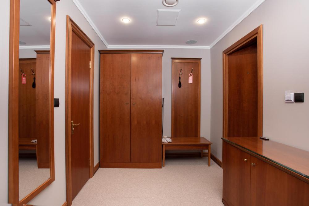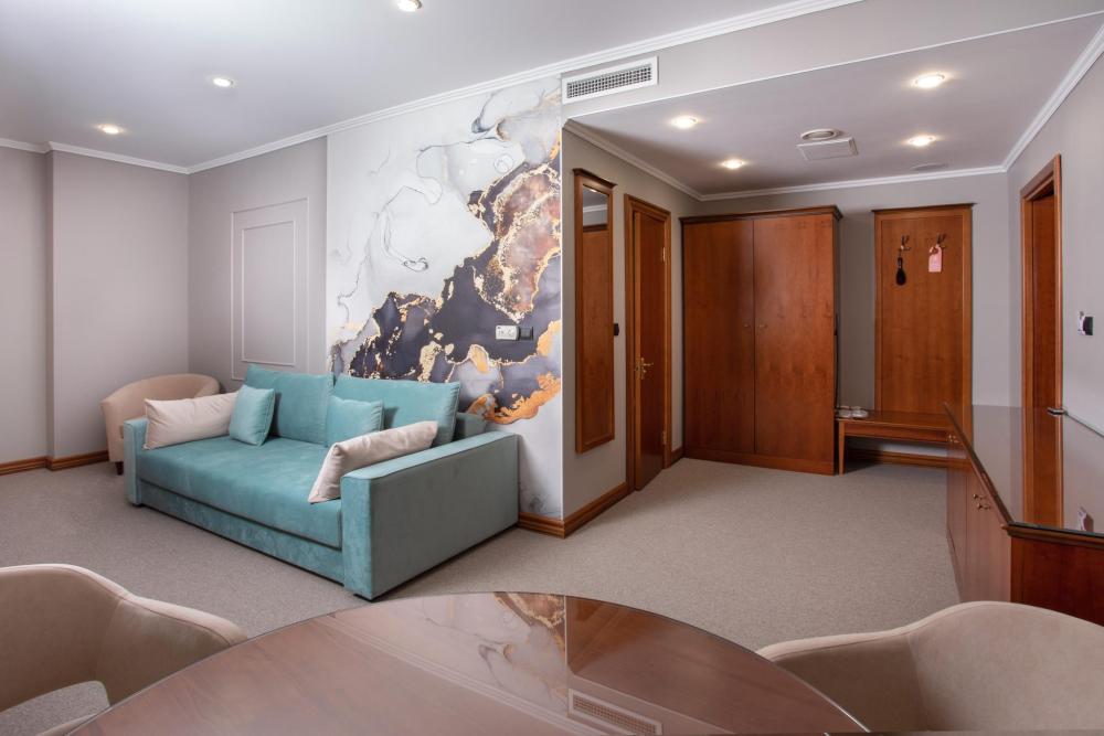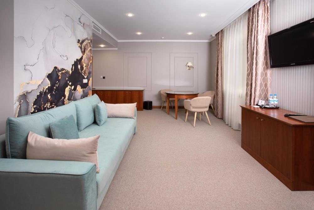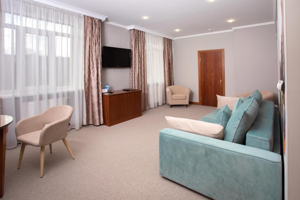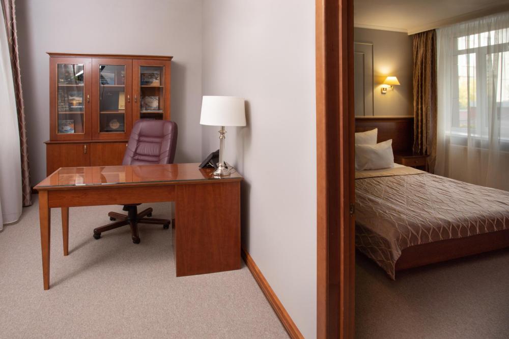 Двухкомнатный номер (гостиная + спальня) рассчитан на 1 - 2 чел. В номере: мини-бар, TV со спутниковыми каналами, телефон, двуспальная кровать, 2 тумбочки, 2 бра, стол, стул, зеркало, шкаф, 2 кресла, столик, туалет / ванна, фен, халат / тапочки, аксессуары для одежды и обуви, кондиционер