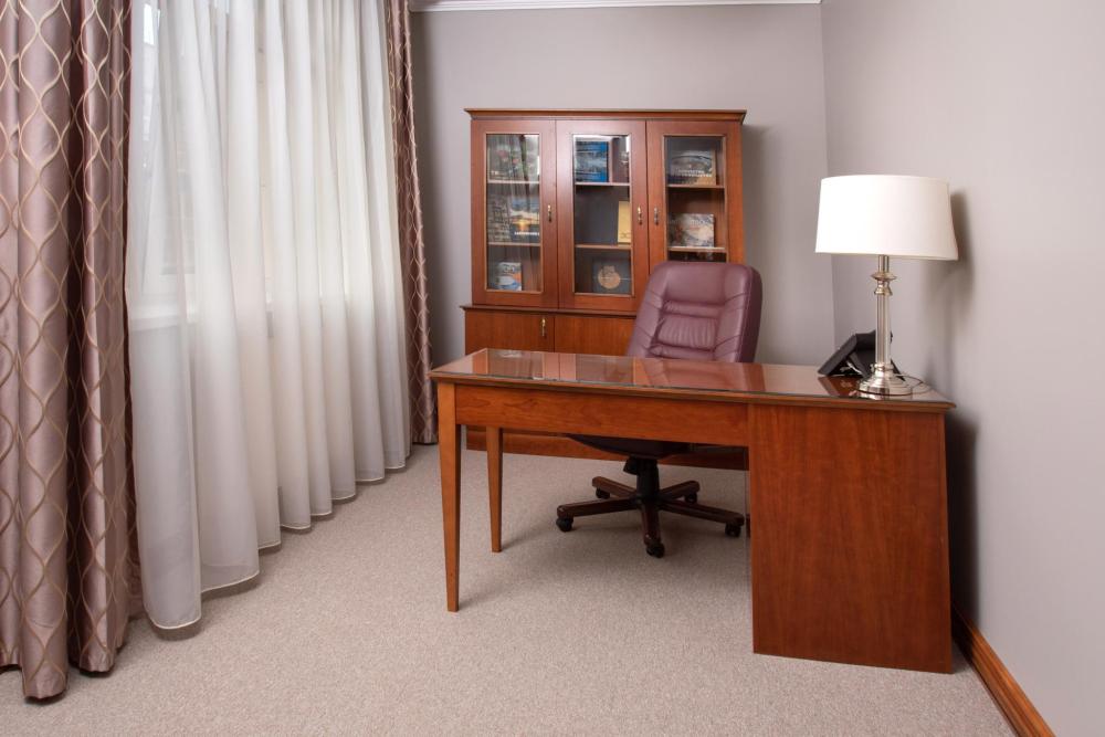 Трехкомнатный номер (гостиная, кабинет, спальня) рассчитан на 1 - 2 чел. В номере: мини-бар, TV со спутниковыми каналами, телефон, двуспальная кровать, 2 тумбочки, 2 бра, 3 стола, стул, зеркало, шкаф, мини-диван, буфет, столовые принадлежности, 2 туалета / ванна с гидромассажем, фен, халат / тапочки, аксессуары для одежды и обуви, кондиционер