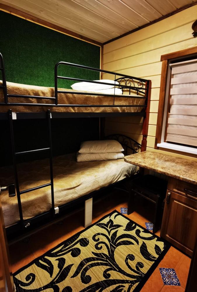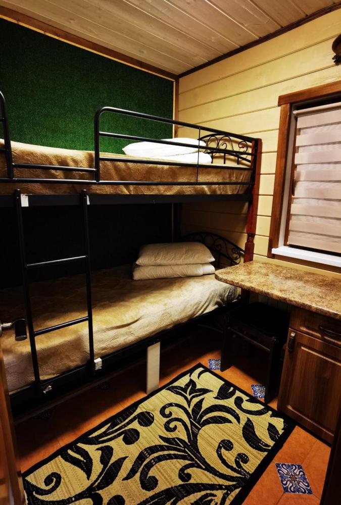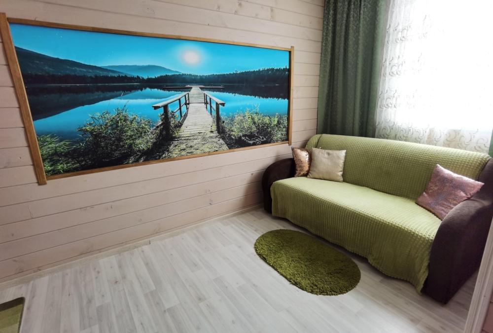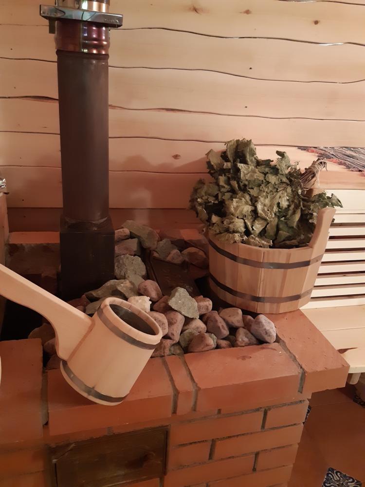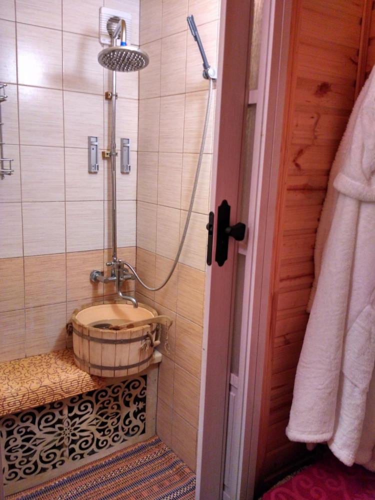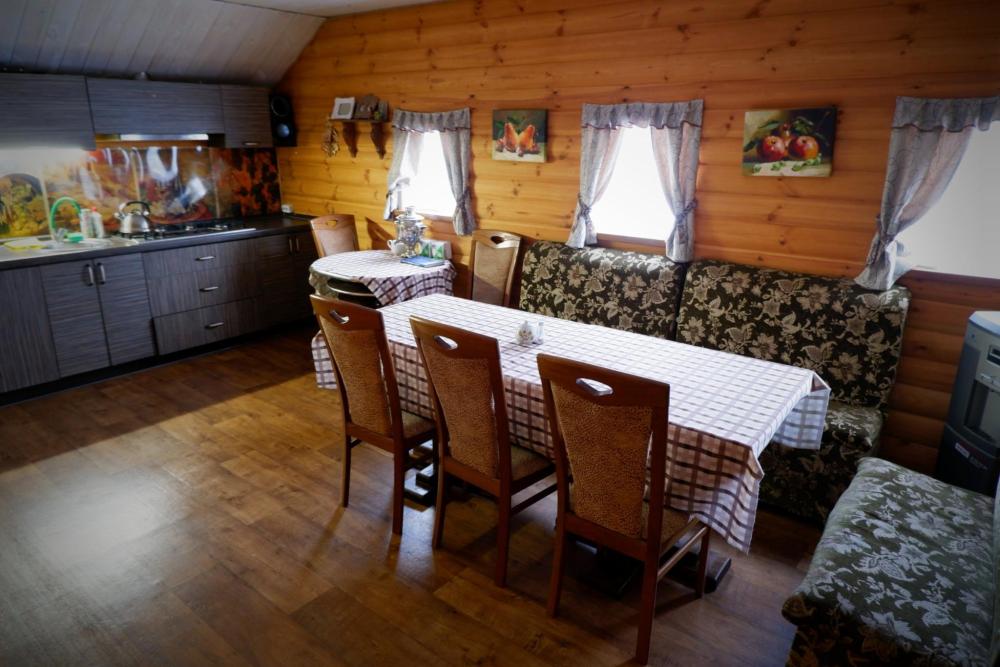 Дом с баней вмещает 6 человек. Здесь также предусмотрена беседка, мангал и детская площадка. Баня отделана толстой доской из липы, есть стена из гималайской соли. В доме с баней находятся два дивана и двухъярусная кровать. Теплые полы во всех помещениях, микроволновка, телевизоры, холодильник, кондиционер, Wi-Fi, вся необходимая посуда для приготовления еды. Есть комната для глажки и стирки одежды, для удобства гостей работает сушильная машина.