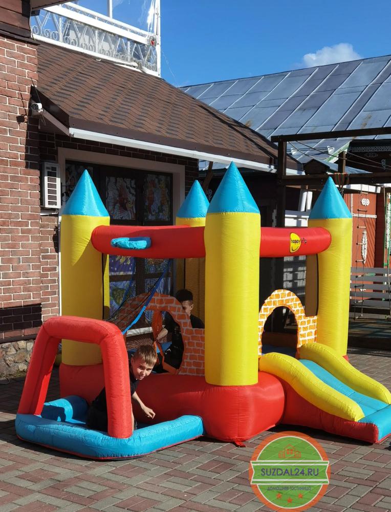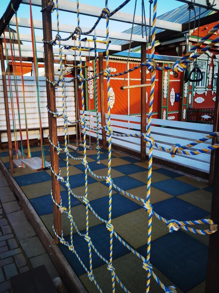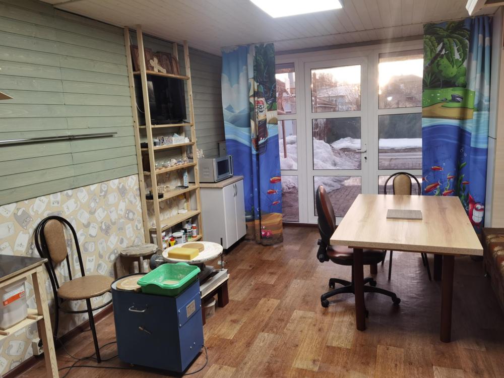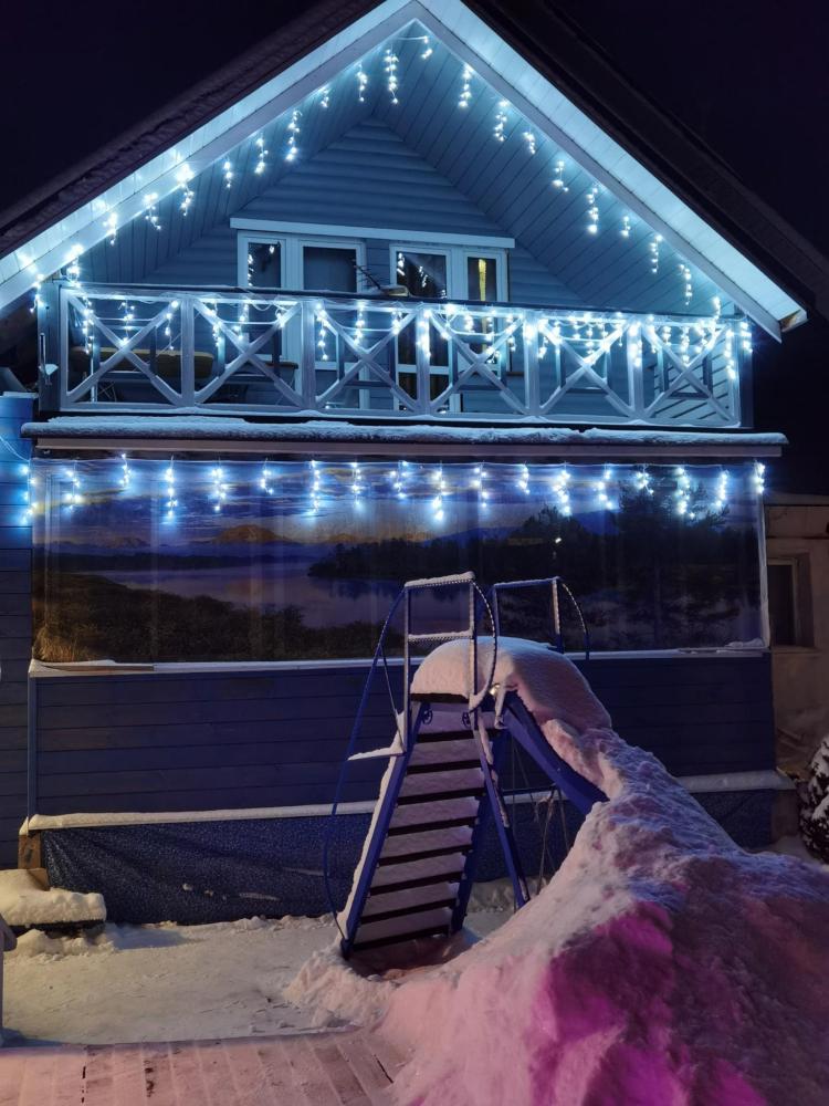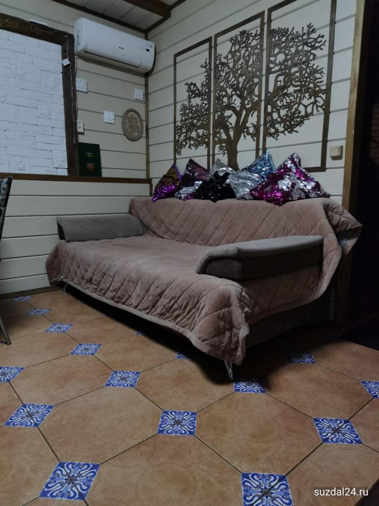 Дом с баней вмещает 6 человек. Здесь также предусмотрена беседка, мангал и детская площадка. Баня отделана толстой доской из липы, есть стена из гималайской соли. В доме с баней находятся два дивана и двухъярусная кровать. Теплые полы во всех помещениях, микроволновка, телевизоры, холодильник, кондиционер, Wi-Fi, вся необходимая посуда для приготовления еды. Есть комната для глажки и стирки одежды, для удобства гостей работает сушильная машина.