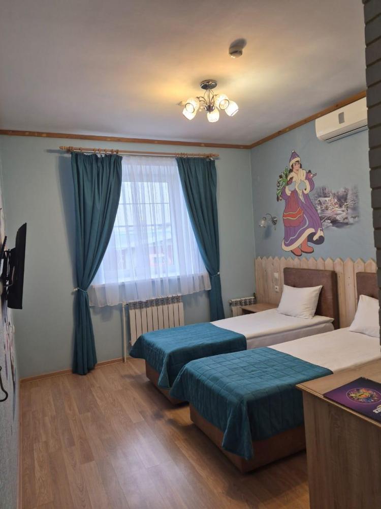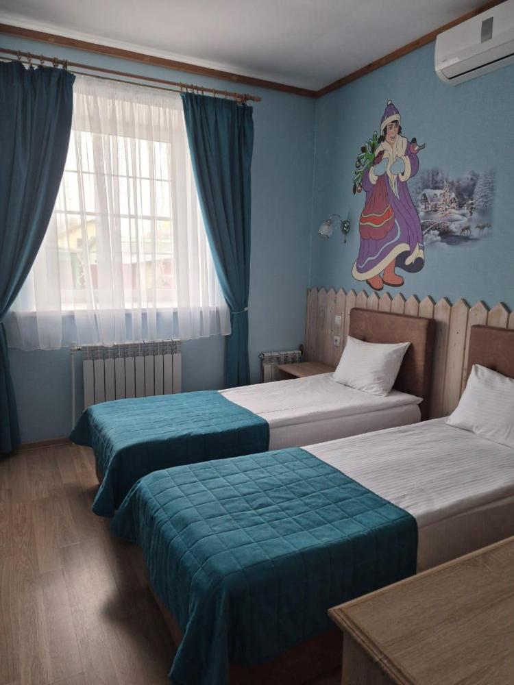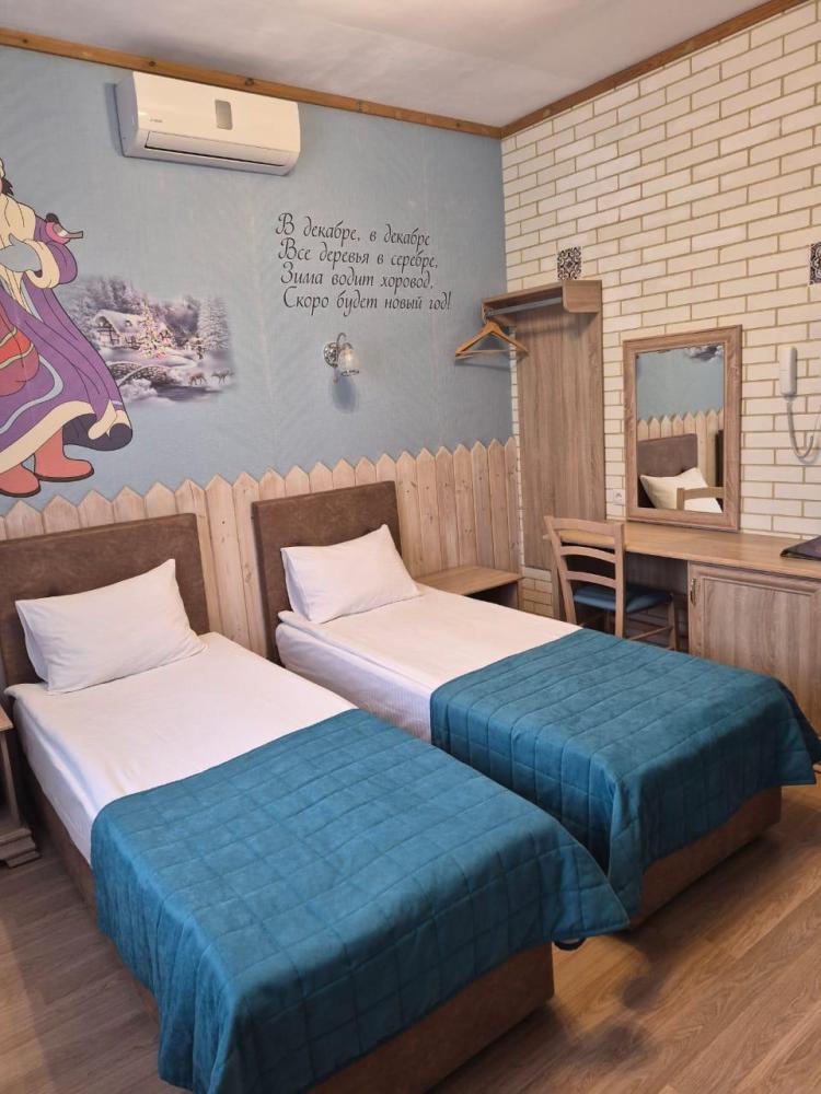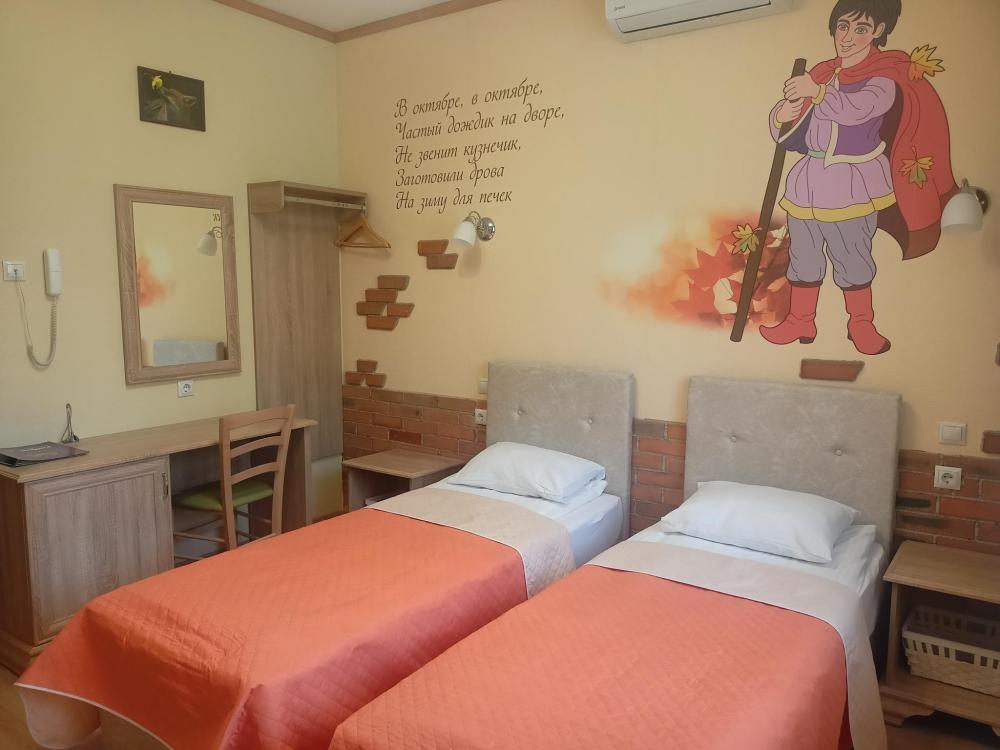 В комнате: Две односпальные кровати с прикроватными тумбочками, телевизор, кондиционер, стол со стулом, вешалка, телефон. Санузел с душевой кабиной, унитаз, фен.