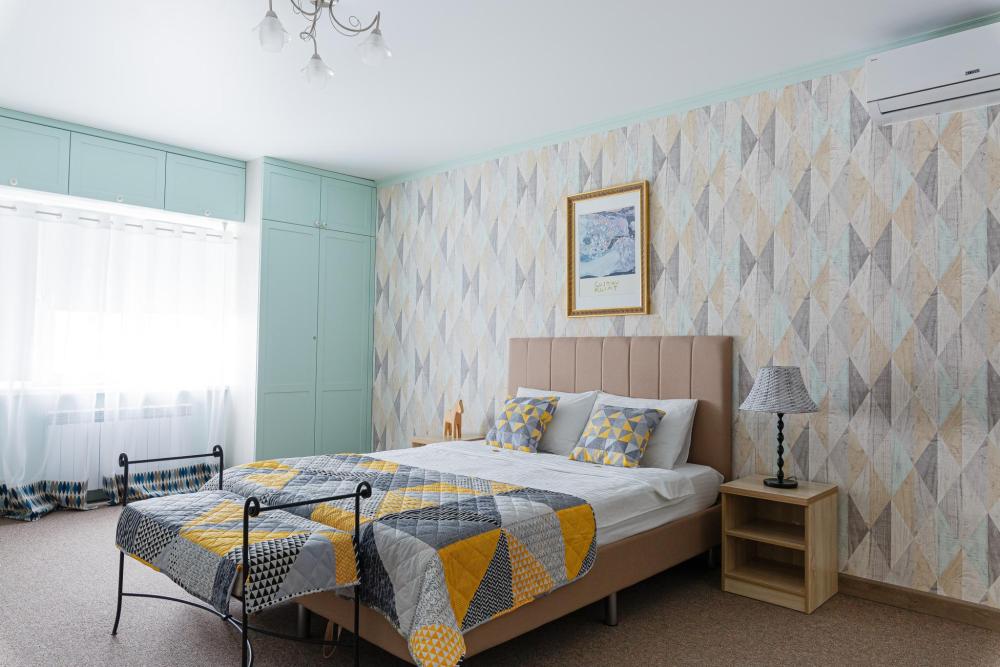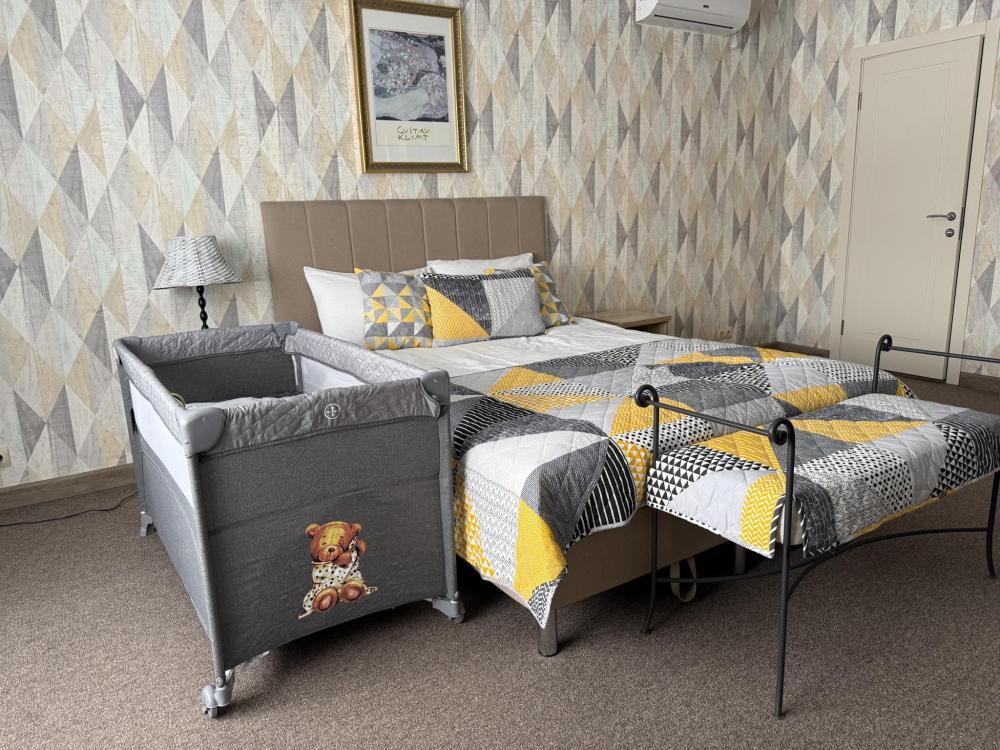 Уютная просторная комната семейная общей площадью 50 кв.м. для размещения до 4-х гостей. В спальне - двуспальная кровать, прикроватные тумбочки, туалетный столик с зеркалом, шкаф платяной. Ванная комната с душевой кабиной и набором полотенец (по 3 на каждого гостя), тапочки. В гостиной комнате - телевизор, два кресла, журнальный столик, раскладной диван (дополнительные места ) выход на балкон, кондиционер, Wi-Fi интернет.