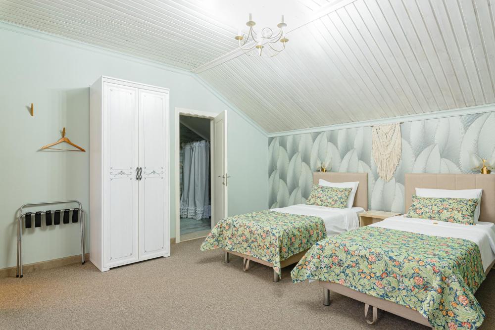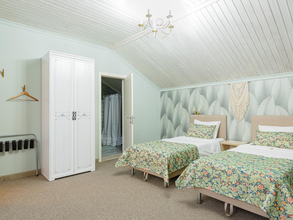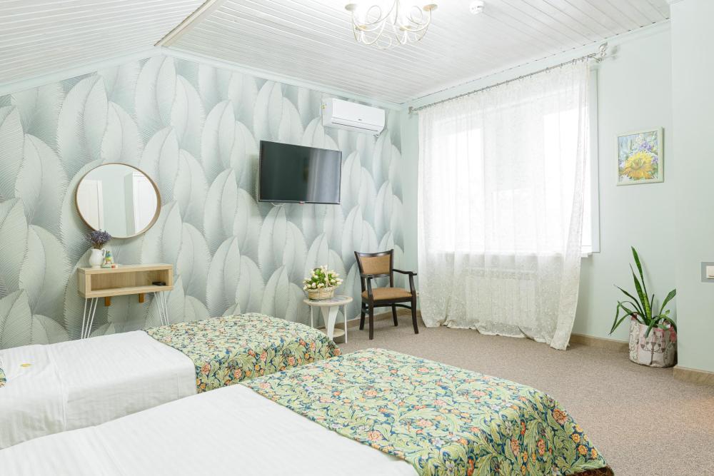 Двухместная комната комфорт с раздельными кроватями ( возможно совместить) общей площадью 16 кв.м. Оснащение: две раздельные односпальные кровати (при желании можно объединить), телевизор, столик с креслом, прикроватные тумбы и туалетный столик, шкаф платяной, кондиционер, ванная комната с душевым уголком и набором полотенец (по три на каждого гостя), тапочки, Wi-Fi интернет. Вид из окна в сад.