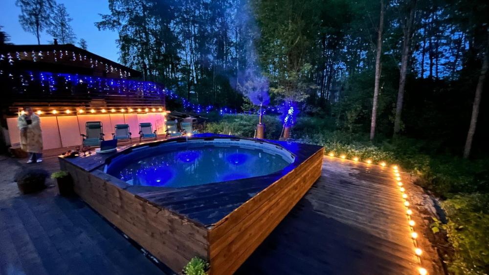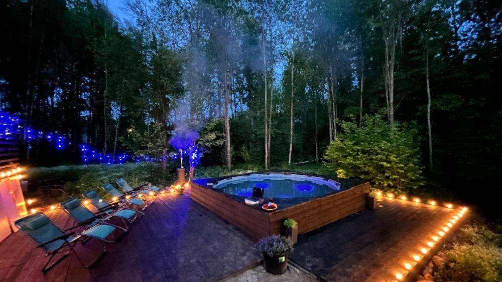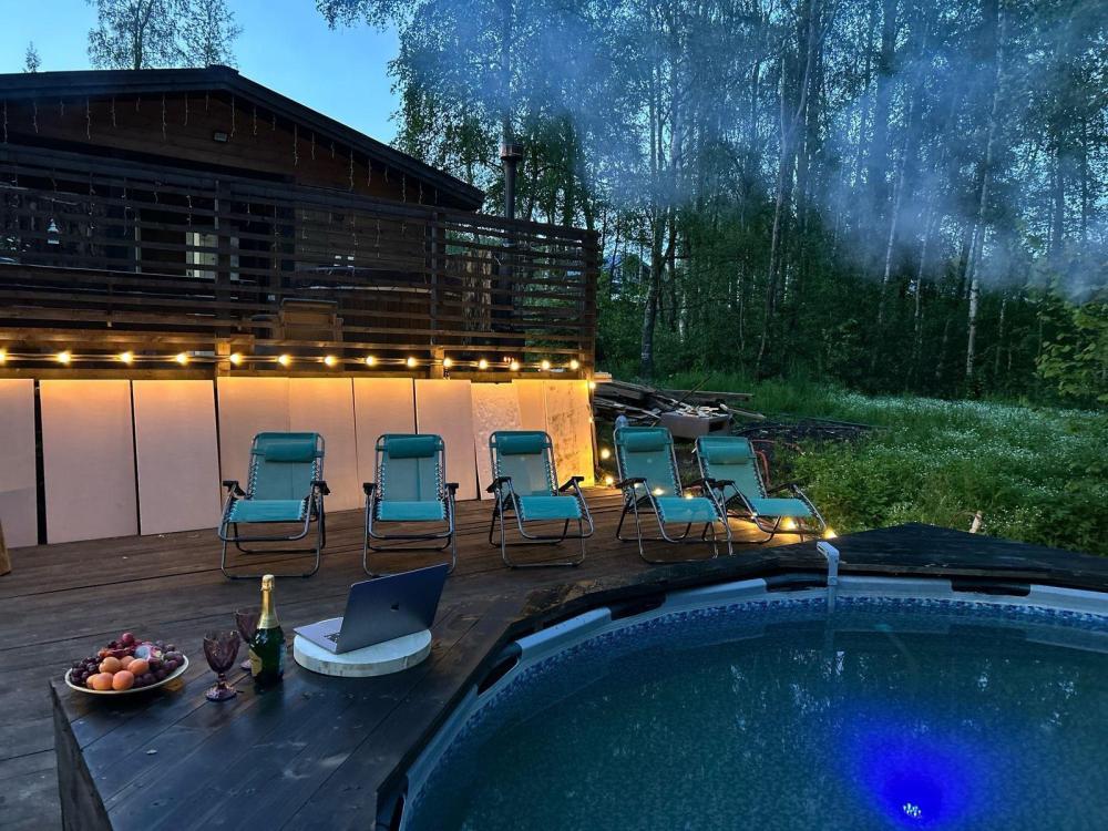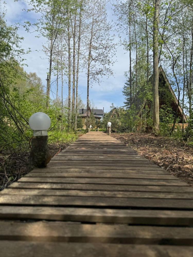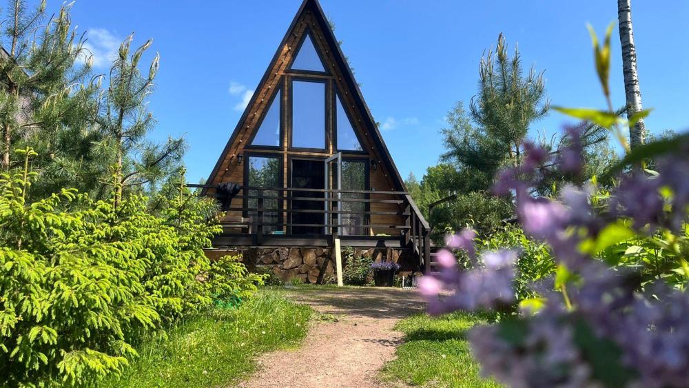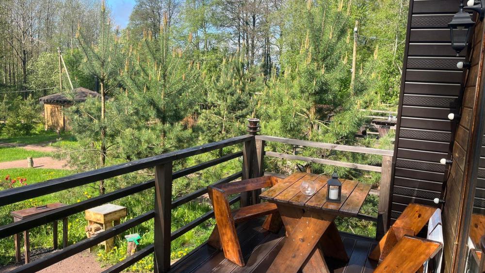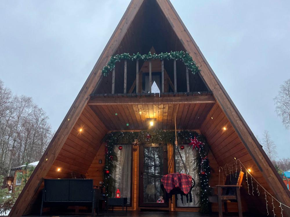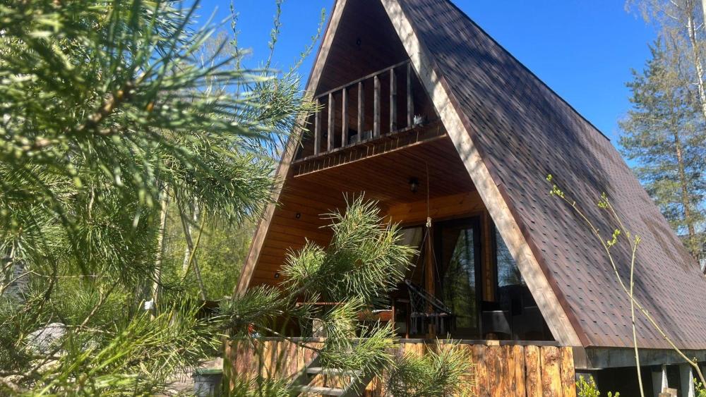 Треугольный дизайнерский домик— шале с балконом (вместимость до 10 человек), общая площадь 72 кв.м. Дом для отдыха полностью выполнен из дерева и оборудован для комфортного отдыха. В доме теплые водяные полы с датчиком регулировки температуры, настенный кварцевый обогреватель, вентилятор, установлен бойлер, современный экологический септик. В доме есть все необходимое для комфортного проживания: - Мини-кухня (большой обеденный стол и стулья, холодильник, микроволновая печь, набор посуды/утвари для приготовления еды и красивой сервировки стола, чайник, индукционная плита, средства для мытья посуды, губки, кухонные полотенца); - Гостиная с панорамными окнами в пол с видом на лес (в гостиной: ЖК телевизор, подвесное кресло/кокон с подсветкой, три дивана/кровати с независимыми пружинными блоками и ортопедическим основанием, - Две изолированные спальные комнаты (в одной комнате одна двуспальная кровать, во второй две односпальные, прикроватные тумбочки. Все спальные места укомплектованы ортопедическими матрасами и застелены премиальным белоснежным постельным бельем (хлопок/сатин); - Ванная комната (фен, гипоаллергенные крем/гель для душа и гель мыло для рук, шампунь, наборы полотенец); - Санузел (туалетная бумага, дезинфицирующие средства, освежитель воздуха); - Собственная крытая мангальная зона (шампура и принадлежности для барбекю предоставляются в аренду); - Детская кровать и стул (за дополнительную плату) - Утюг и гладильная лоска (по запросу); - Халаты (за дополнительную плату); - Wi-Fi (оптоволокно).
