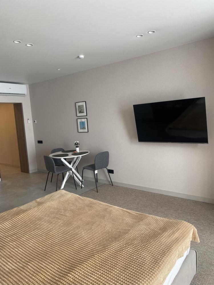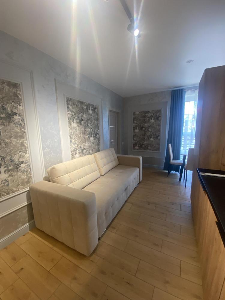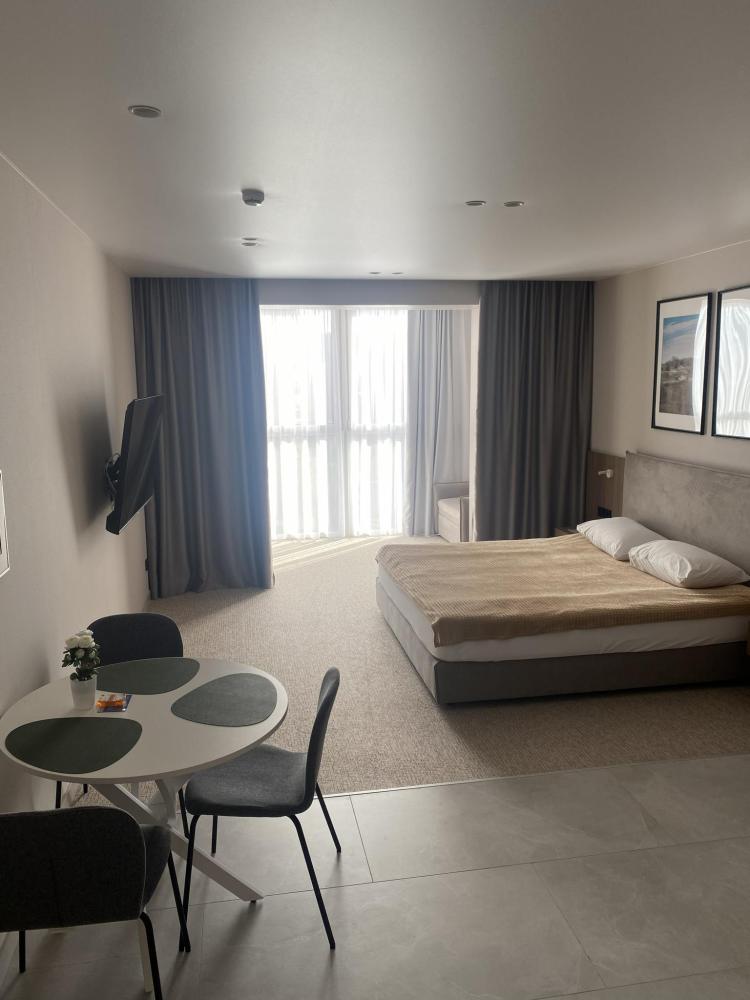 Большая кровать с удобным матрасом примет Вас в свои объятия после долгого продуктивного дня! А кресло-кровать позволяет комфортно разместиться еще одному гостю. Постельное белье и полотенца меняются каждые 3 дня. Стабильный интернет и удобный стол позволят поработать в тишине тем, кто приехал не только отдохнуть. Кухня оборудована всей необходимой техникой: вместительный холодильник, чайник, индукционная плита, микроволновая печь. Имеется полный комплект посуды: тарелки, стаканы, бокалы, чашки, кастрюли, штопор и тд! Есть кондиционер. Шторы блэк-аут не дадут вам проснуться раньше, чем вы сами захотите! В ванной комнате есть все необходимые принадлежности: гель, шампунь, мыло, зубной набор, тапочки, полотенца, гигиенический душ, фен. Халаты предоставляются по предварительному запросу бесплатно.Территория комплекса апартаментов закрыта и находится под круглосуточным видеонаблюдением, есть своя детская площадка.