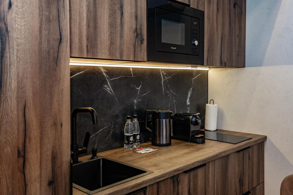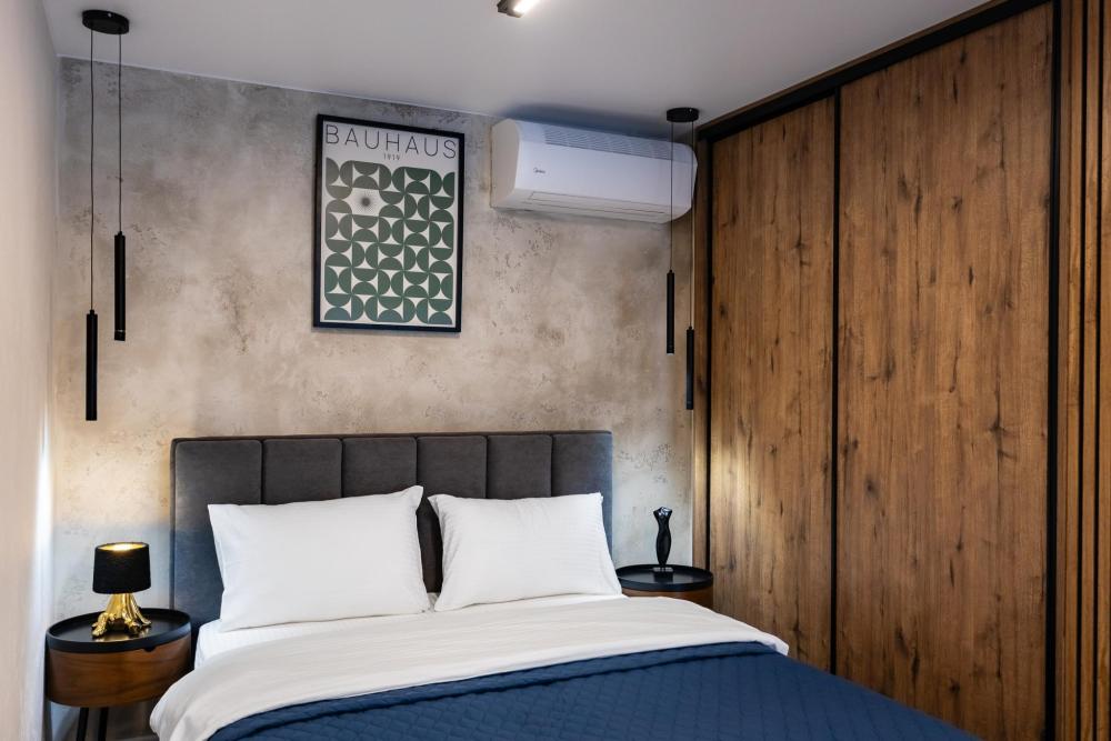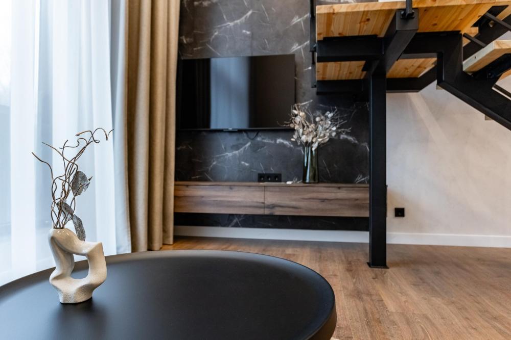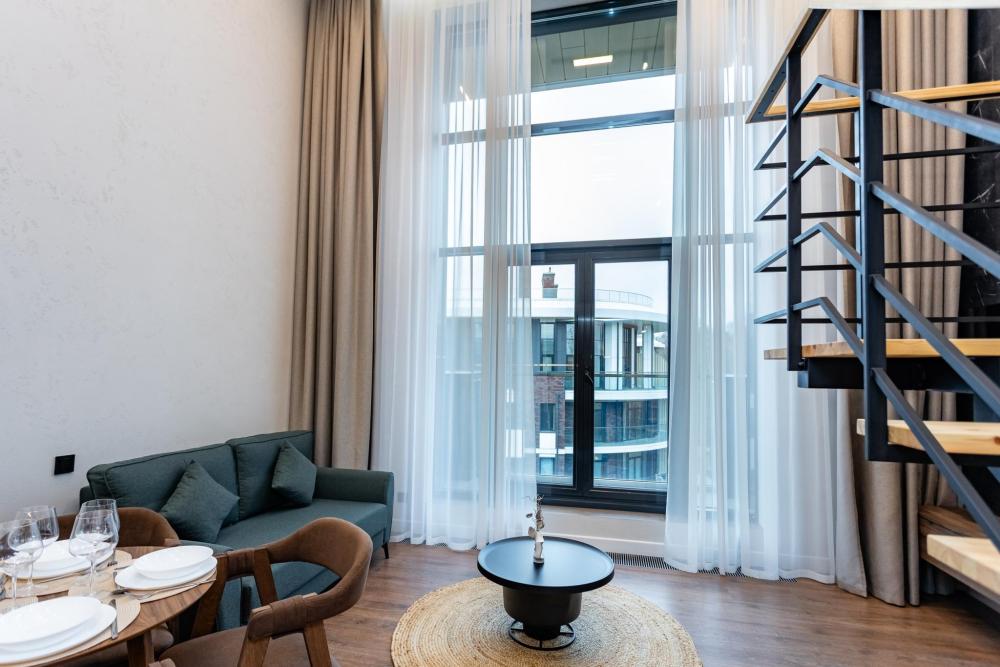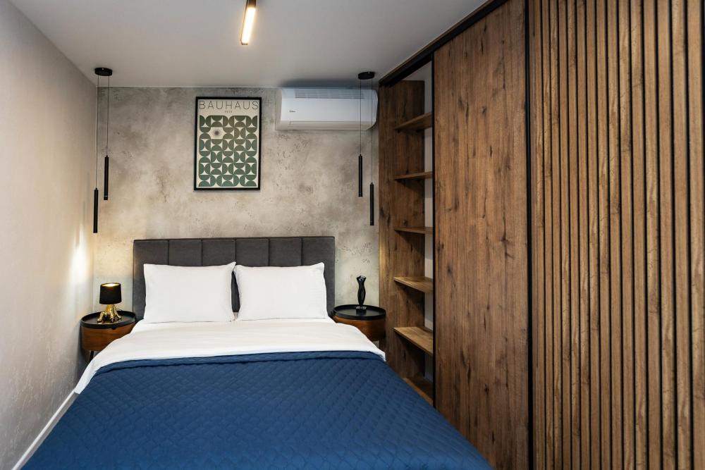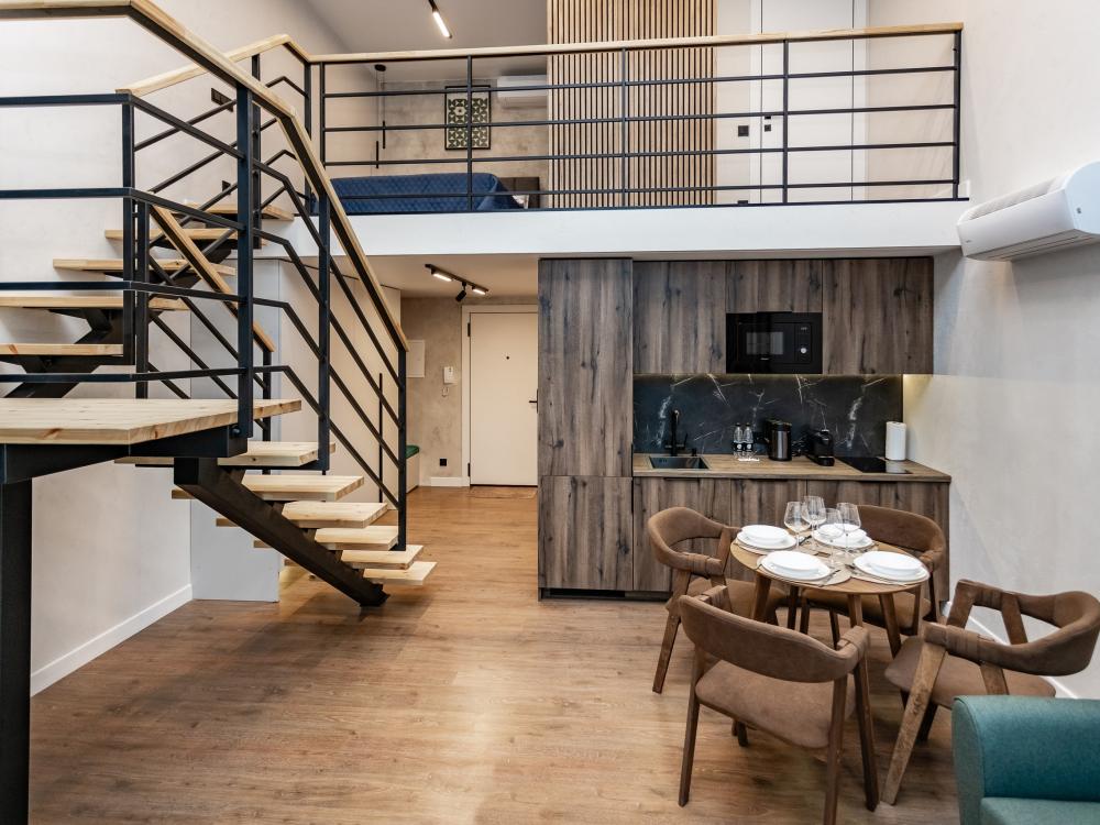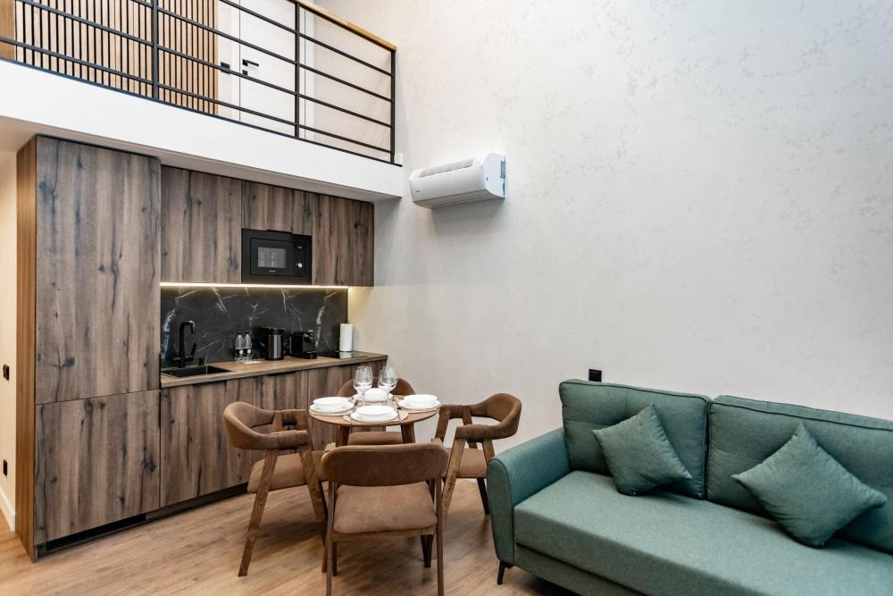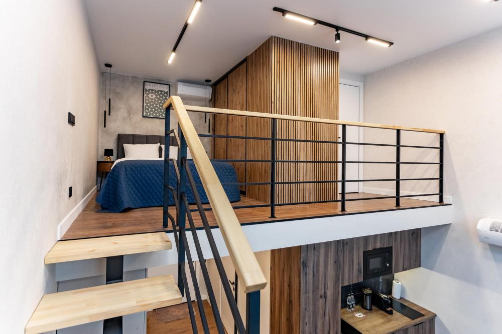 GreenLine - уютные апартаменты в стиле современного лофта, выполненные в тёплой древесной гамме и лаконичных графитовых акцентах. На двух ярусах продумана функциональная планировка: снизу компактная кухня и зона отдыха, сверху — спальня на мезонине с комфортной кроватью и аккуратной подсветкой. Интерьер подчёркивают естественные материалы — дерево в отделке пола и стеновых панелей, открытые ступени и металлические перила, которые создают лёгкий индустриальный характер. Из балкона открывается вид на море, а большие панорамные окна наполняют пространство светом и свежим морским воздухом. Апартаменты подходят как для романтического уик‑энда, так и для спокойного отдыха вдали от городской суеты. Главные фишки: • Два яруса (мезонин/спальня и гостевая зона); • Просторные панорамные окна и балкон с видом на море; • Светлый, натуральный интерьер с деревянными акцентами; • Чистый свежий воздух и спокойная атмосфера; • Удобная оборудованная кухня и эффектная подсветка. GreenLine — место для тех, кто ценит стильный минимализм, комфорт и морскую близость.