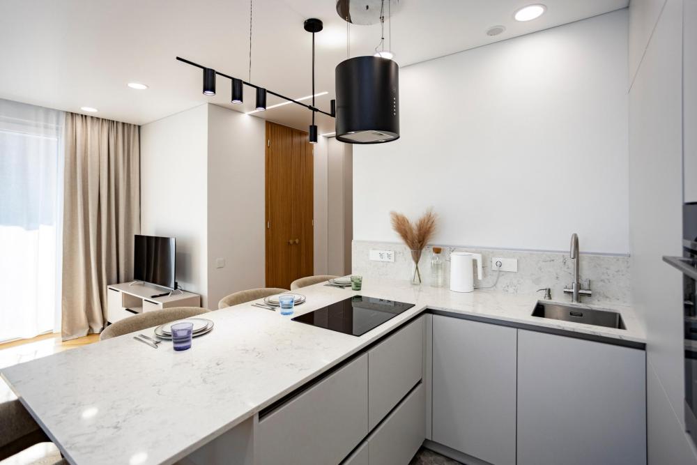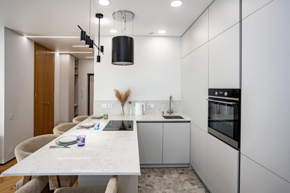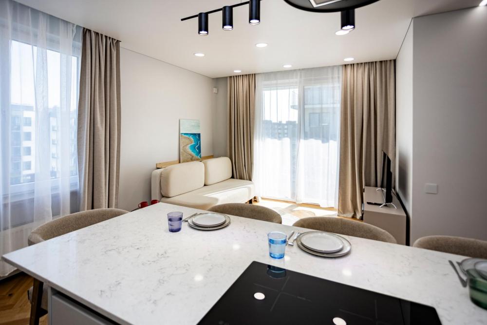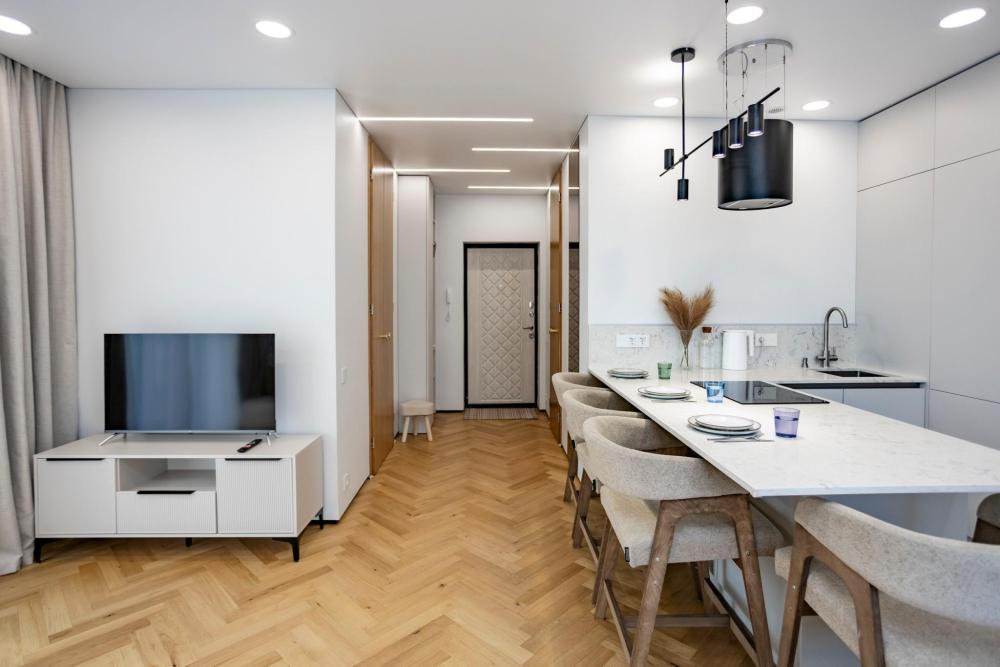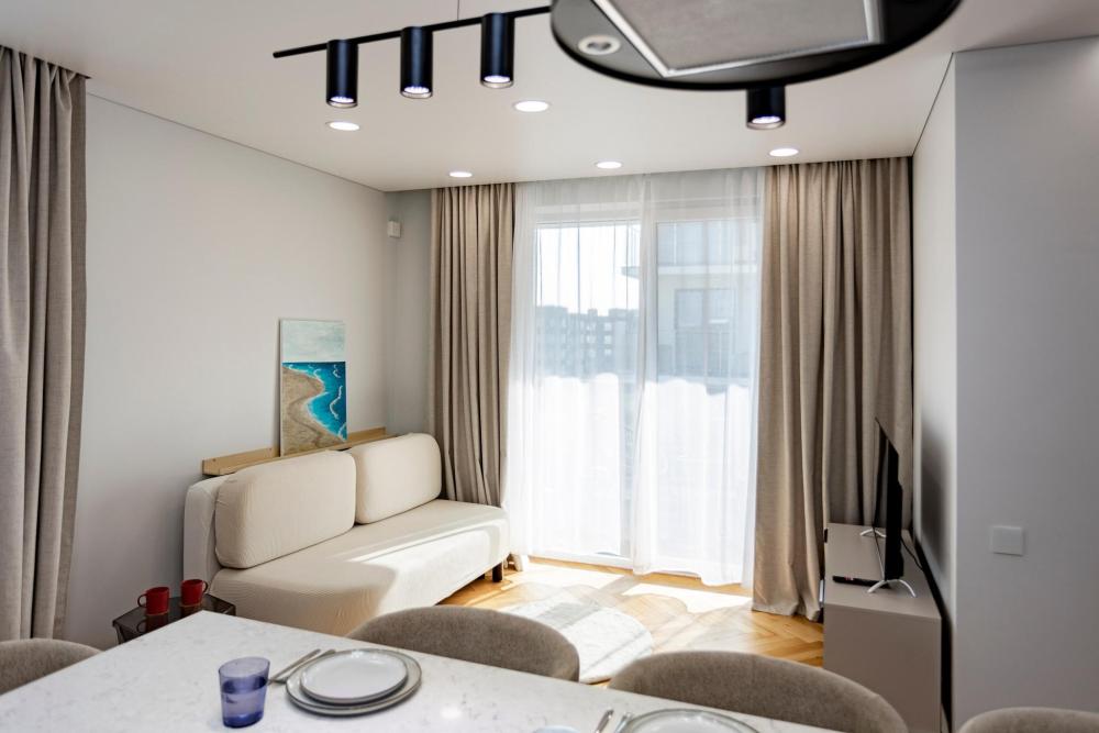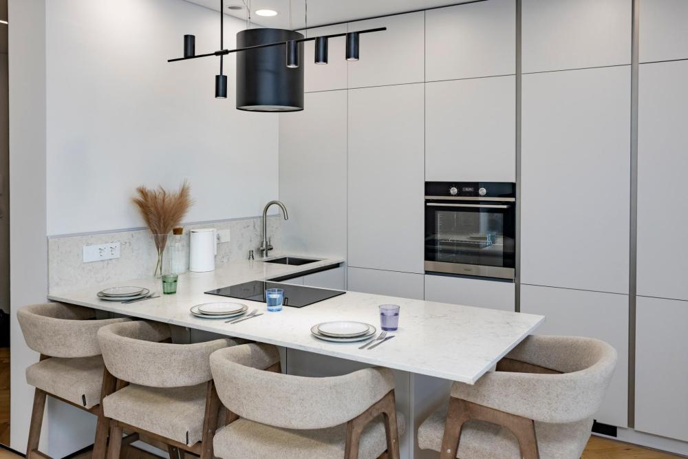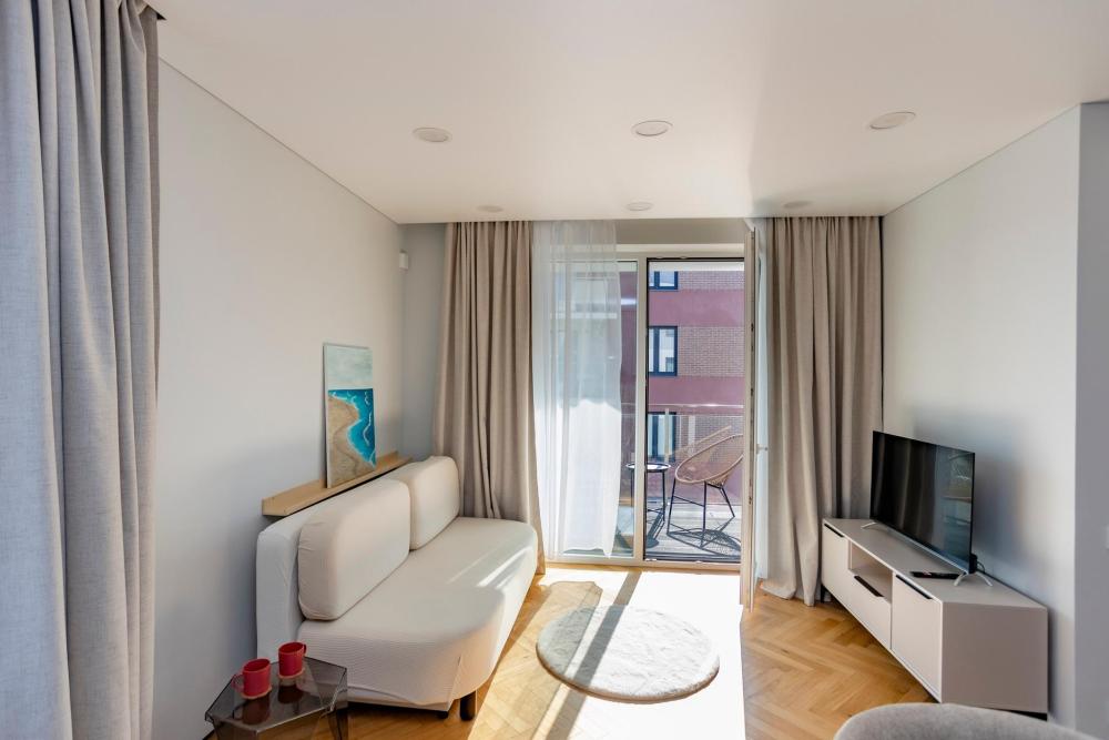Апартаменты Edelia. Светлые апартаменты оформлены в пастельных тонах с акцентом на натуральные материалы: паркет, эксклюзивные двери в полную высоту и лаконичная мебель создают атмосферу лёгкости и спокойствия. Для удобства в апартаментах есть всё необходимое: полностью оборудованная кухня: индукционная плита, посудомоечная машина, духовой шкаф, холодильник, СВЧ-печь и вся необходимая посуда. Удобная спальня с комфортной кроватью для полноценного отдыха. Стиральная машина со средствами для ухода за вещами. Современная дизайнерская ванная комната. Высокоскоростной Wi-Fi и ТВ для работы и развлечений. Просторный балкон с прекрасным видом — идеальное место для утреннего кофе.