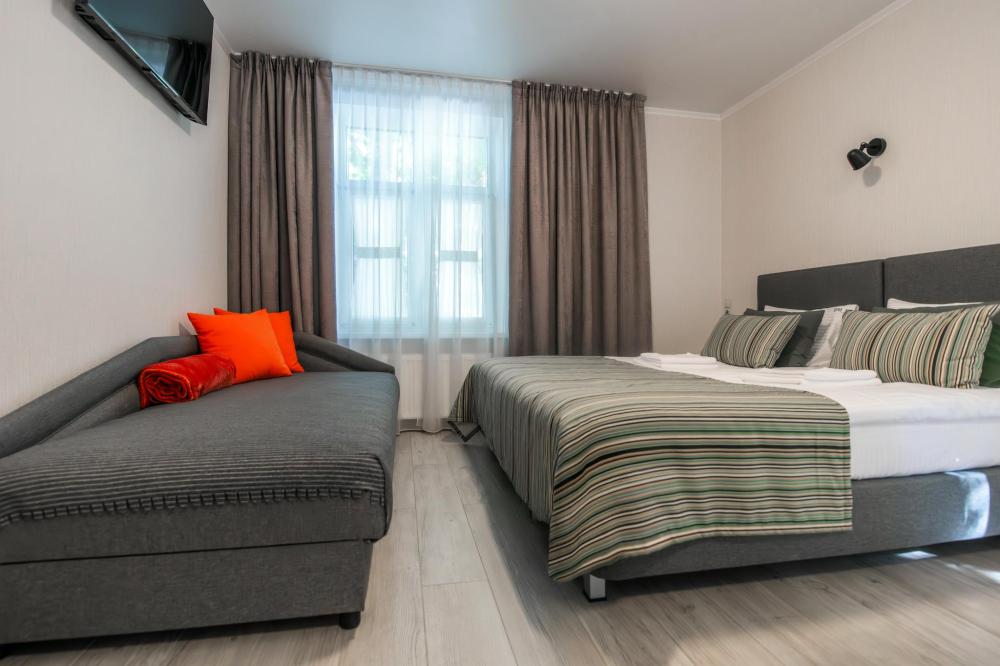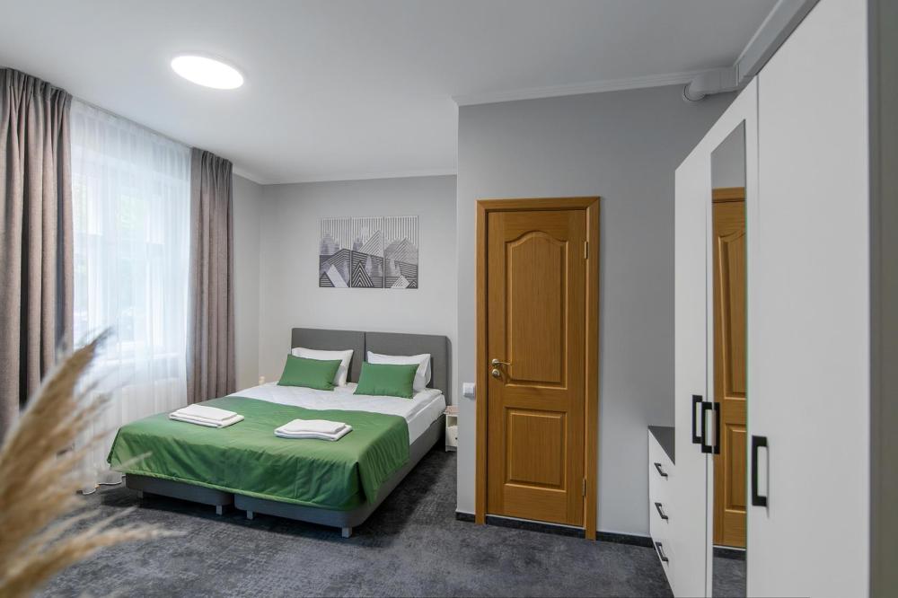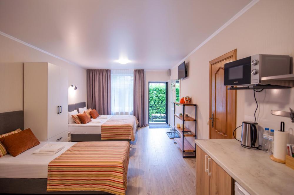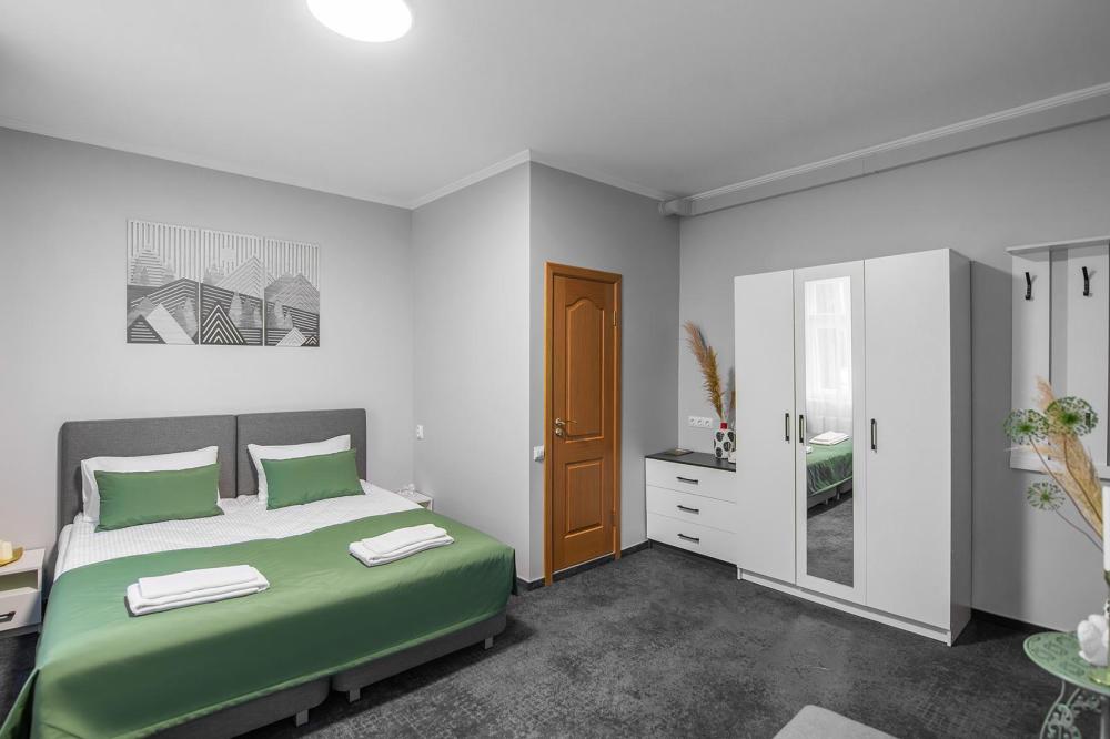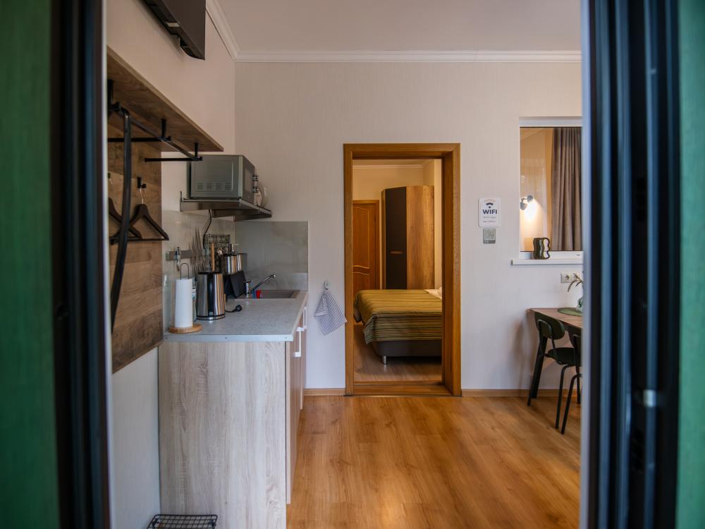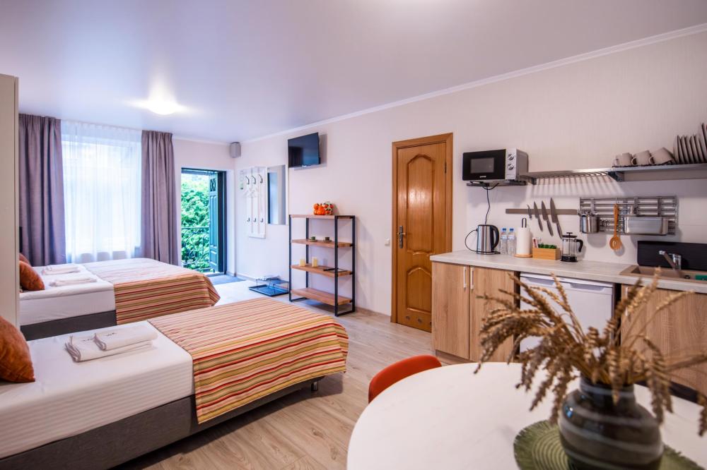 Просторный номер для семейного отдыха с удобной двуспальной кроватью, качественным постельным бельем и мягким диваном - идеальное место для вечернего отдыха. Общая оборудованная кухня, расположенная на этаже, оснащена всем необходимым - стиральной машиной с сушкой, газовой плитой, холодильником, микроволновой печью, полным набором посуды.