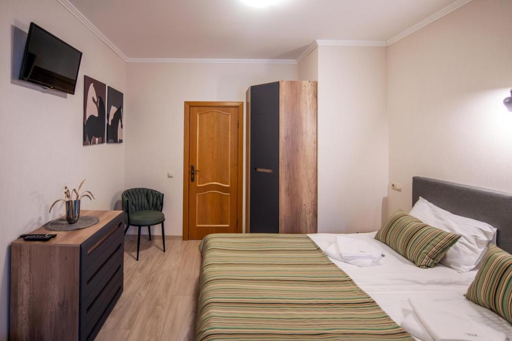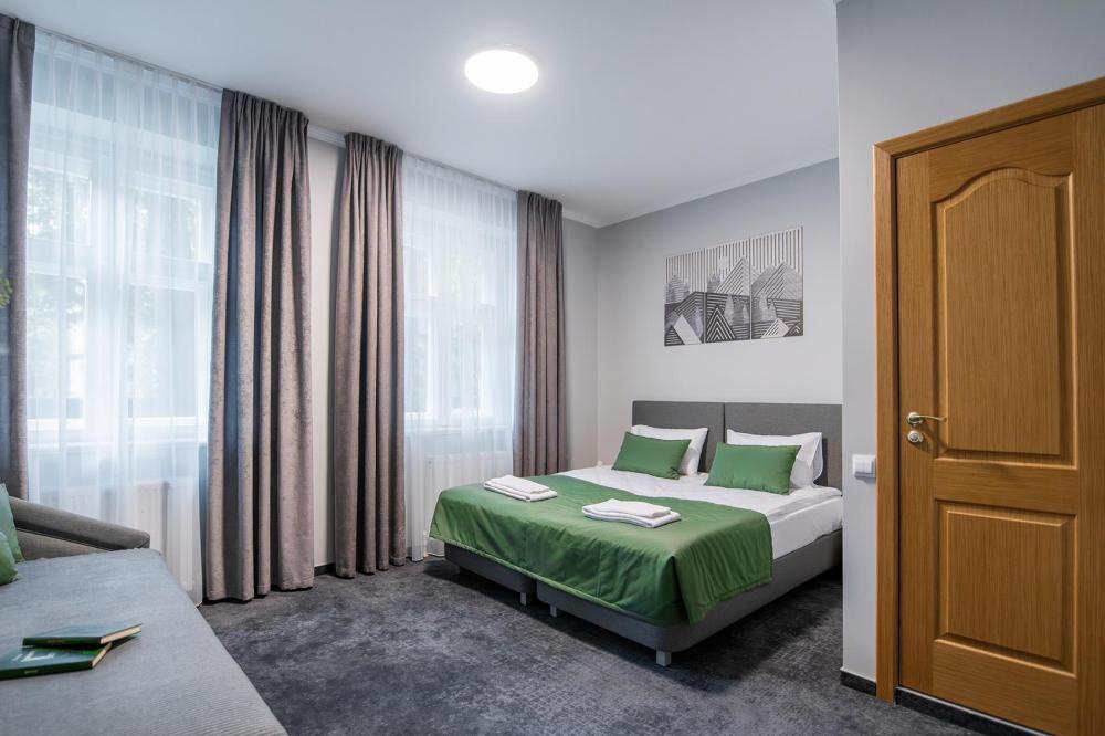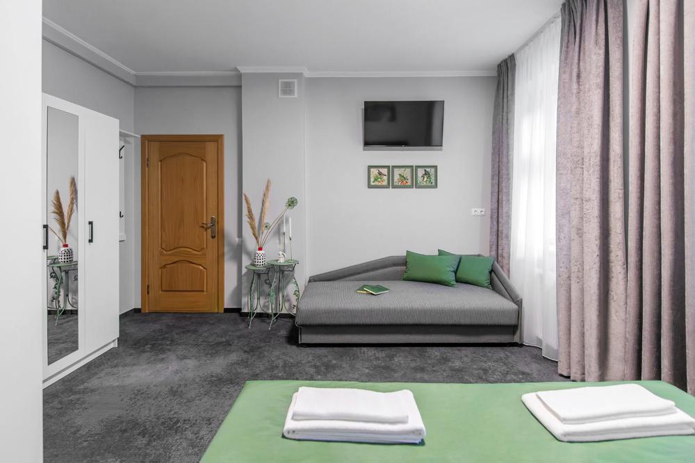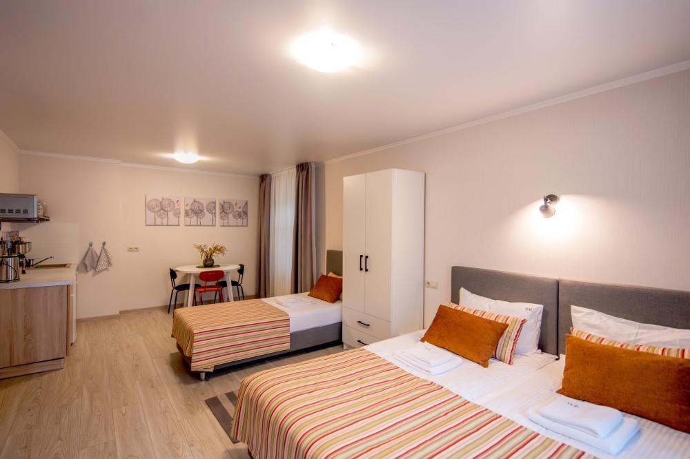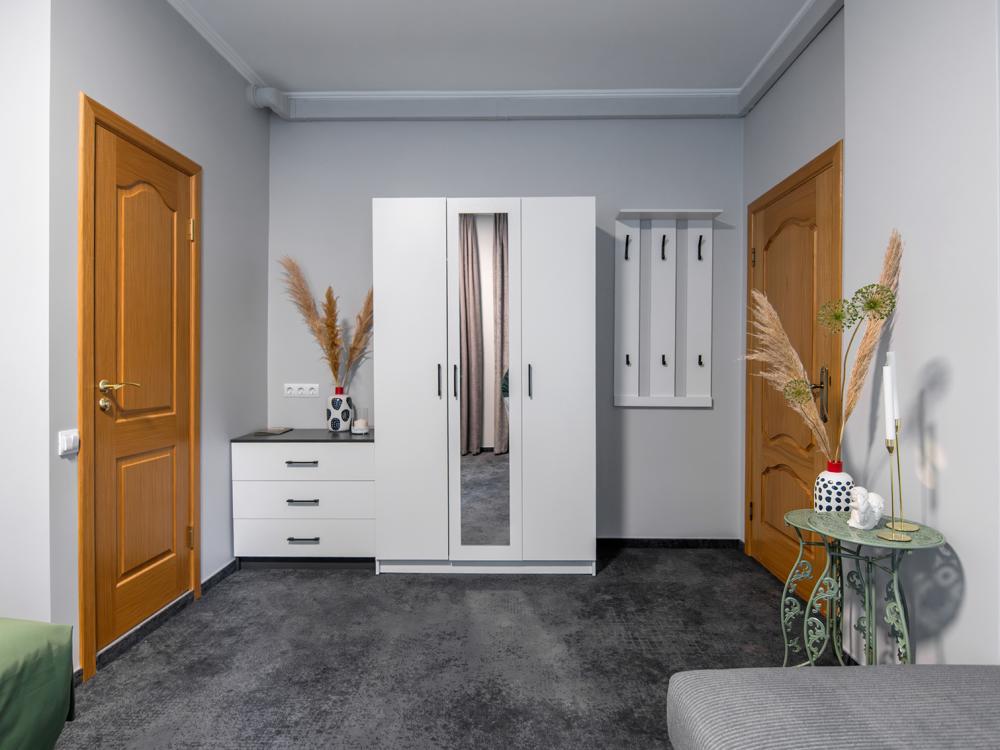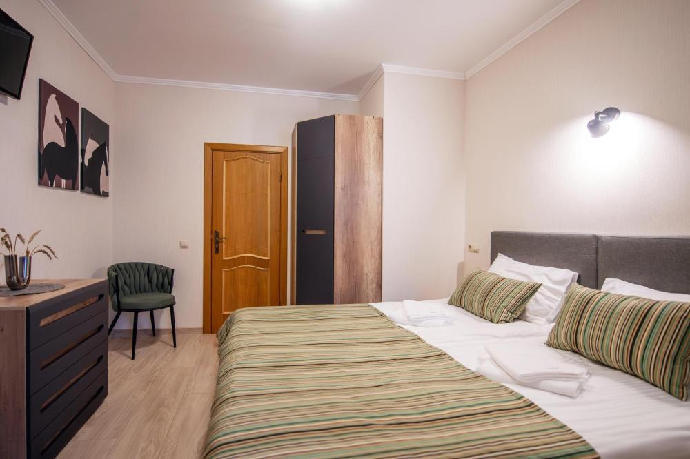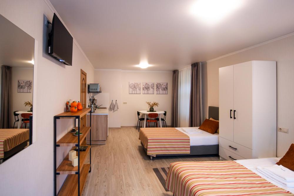 Просторный номер для семейного отдыха с удобной двуспальной кроватью, качественным постельным бельем и мягким диваном - идеальное место для вечернего отдыха. Общая оборудованная кухня, расположенная на этаже, оснащена всем необходимым - стиральной машиной с сушкой, газовой плитой, холодильником, микроволновой печью, полным набором посуды.