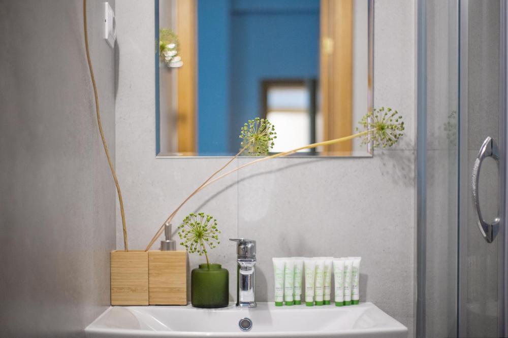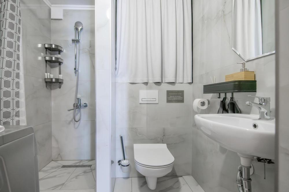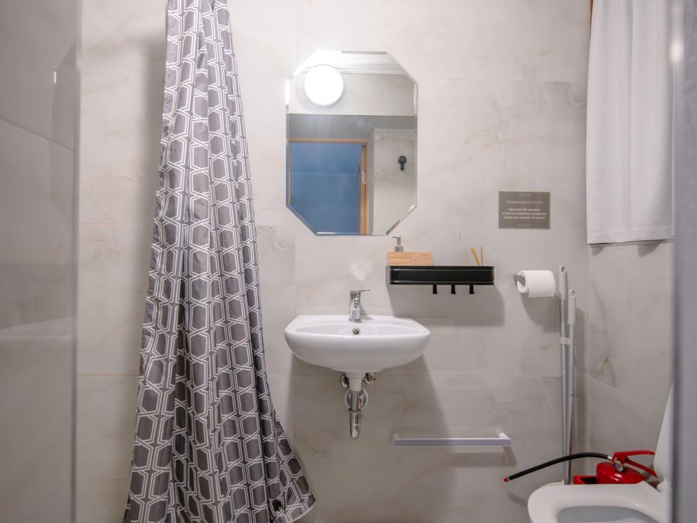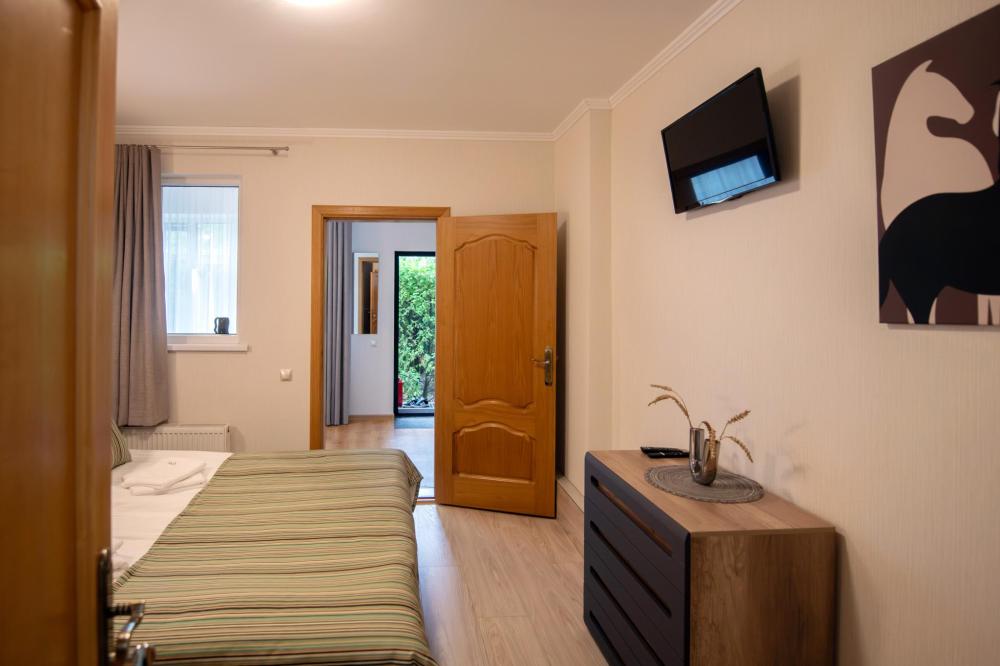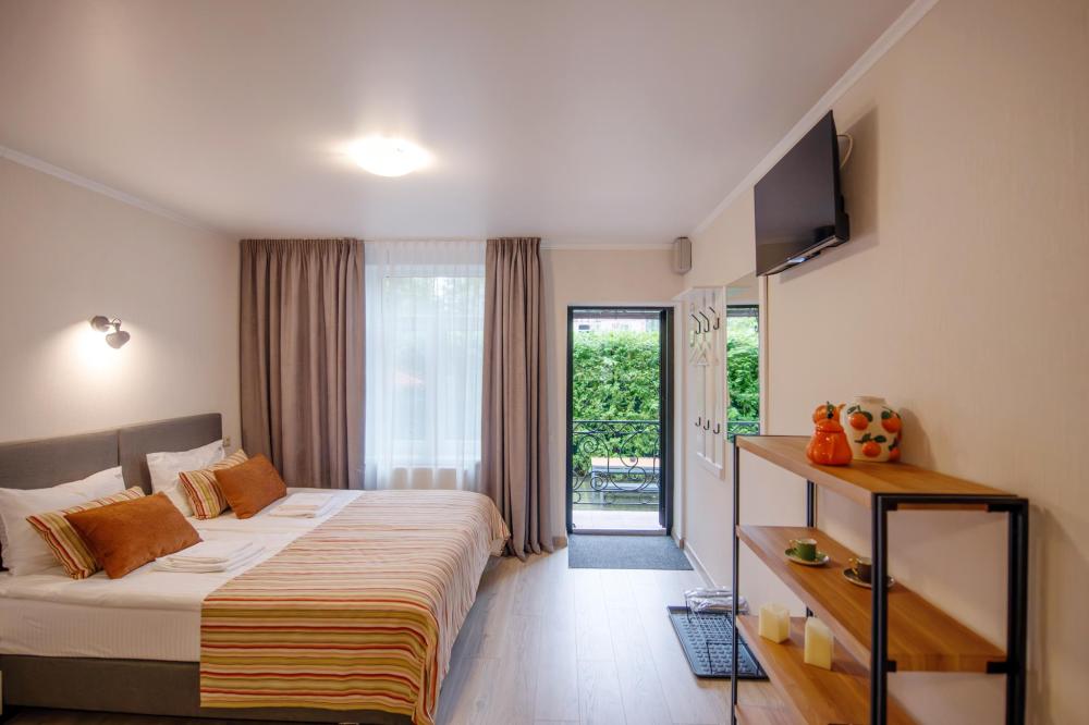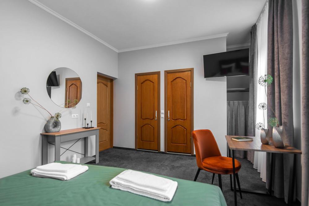 Просторный номер для семейного отдыха с удобной двуспальной кроватью, качественным постельным бельем и мягким диваном - идеальное место для вечернего отдыха. Общая оборудованная кухня, расположенная на этаже, оснащена всем необходимым - стиральной машиной с сушкой, газовой плитой, холодильником, микроволновой печью, полным набором посуды.