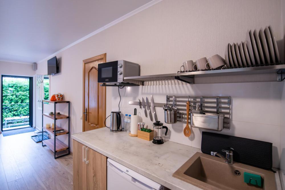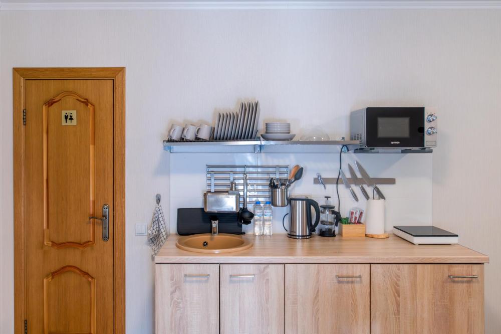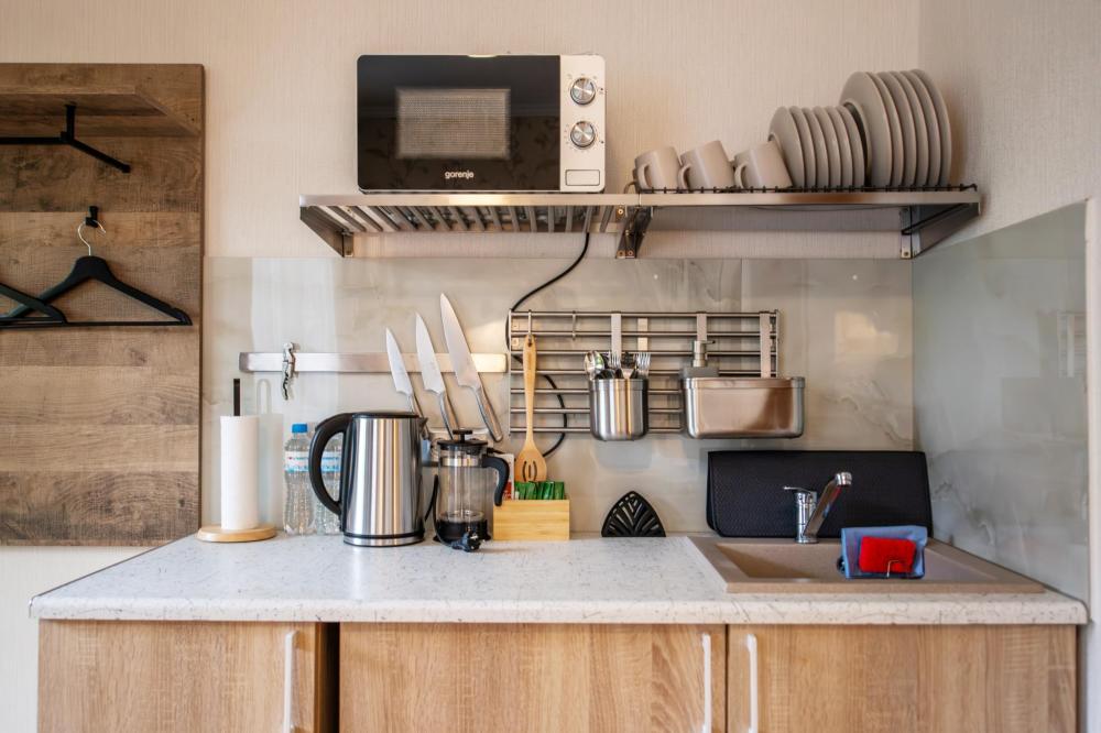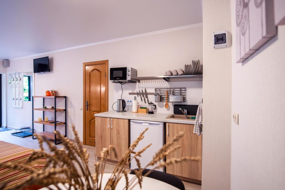 Квартира - студия с отдельным входом. Чайник, обеденный стол, посуда, индукционная плита, микроволновая печь, утюг, фен, ТV, Wifi, средства личной гигиены, тапочки.