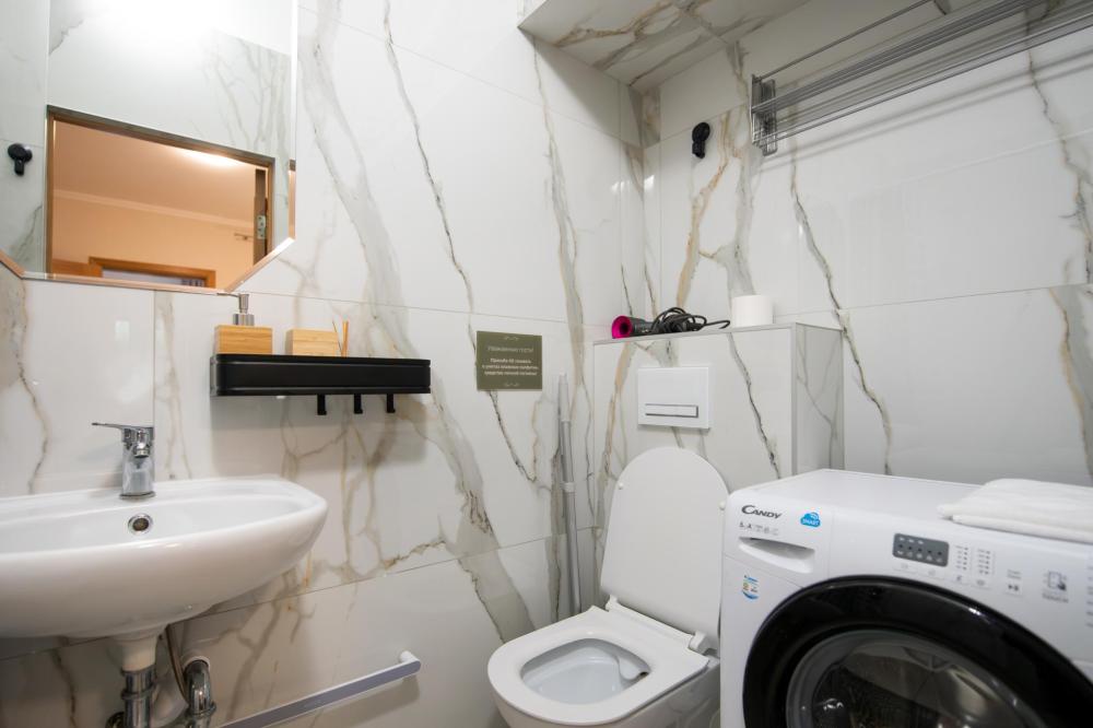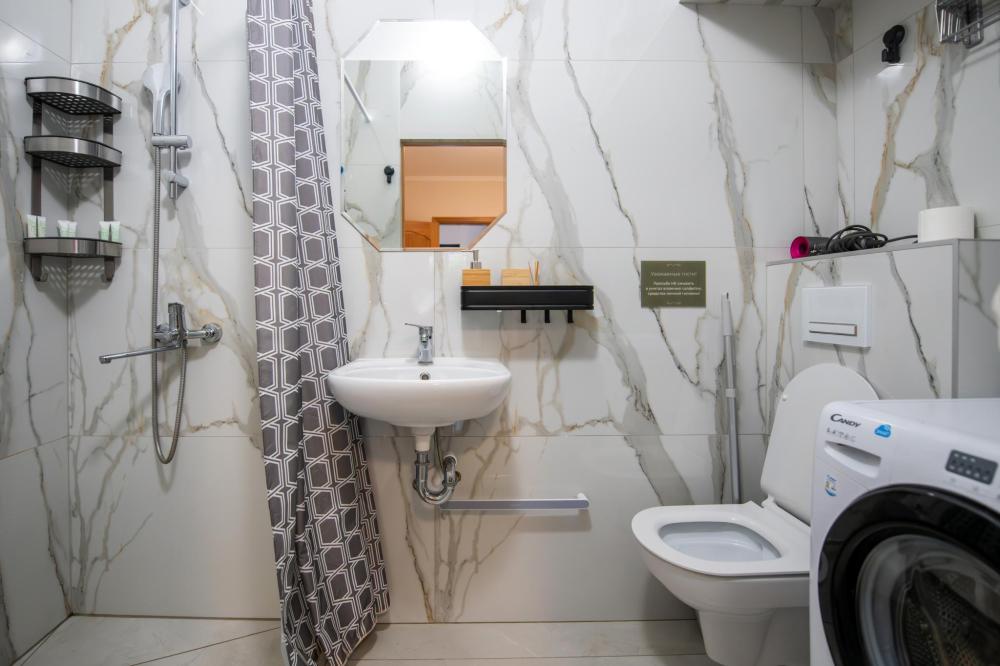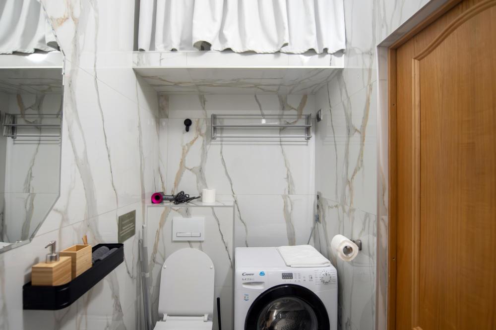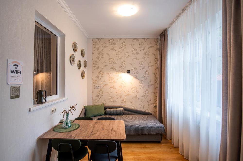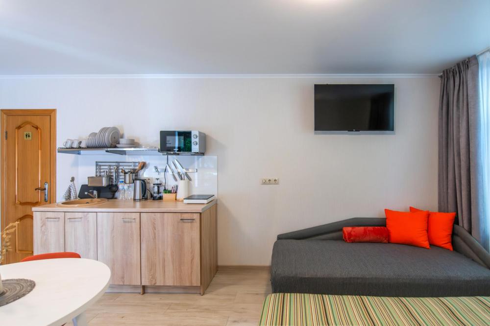 Квартира - студия с отдельным входом. Чайник, обеденный стол, индукционная плита, стиральная машина, фен, ТV, Wifi, средства личной гигиены, тапочки.