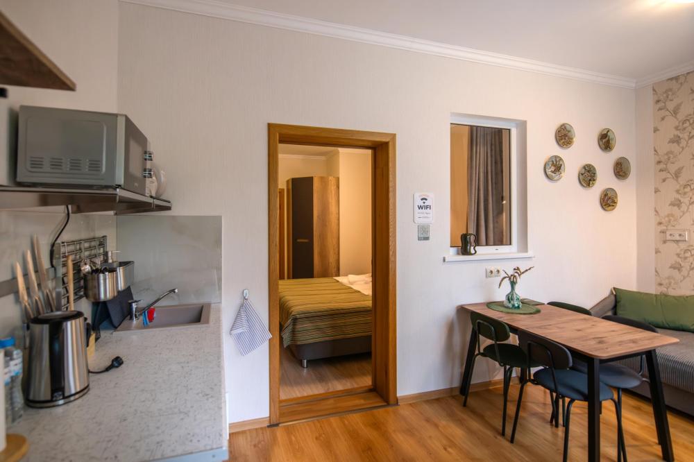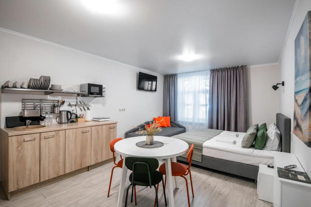 Квартира - студия с отдельным входом. Кухонная и обеденная зона(отделена дверью от спальни), чайник, большой обеденный стол, индукционная плита, стиральная машина, фен, ТV, Wifi, средства личной гигиены.