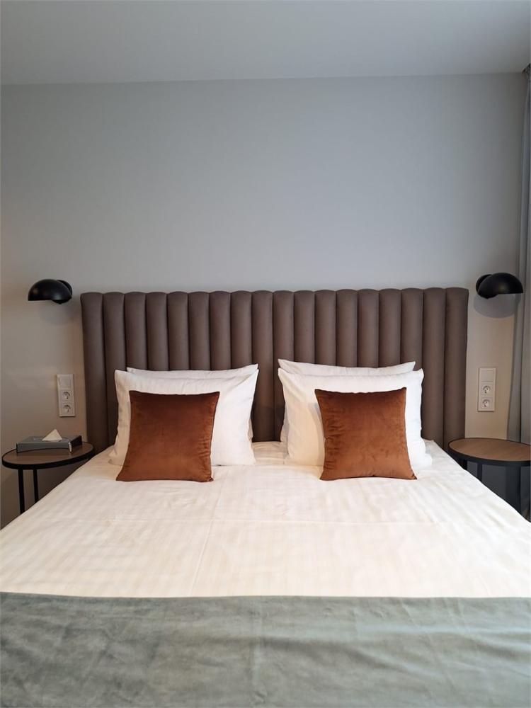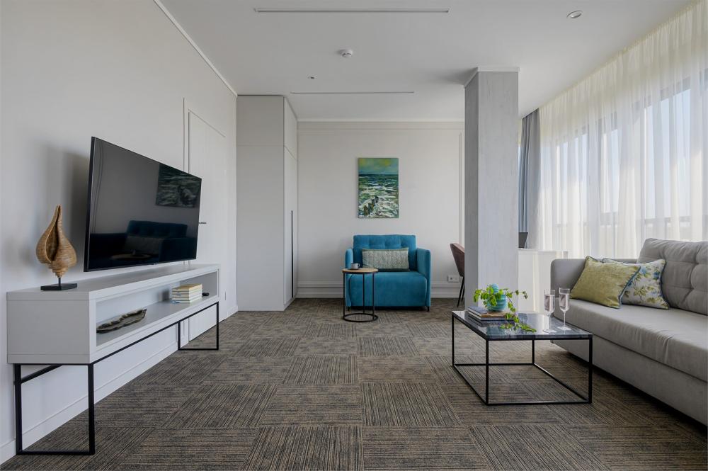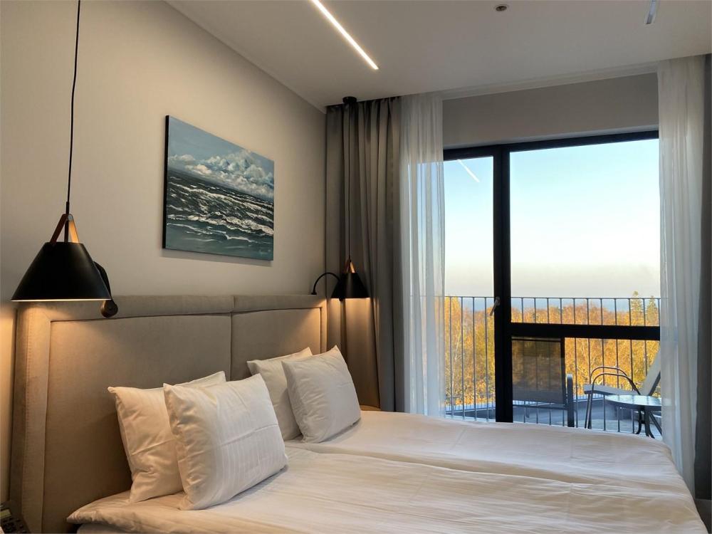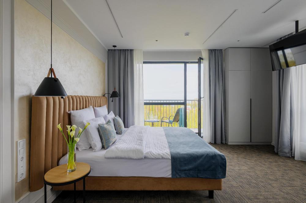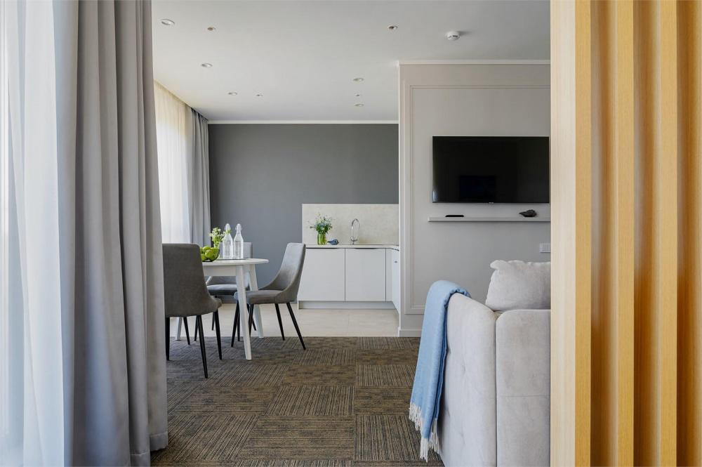 Просторный двухкомнатный номер площадью от 40 до 54 кв.м. Одинаково комфортен как для отдыха, так и для проведения деловых встреч. Номера оборудованы двуспальной кроватью типа "King size" или двумя односпальными. В комнате могут разместиться до 4-х человек. Также есть возможность установить детскую кроватку. В данной категории номера с террасой.