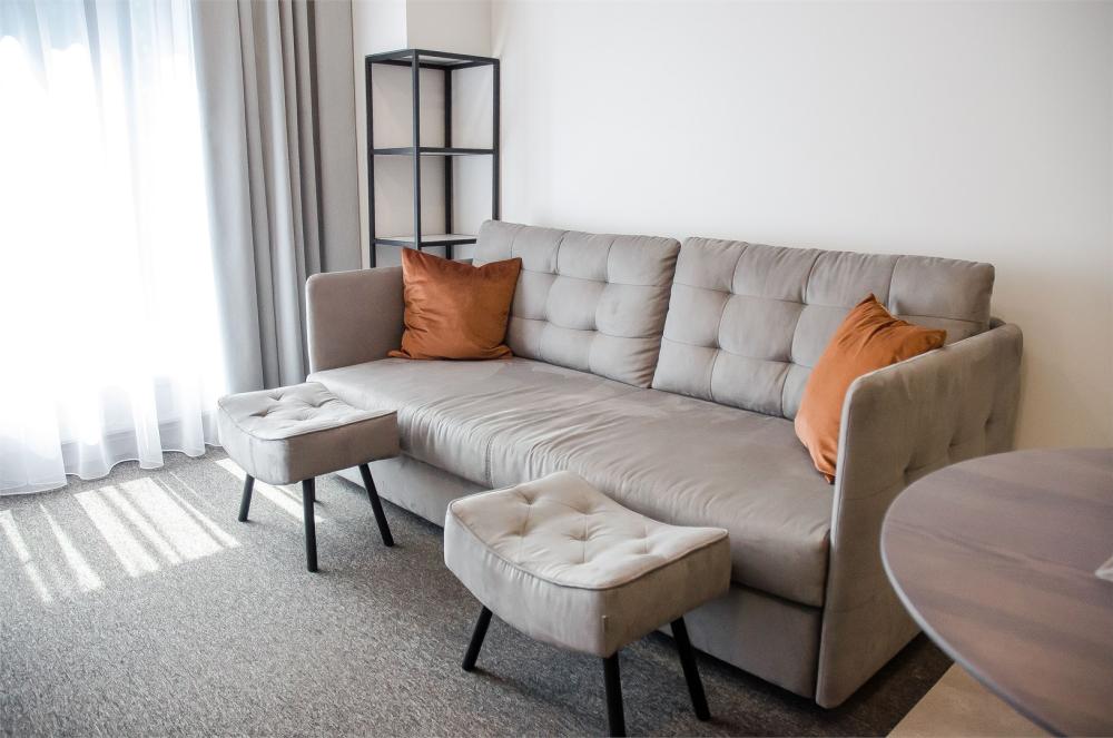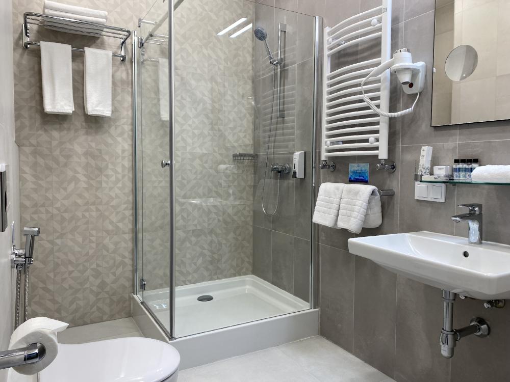Большой номер площадью 35 кв.м с видом на город, который будет удобен для проживания до 4-х человек. В номерах есть двуспальная кровать типа "King size" или две односпальные. Дополнительно установлен диван. Также можно установить детскую кроватку. Все номера оборудованы балконом.