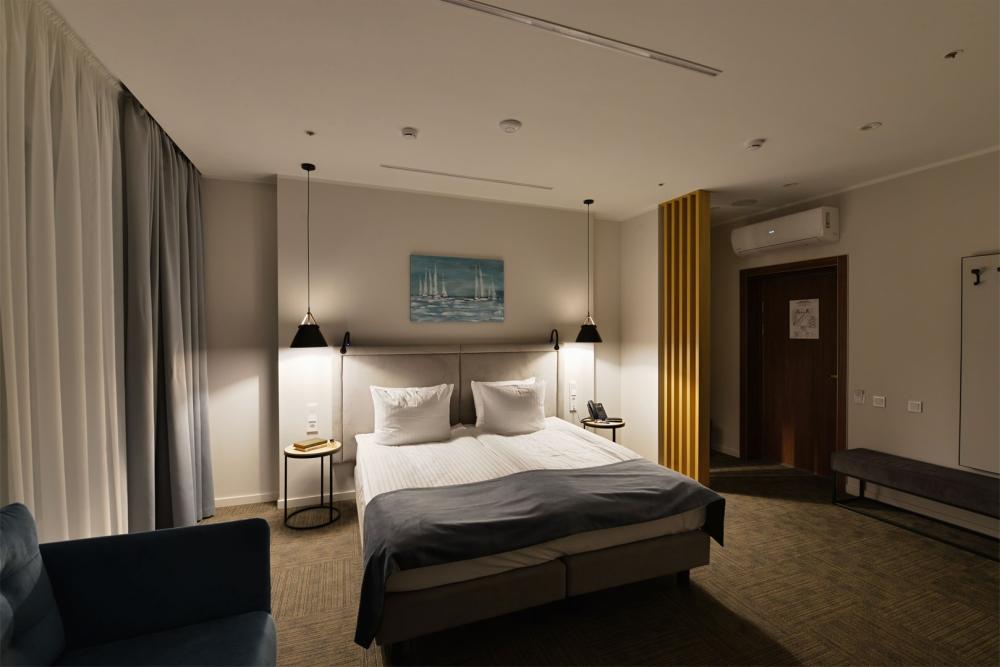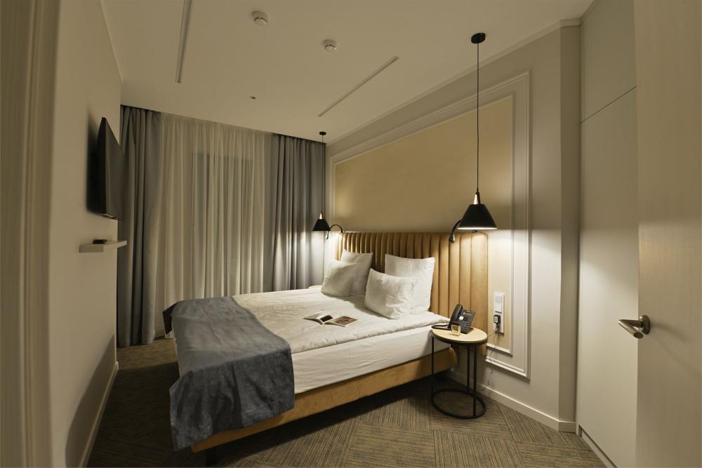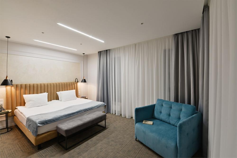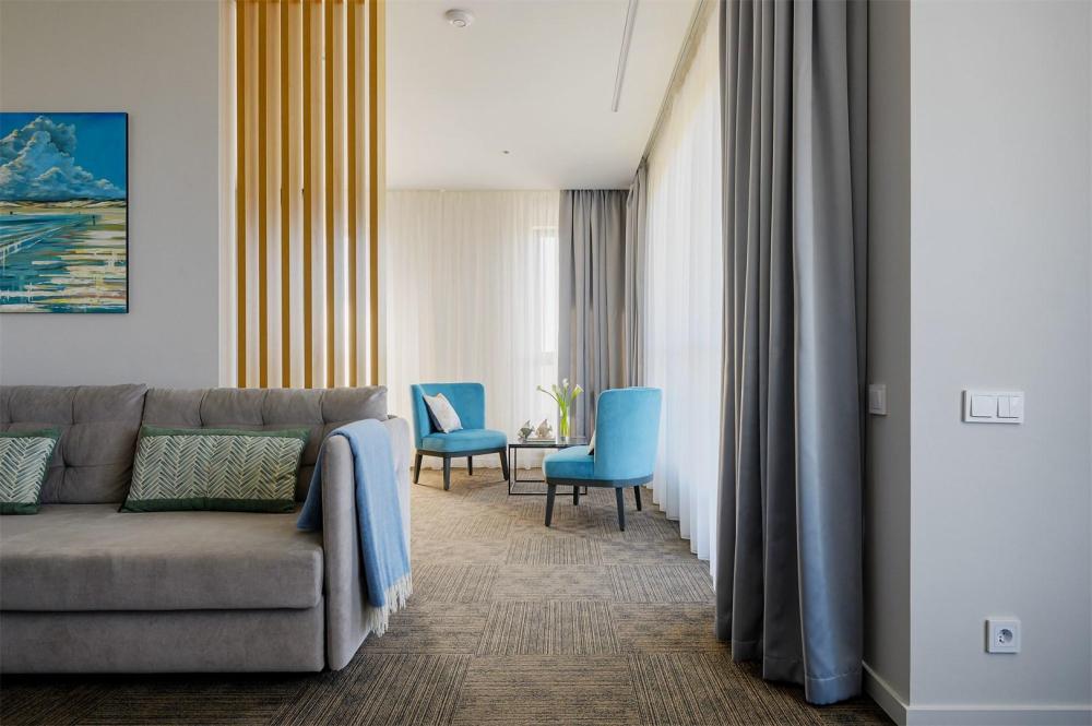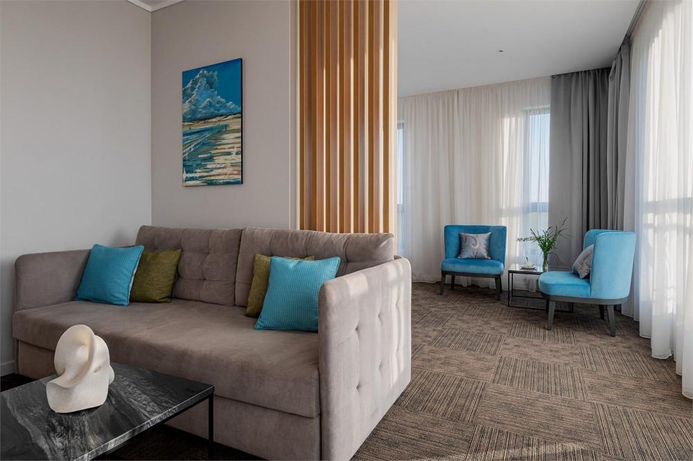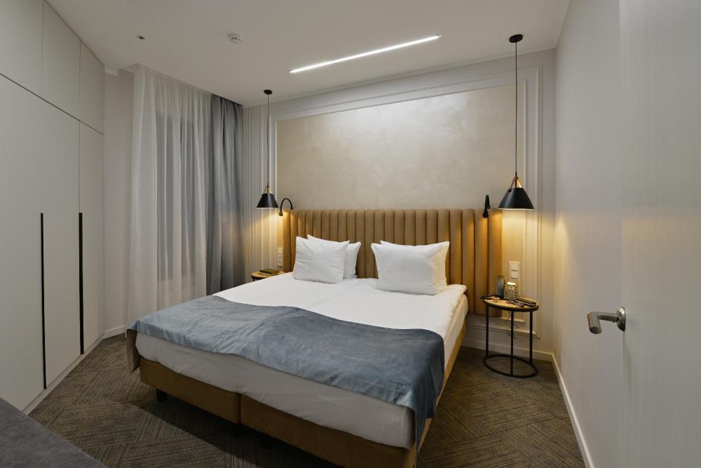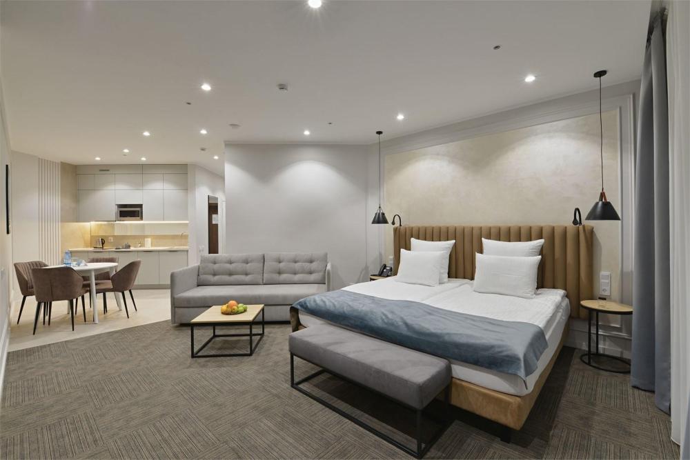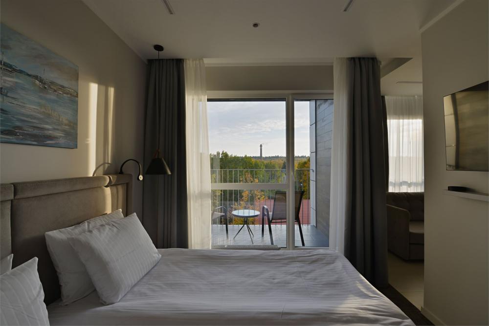 Просторный двухкомнатный номер площадью от 40 до 54 кв.м. Одинаково комфортен как для отдыха, так и для проведения деловых встреч. Номера оборудованы двуспальной кроватью типа "King size" или двумя односпальными. В комнате могут разместиться до 4-ёх человек. Также есть возможность установить детскую кроватку. Большинство номеров имеют балкон.