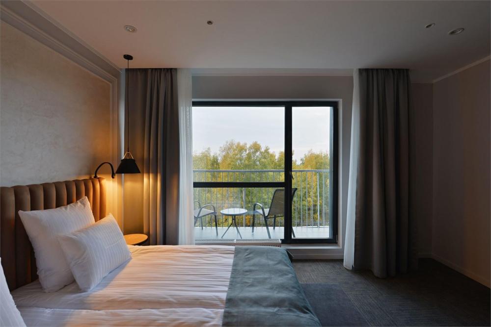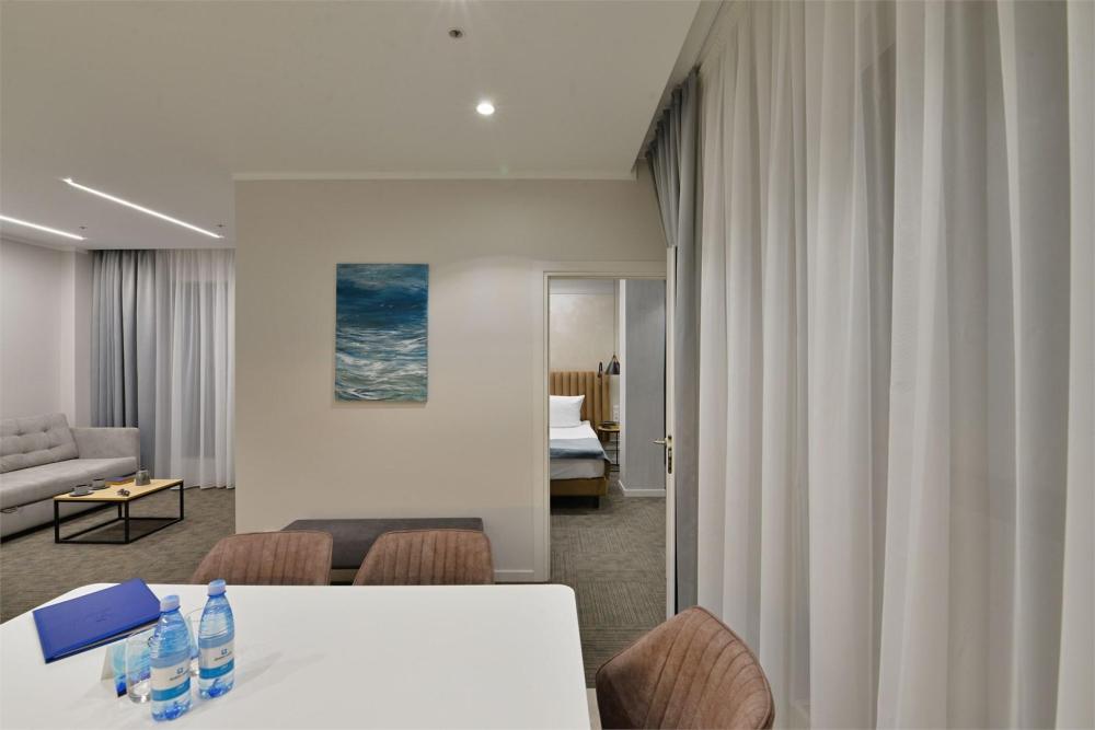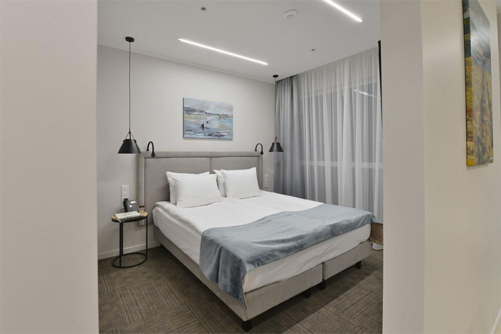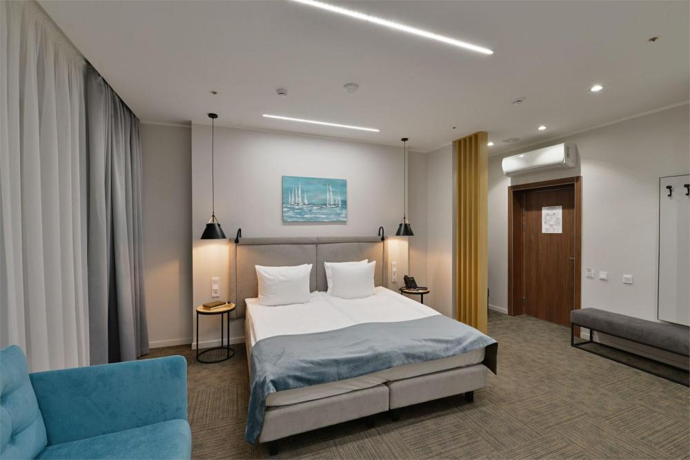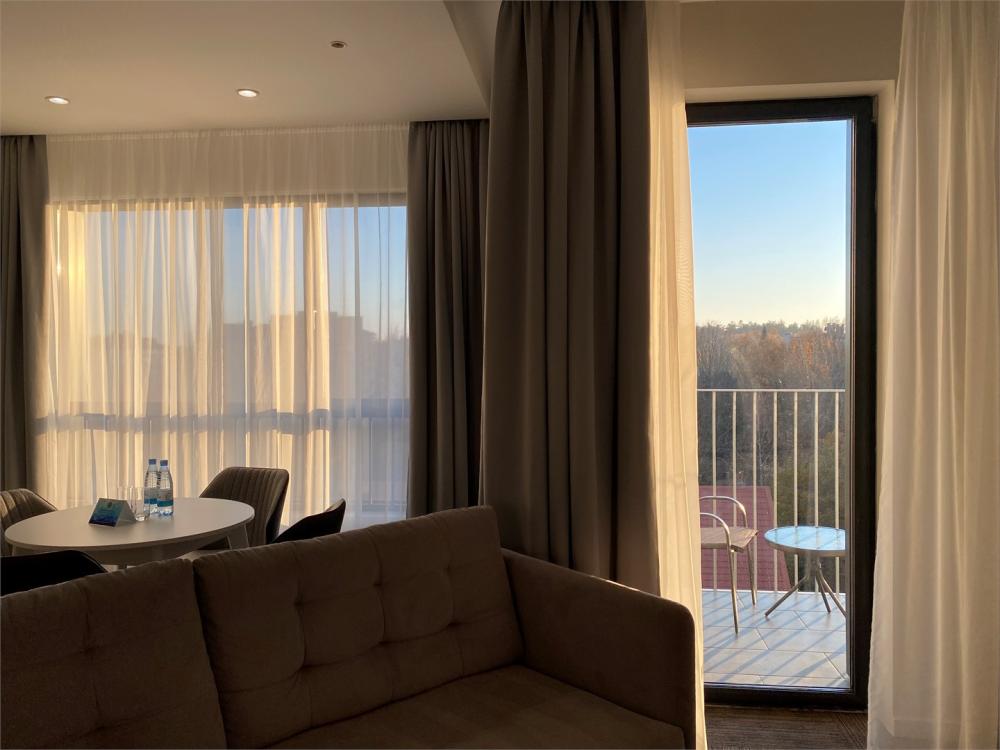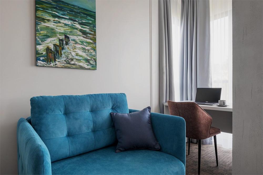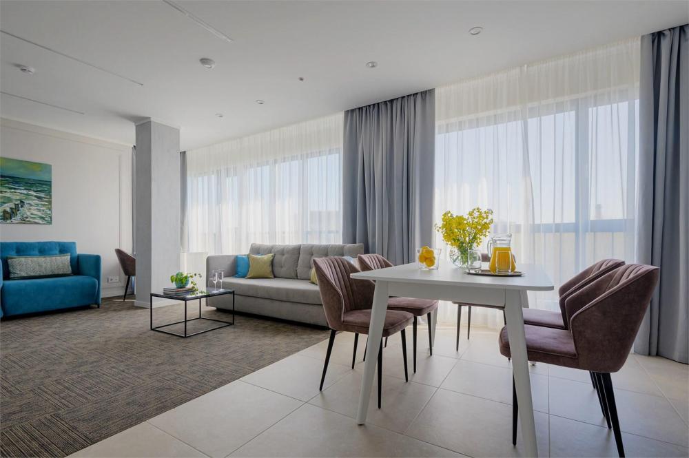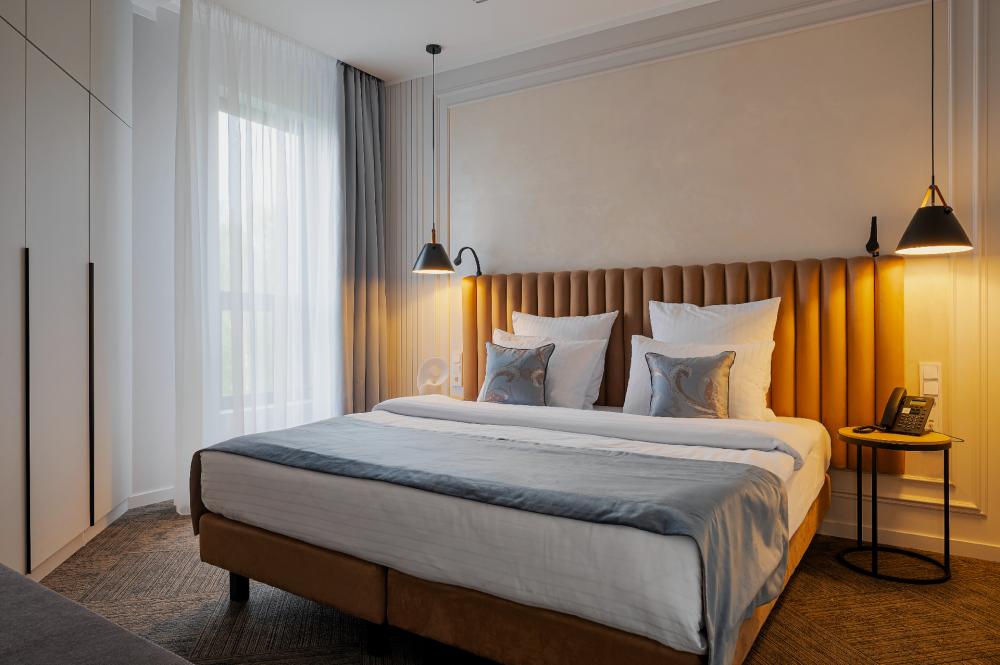 Просторный двухкомнатный номер площадью от 40 до 54 кв.м. Одинаково комфортен как для отдыха, так и для проведения деловых встреч. Номера оборудованы двуспальной кроватью типа "King size" или двумя односпальными. В комнате могут разместиться до 4-ёх человек. Также есть возможность установить детскую кроватку. Большинство номеров имеют балкон.