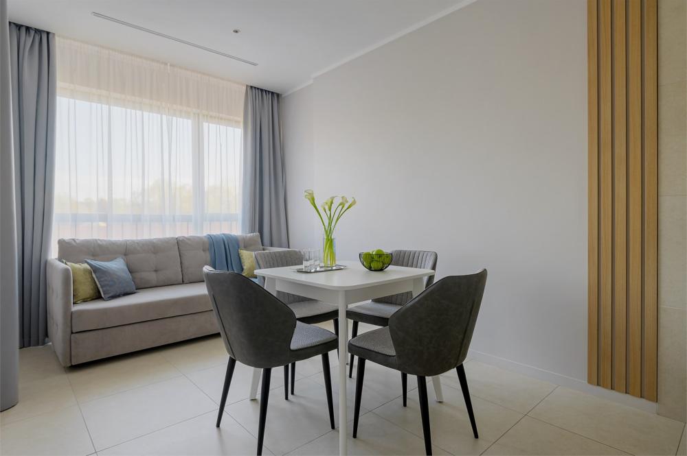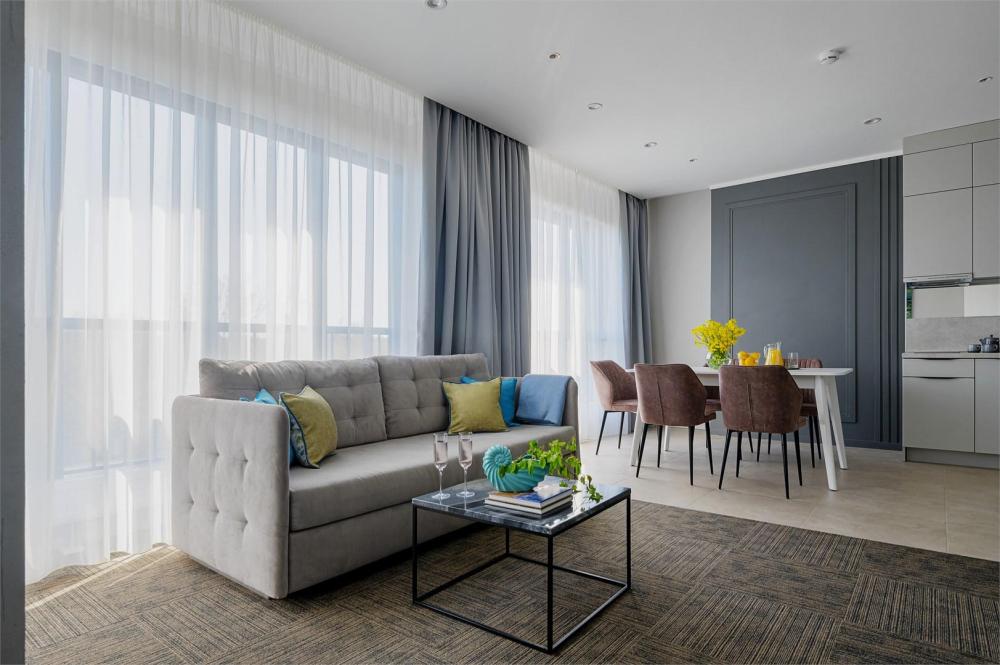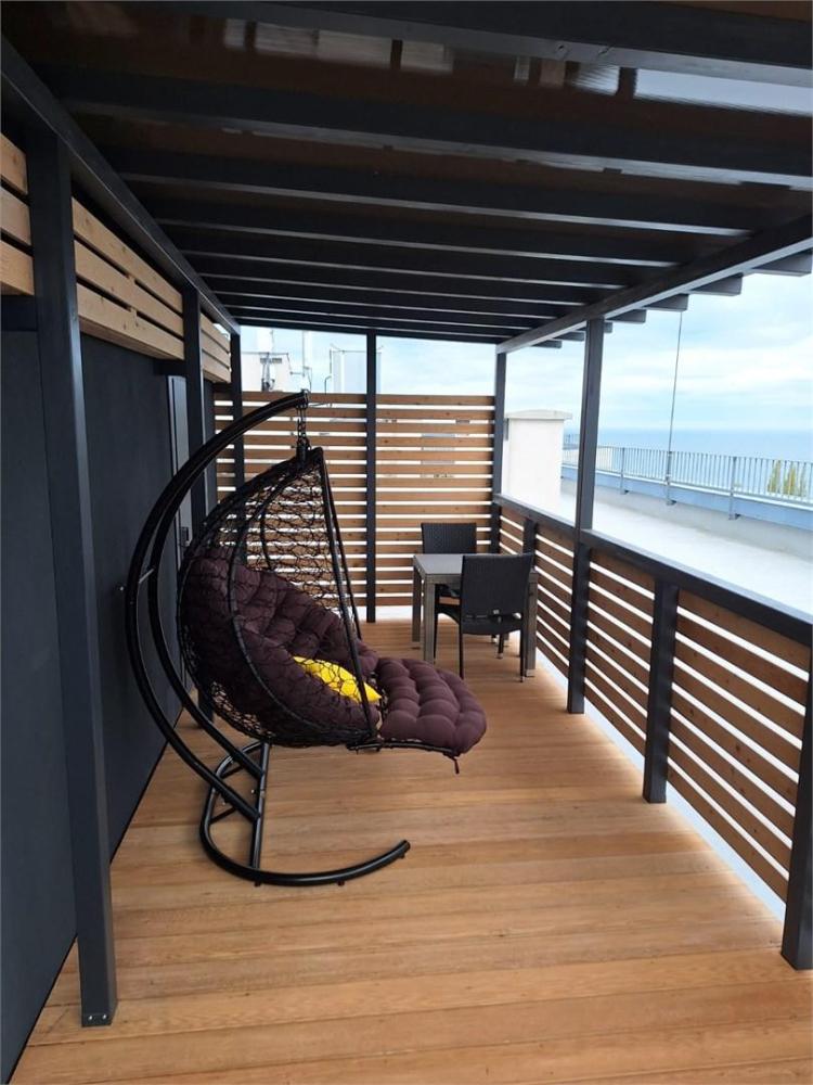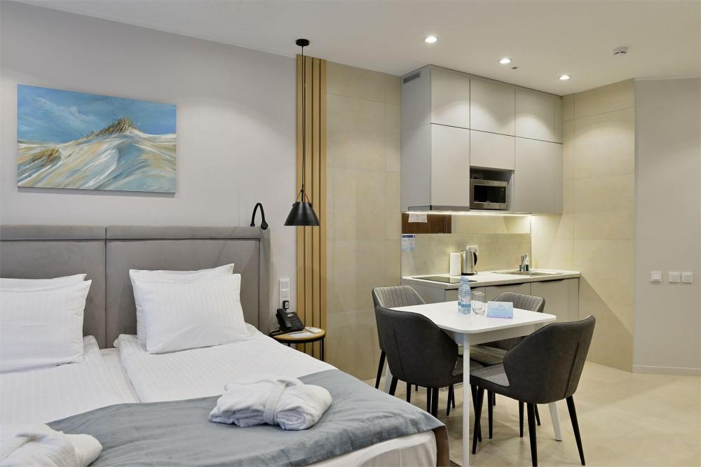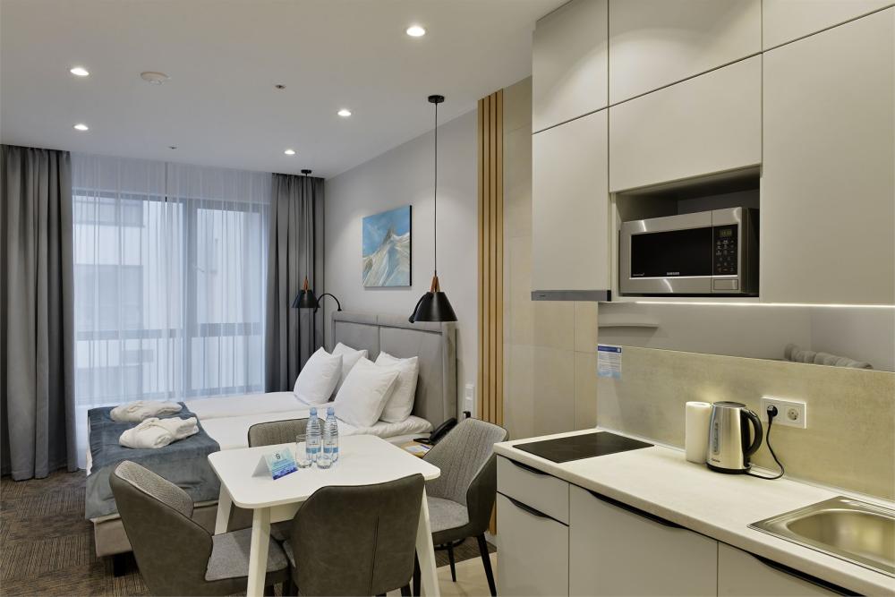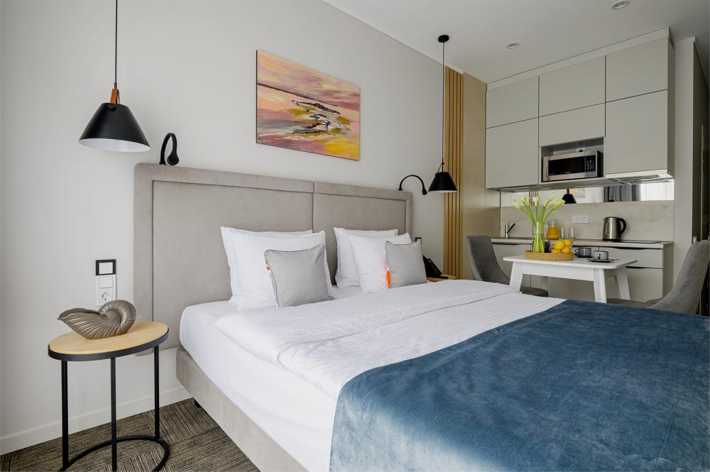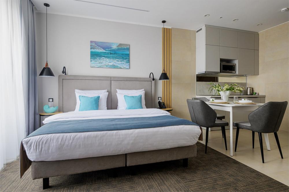 Студия, площадью 20 кв.м., расположенная на самом высоком этаже отеля является отличным вариантом размещения для гостей, путешествующих вдвоем. Стильный и эргономичный интерьер, кровать Queen size, мини-кухня - здесь предусмотрено все, что нужно для полноценного отдыха и комфортного проживания. «Визитной карточкой» номера является индивидуальная крытая терраса, площадью 15 кв.м, с видом на море и комфортабельной мебелью.