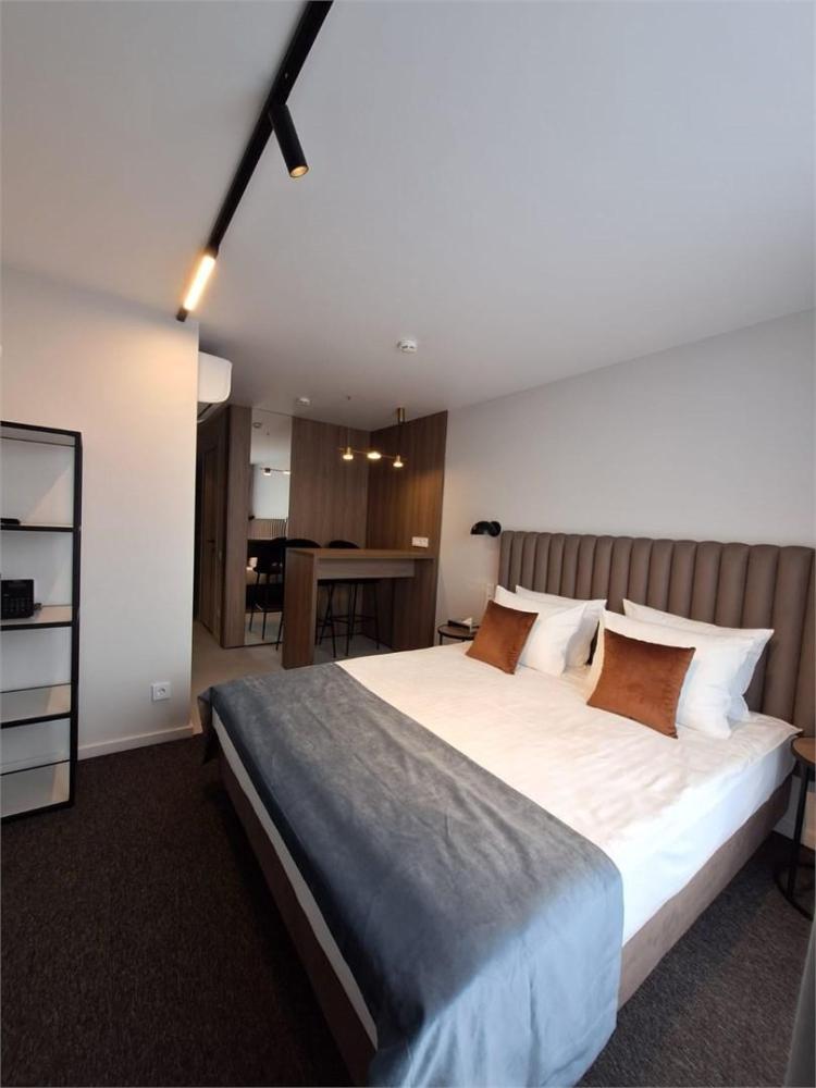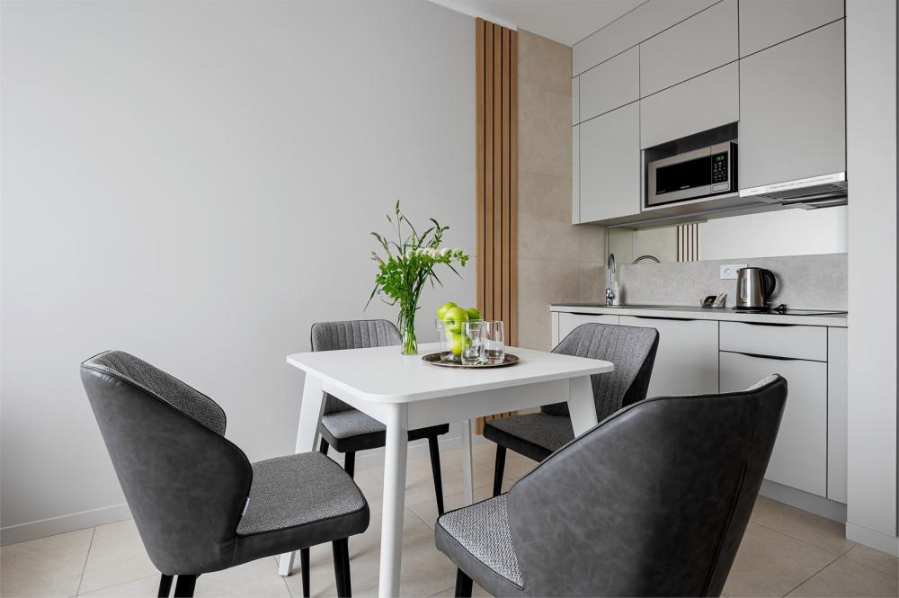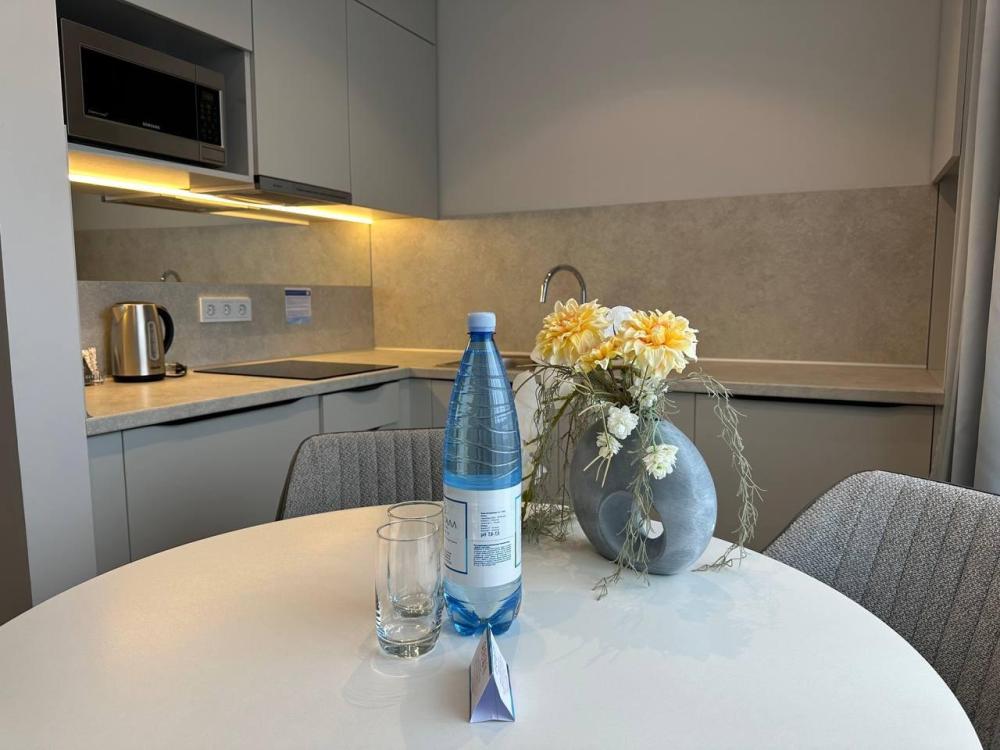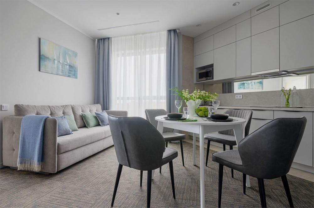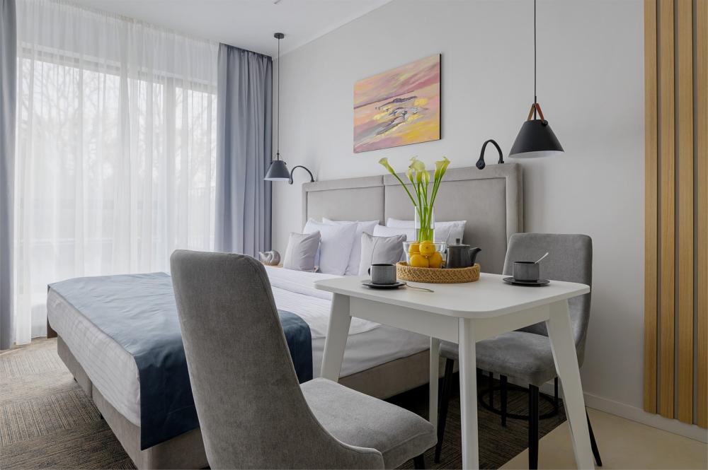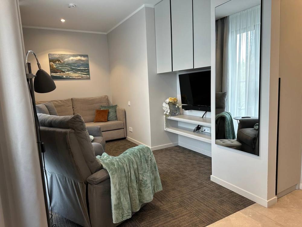 Студия, площадью 20 кв.м., расположенная на самом высоком этаже отеля является отличным вариантом размещения для гостей, путешествующих вдвоем. Стильный и эргономичный интерьер, кровать Queen size, мини-кухня - здесь предусмотрено все, что нужно для полноценного отдыха и комфортного проживания. «Визитной карточкой» номера является индивидуальная крытая терраса, площадью 15 кв.м, с видом на море и комфортабельной мебелью.