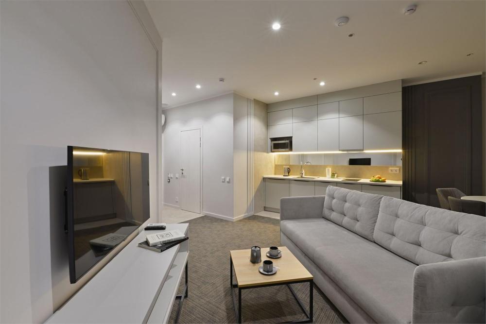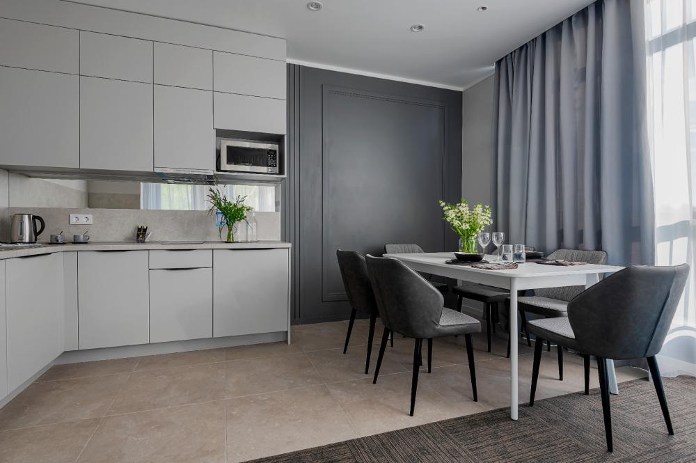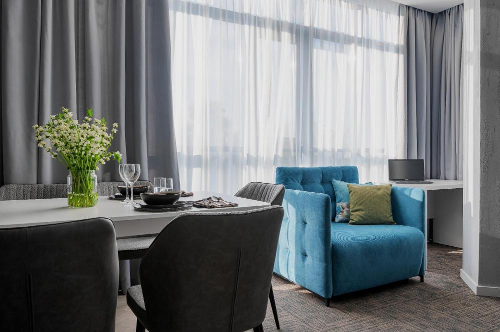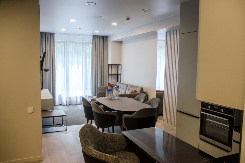 Семейный номер площадью в 97 кв. м с видом на парк и город. Располагается на 2-ом этаже отеля. Идеальный вариант для гостей, которые предпочитают отдыхать всей семьей. 3 спальни, гостиная, кухонная зона, оснащенная всем необходимым оборудованием, 2 сан узла, оборудованные душевой кабиной и ванной, а также современный стильный интерьер.