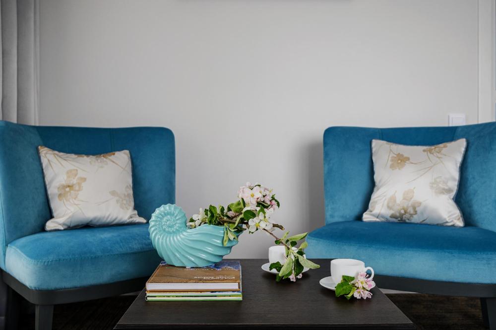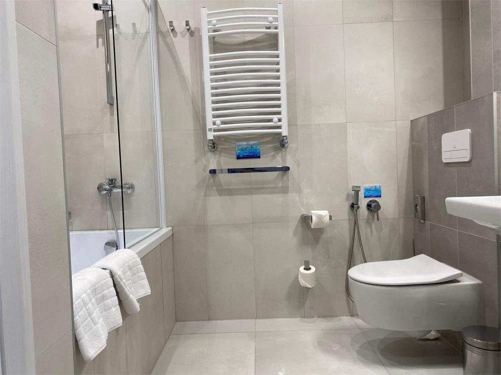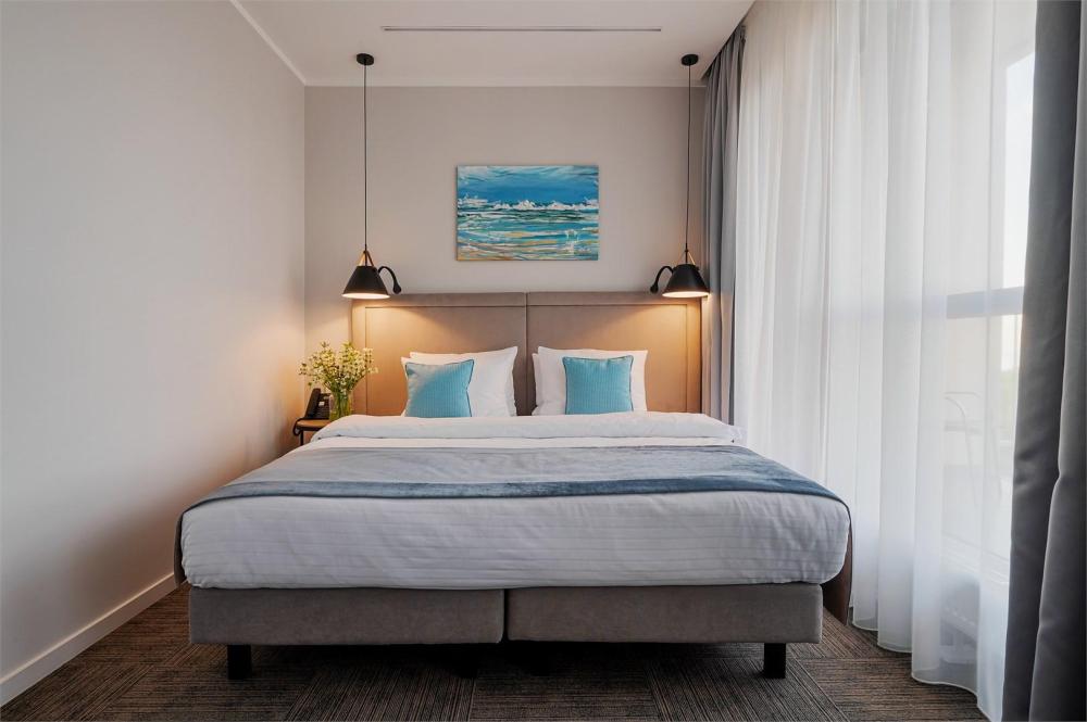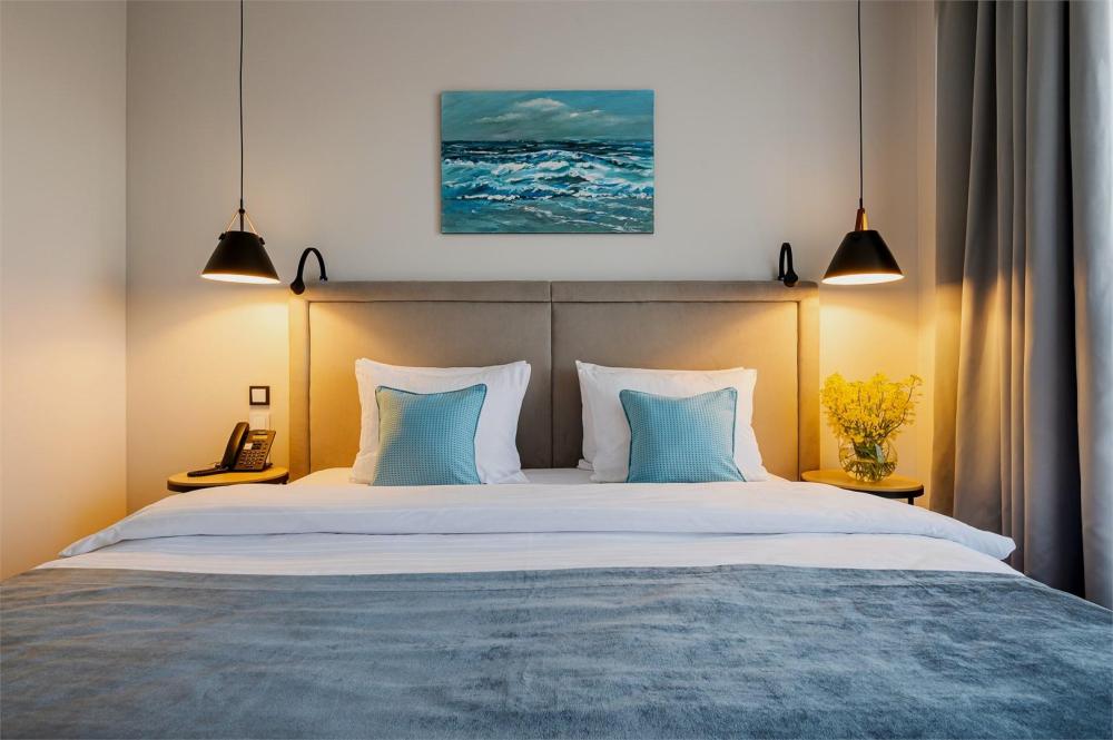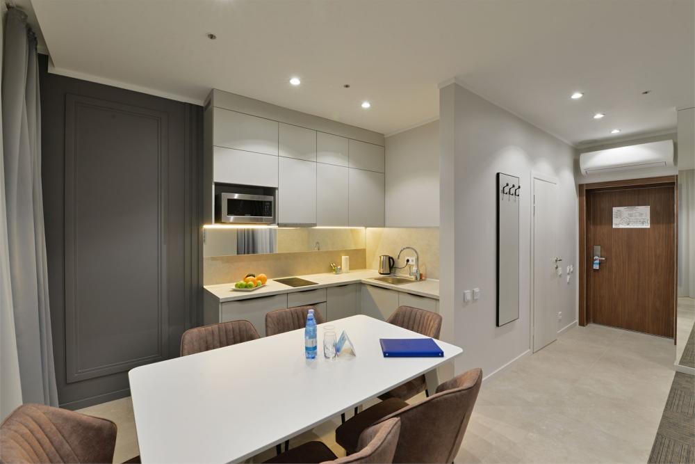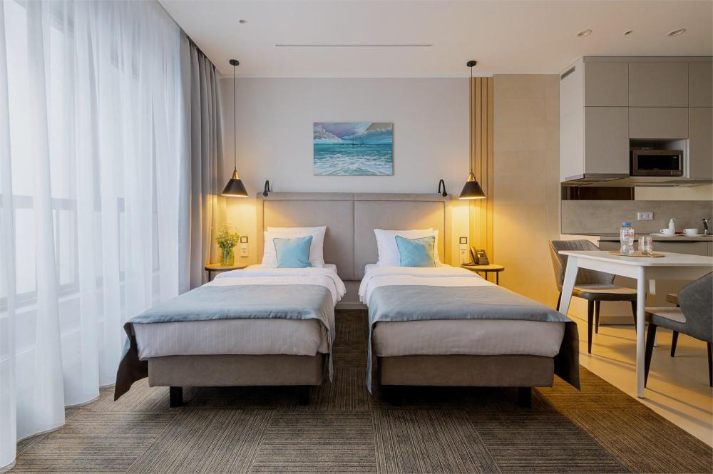 Двухкомнатный номер площадью 39 кв.м, расположен на шестом этаже отеля, с видом в сторону моря. Вместительность до 4 человек. В номере есть балкон, мини-кухня, массажер для ног YAMAGUCHI. Также оборудован двуспальной кроватью типа "Super King Size" или двумя односпальными, а так же двуспальным раскладным диваном-кровать.
