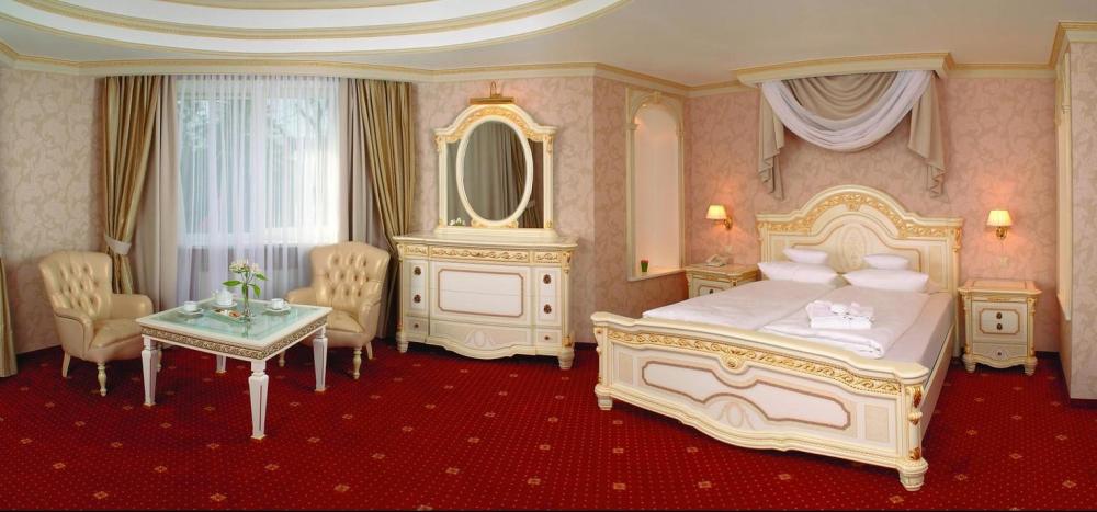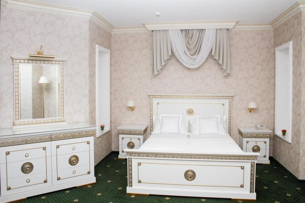 Люкс на 2 персоны с дополнительным местом. В номере: спальная и жилая зона, двуспальная кровать, диван, два кресла, журнальный столик, прикроватные тумбочки, стол, стул, ЖК телевизор, спутниковые каналы, кондиционер, отопление, ковровое покрытие, телефон, Wi-Fi с бесплатным доступом в Интернет, холодильник, мини-бар, посуда, зеркало, шкаф/гардероб, система электронных замков. В ванной: ванна туалет, биде, раковина, вентилятор, средства индивидуальной гигиены, халат, набор полотенец, тапочки, зеркало, фен. Услуга «звонок-будильник».