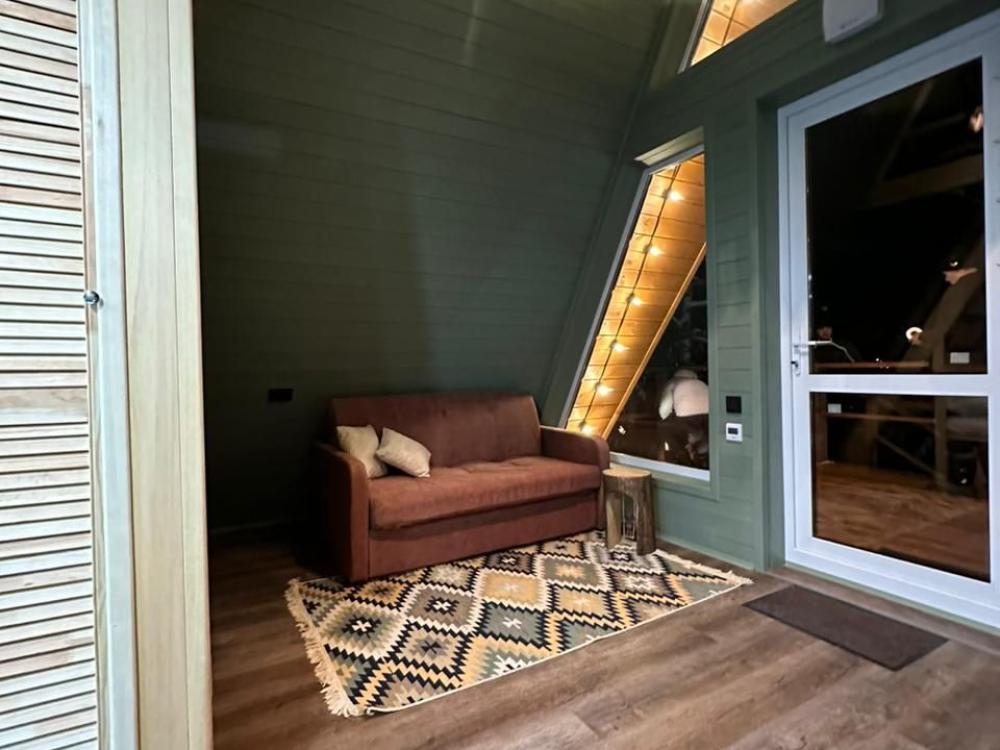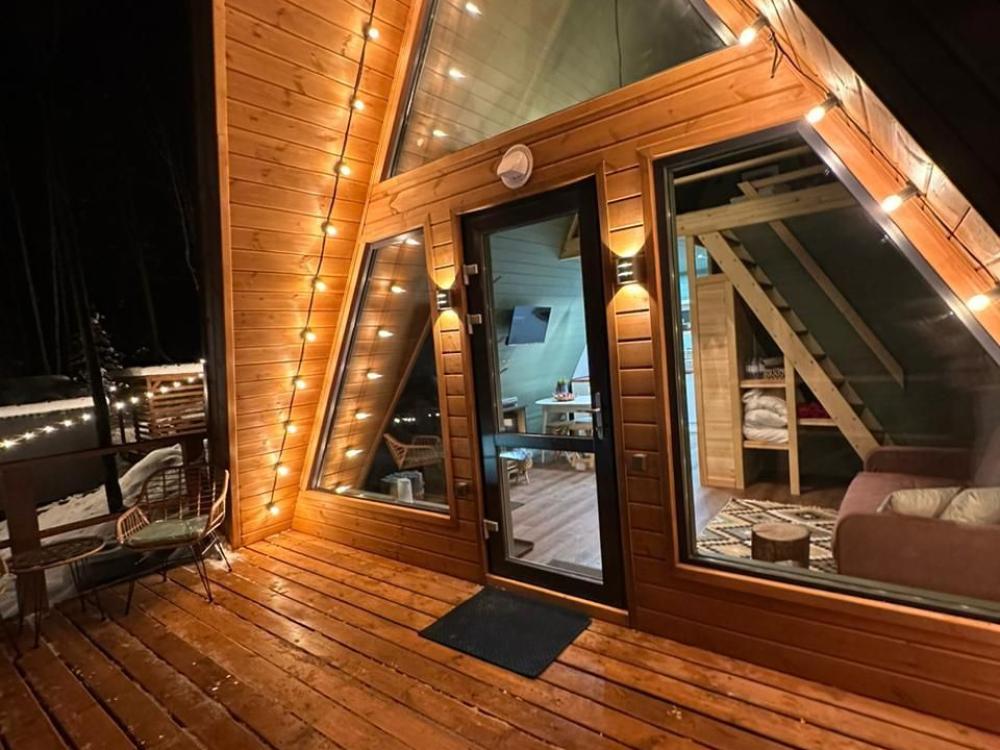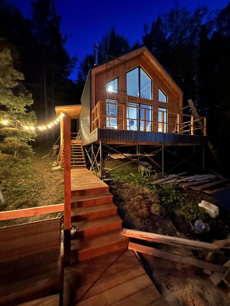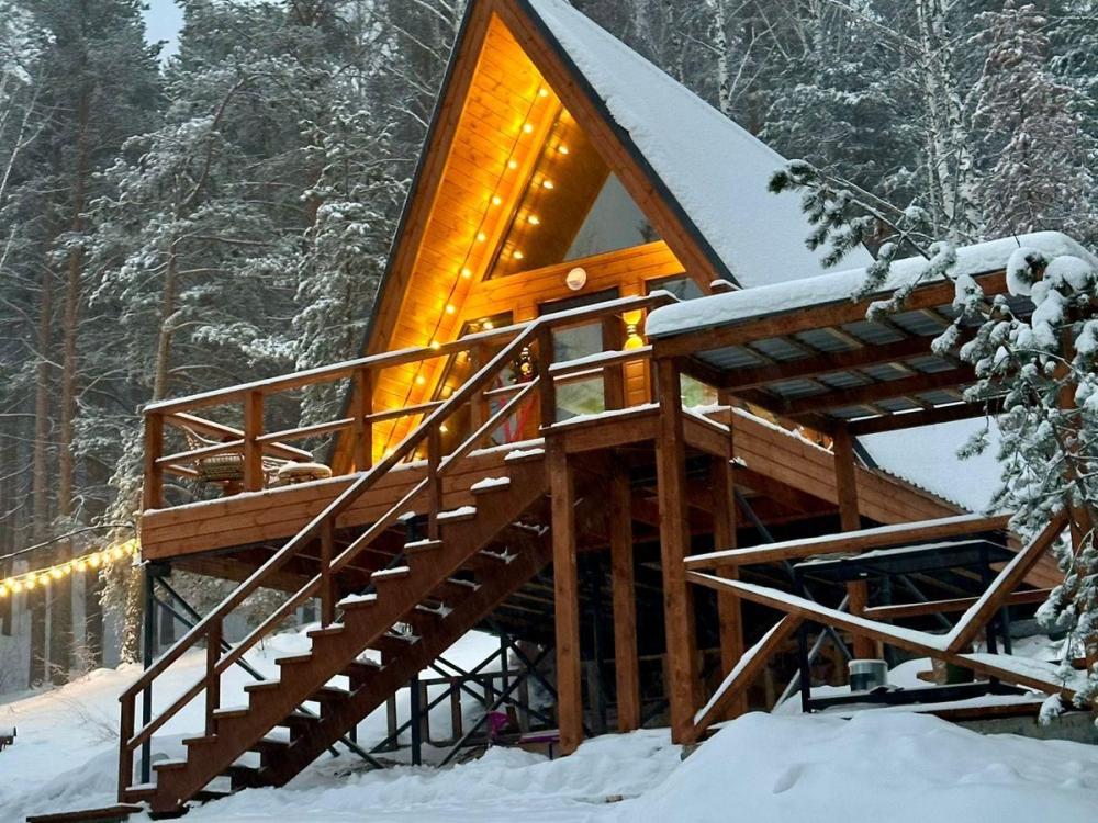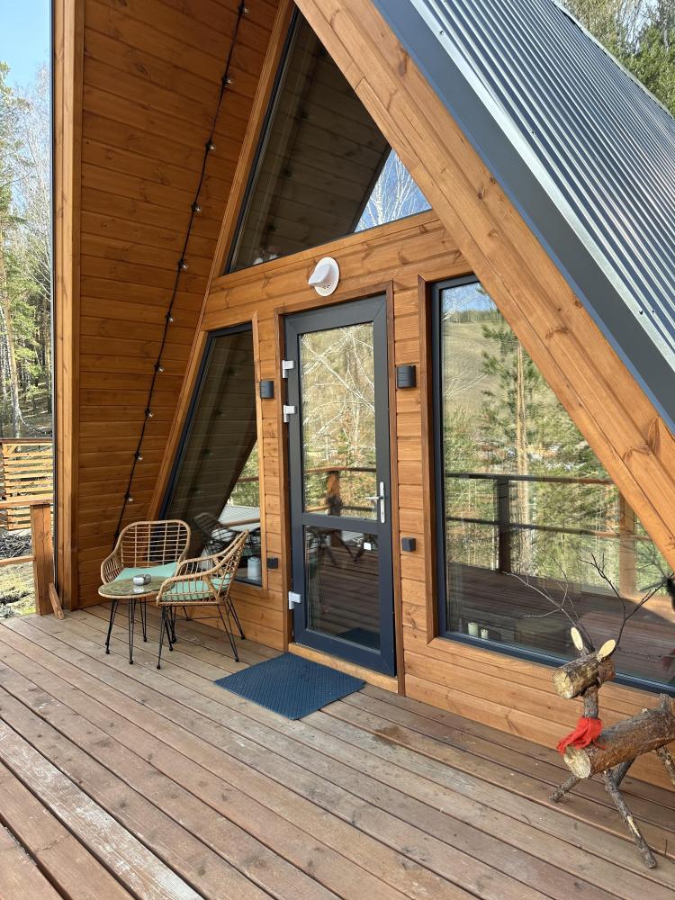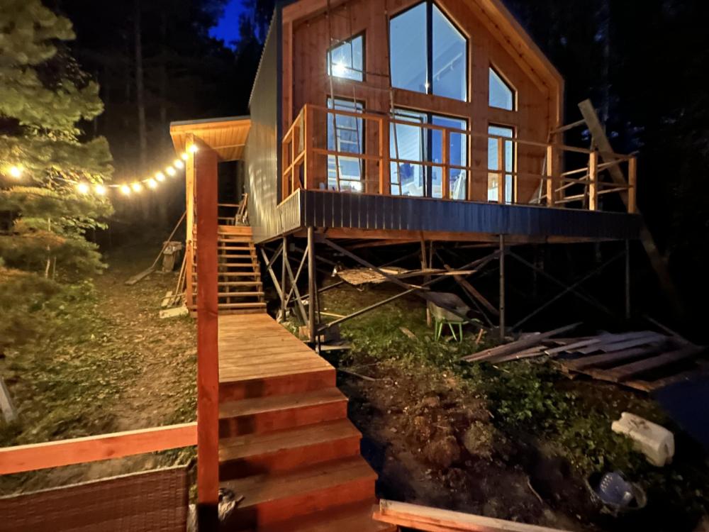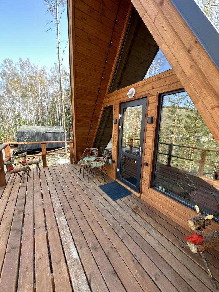 Треугольный дом в стиле А-фрейм с панорамным остеклением и шикарным видом. Спальня на антресоли, второй свет, камин, кухня, санузел диван, большая терраса. Тихое место в окружении леса и гор.