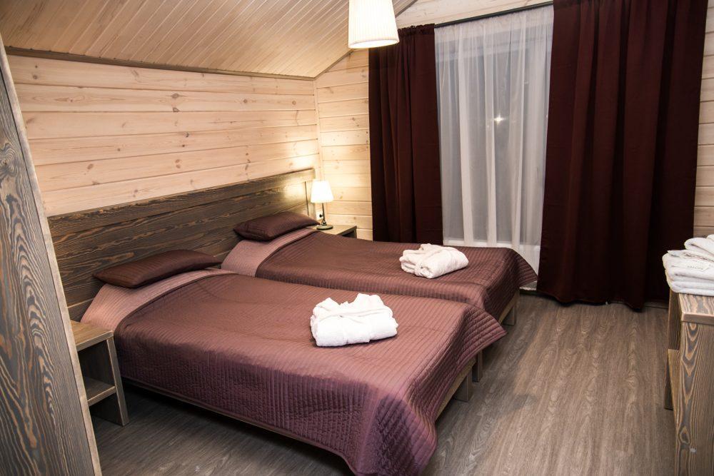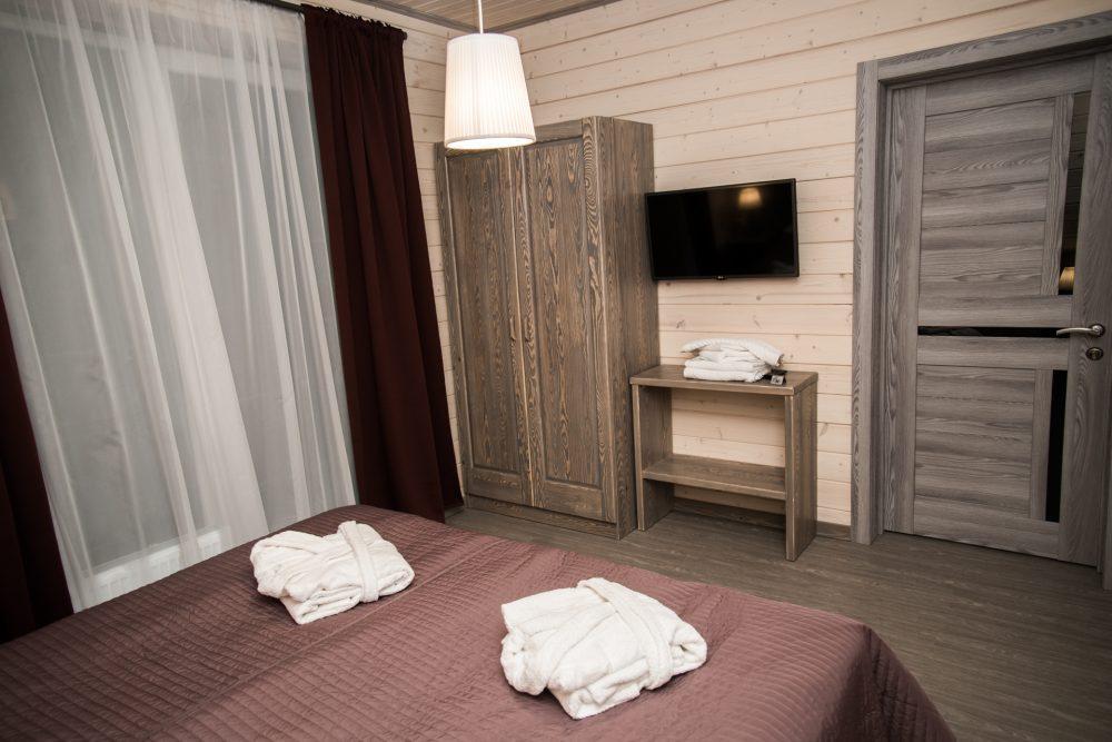 Однокомнатный номер 26 - 30 кв.м. с кухонной зоной. В номере 2 односпальные кровати (с возможностью объединения топпером в 1 двуспальную - по запросу), ТВ - панель. Кухонная зона оборудована варочной панелью, холодильником, чайником, столовой посудой и столовыми приборами, посудой для приготовления еды. Ванная комната с душевой кабиной и феном.