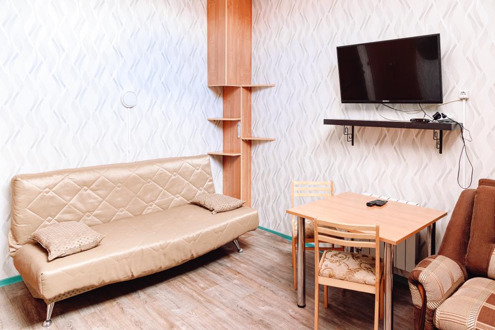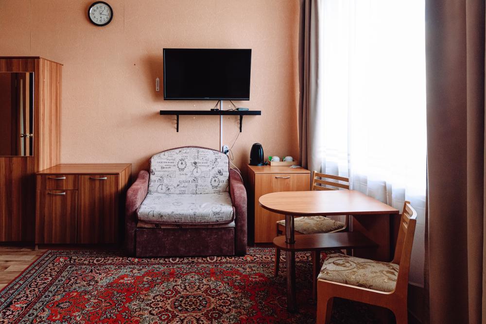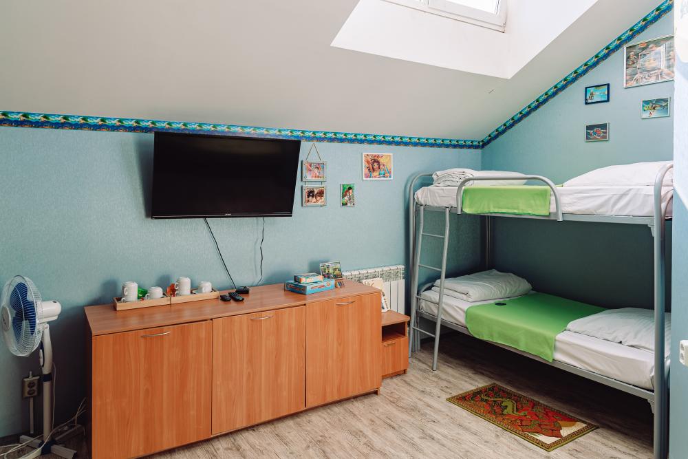 Двухкомнатный Хостел на 10 мест, расположенный на мансардном этаже. В номере: Душ, туалет, двухъярусные кровати, два телевизора, холодильник, чайник, посуда, полотенца, одноразовые тапочки, одноразовые средства гигиены.