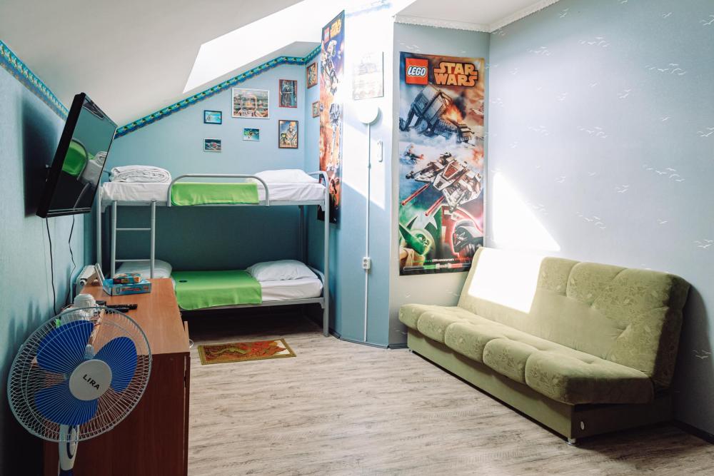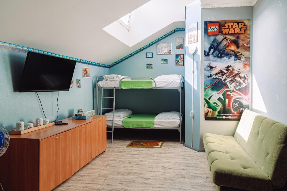 Просторный семейный номер, с детской зоной в стиле LEGO, вместимостью до 6 человек. В номере имеется двуспальная кровать, раскладной диван и двухъярусная кровать. Телевизор, холодильник, настольные игры, детские книги и раскраски. Чайник, чайные приборы. Чай, сахар предоставляется комплиментарно в день заезда.