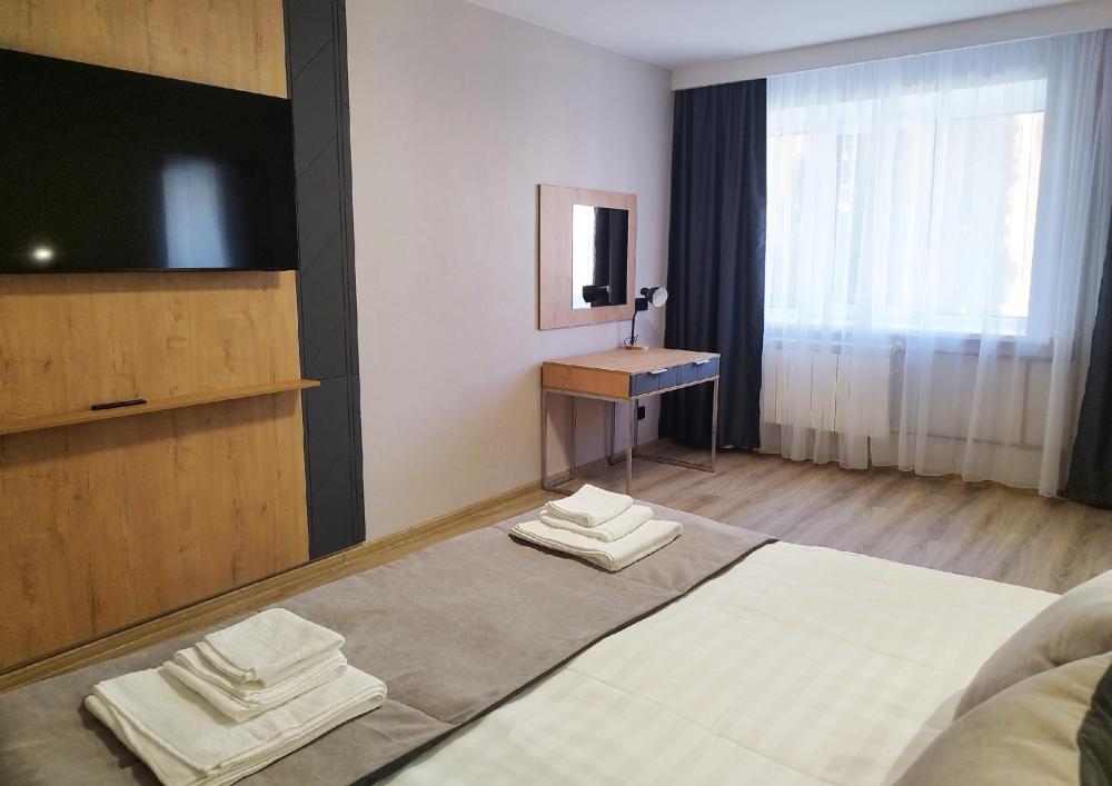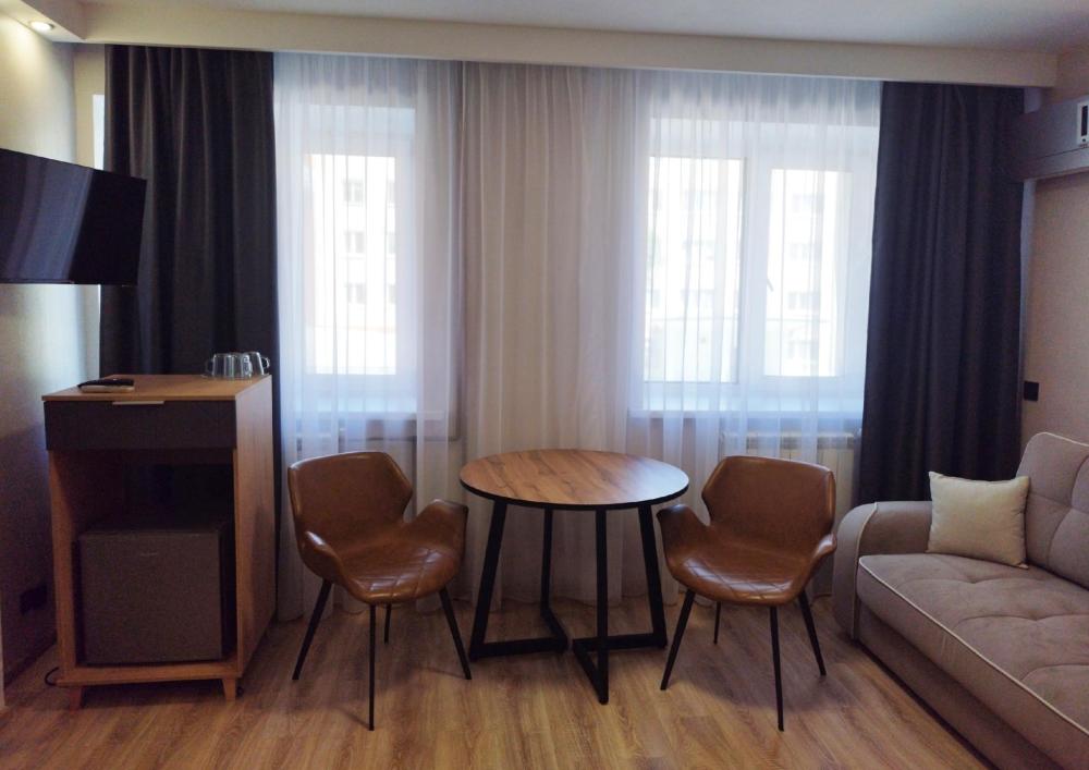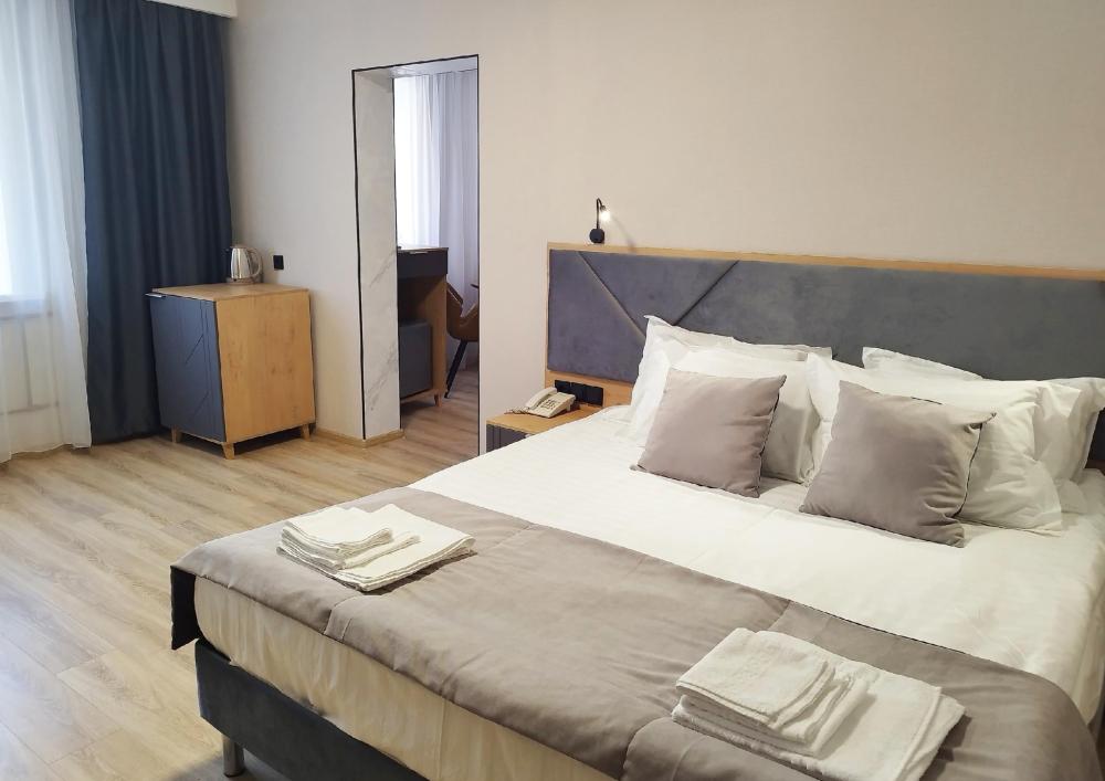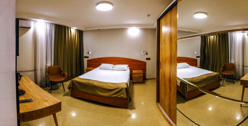 Номер состоит из двух комнат: спальни, гостиной и прихожей с встроенным шкафом и холодильником. Гостиная представляет собой комнату отдыха с мягкой мебелью, телевизором, журнальным столиком, мягким освещением, кондиционером. В спальне установлена двуспальная кровать и прикроватные тумбочки, туалетный столик с зеркалом, комод. В ванной комнате: ванна, раковина, унитаз, фен, комплект полотенец, туалетные принадлежности.