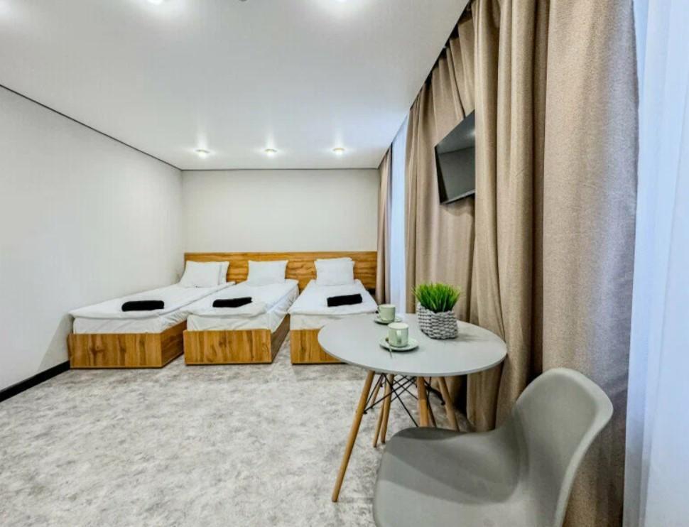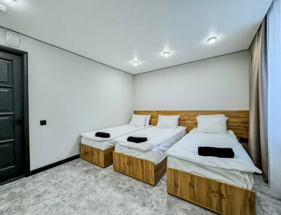Двухкомнатный номер со всеми удобствами, возможно размещение на двуспальной кровати + 1 односпальная либо на трех односпальных кроватях. В номере есть кондиционер, телевизор, предоставляется чайник, холодильник. Номер оснащен душем.