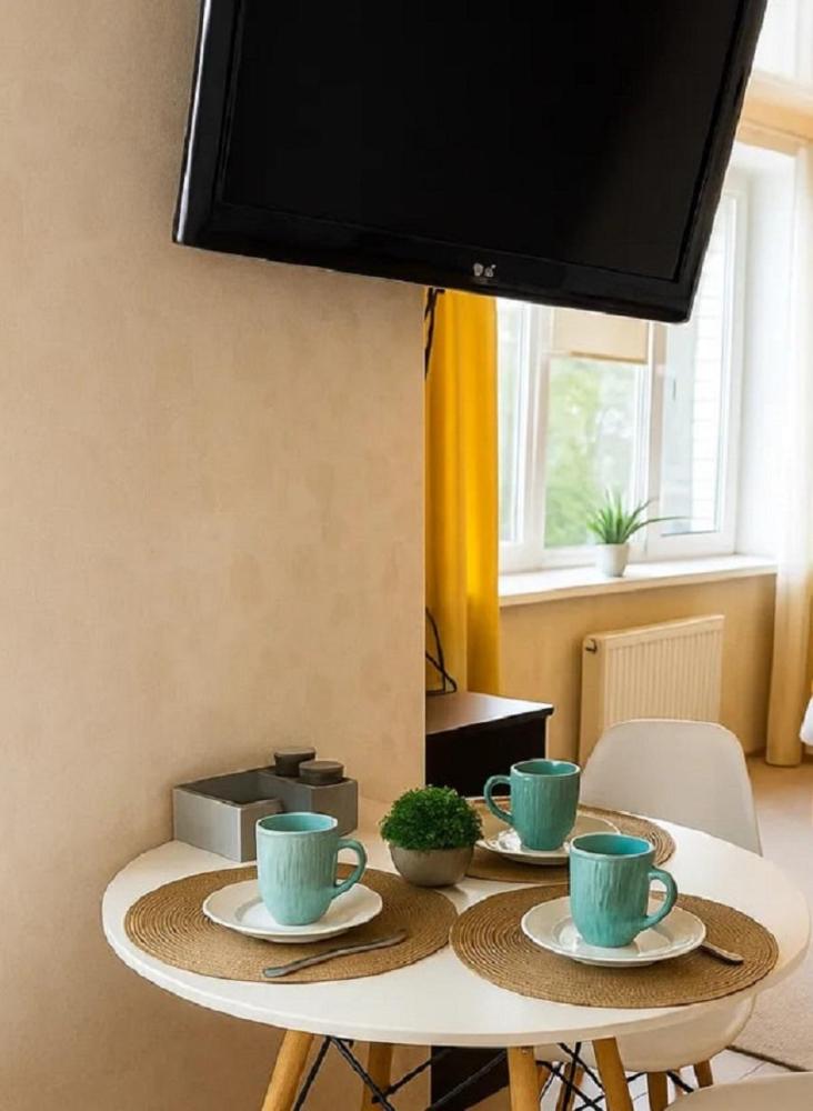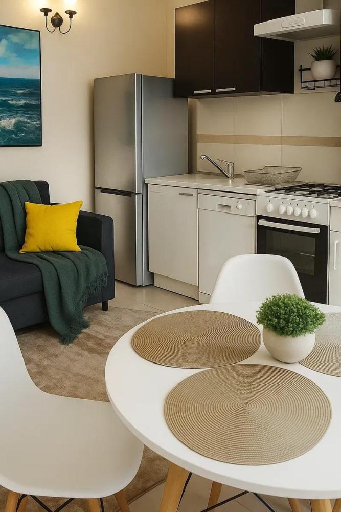 Диван и двуспальная кровать. Оборудованная кухня с техникой: холодильник, газовая плита, духовой шкаф, микроволновка, посудомоечная машина, чайник, посуда, чай, сахар. Собственная ванная комната: полотенца на каждого гостя банные и лицевые, средства гигиены, фен, водонагреватель. Предоставляется постельное белье. Также в апартаментах телевизор с выходом в интернет, wi-fi, кондиционер, пылесос, гладильная доска, утюг. Для курящих есть балкон.