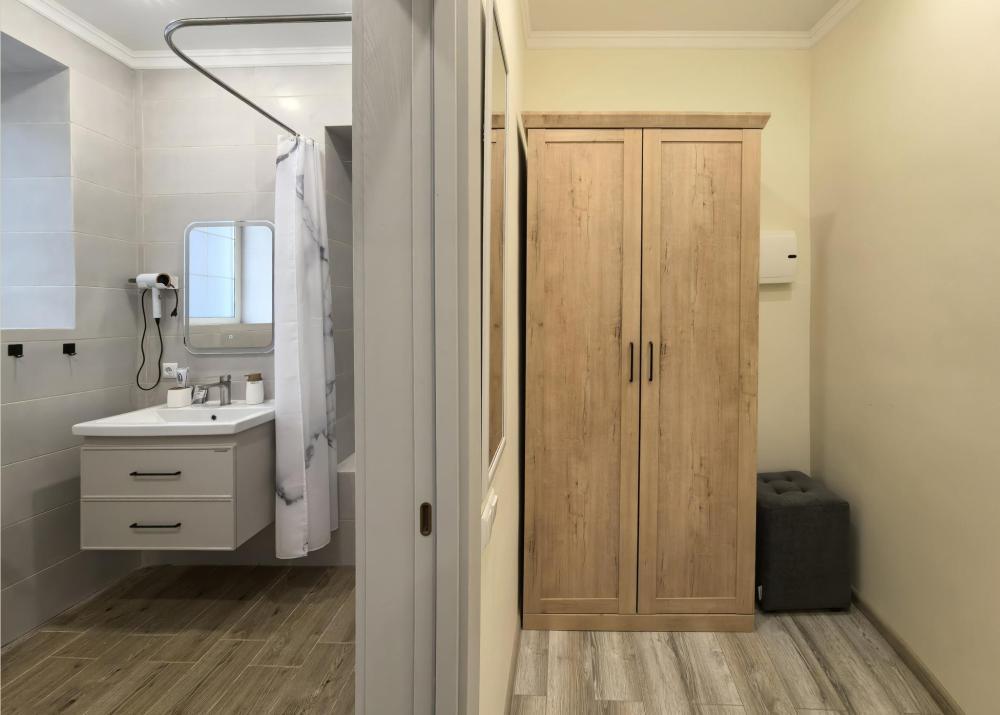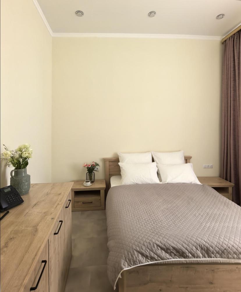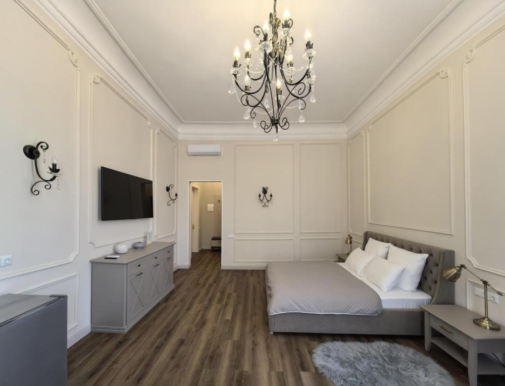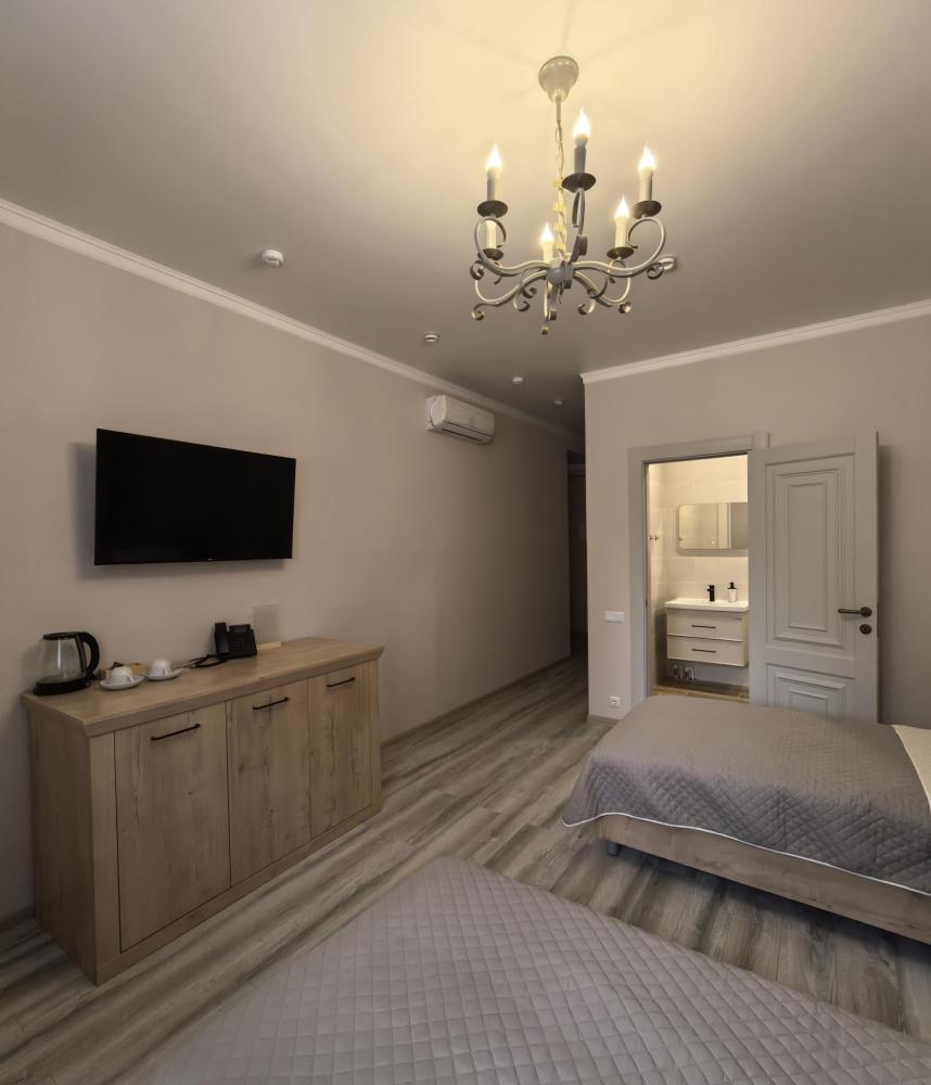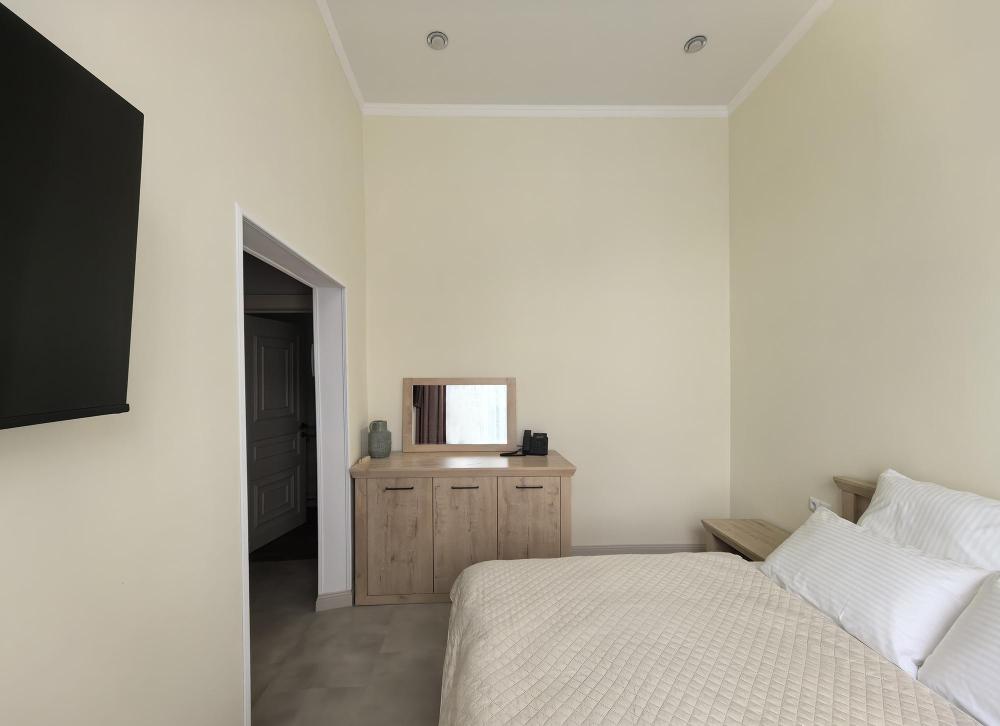 В номере двуспальная кровать. Функциональное наполнение номера : ТВ, Wi-Fi, кондиционер, чайник, комплект чашек, стаканов и бокалов, чайный набор, бутилированная питьевая вода негазированная. Ванная комната: набор полотенец, халаты, тапочки, фен, основные туалетные принадлежности: гель, шампунь, зубной набор.