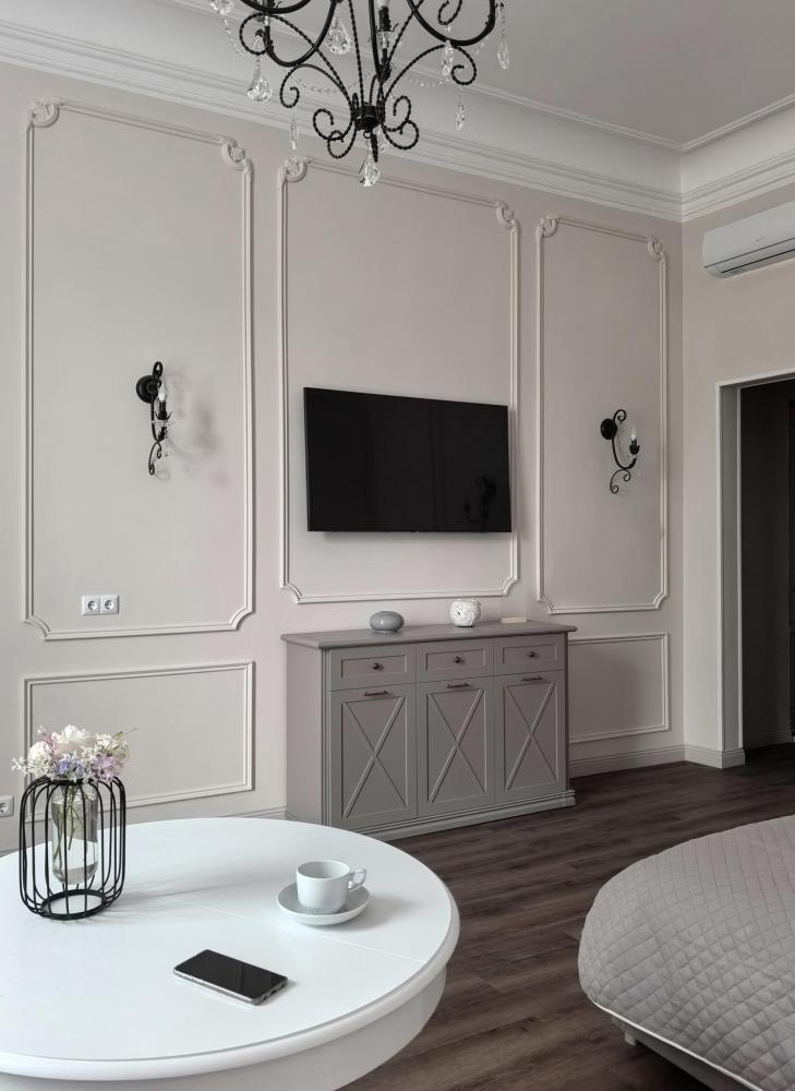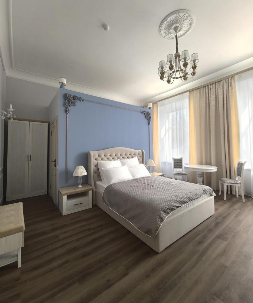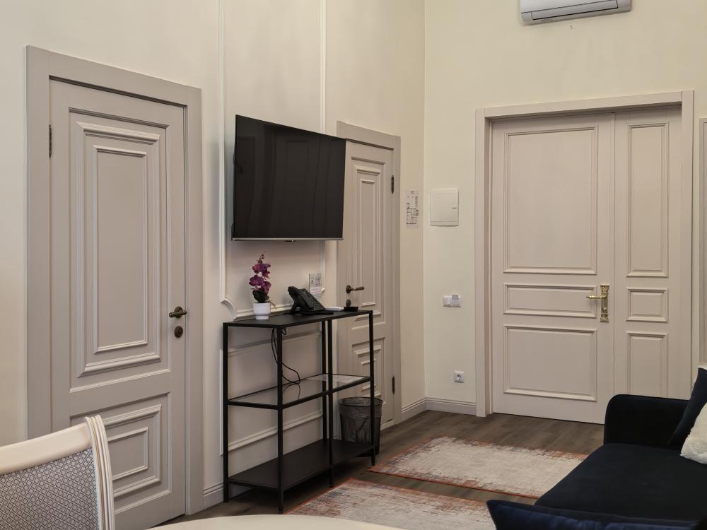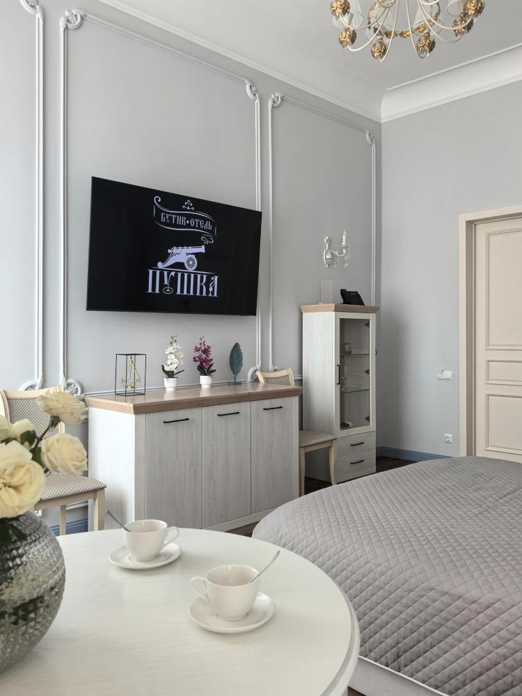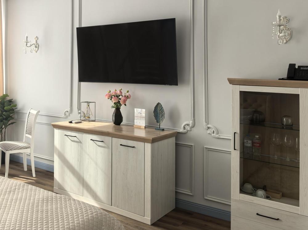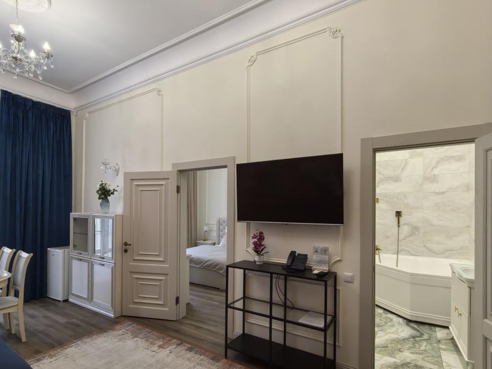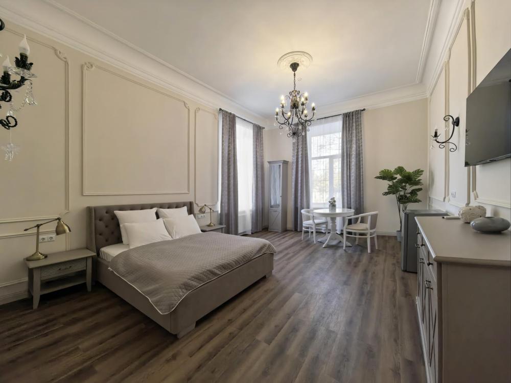 В номере двуспальная кровать и диван на два спальных места. Функциональное наполнение номера: ТВ, Wi-Fi, кондиционер, чайник, комплект чашек, стаканов и бокалов, чайный набор, бутилированная питьевая вода негазированная. Набор полотенец, халаты, тапочки, фен, основные туалетные принадлежности: гель, шампунь, зубной набор.